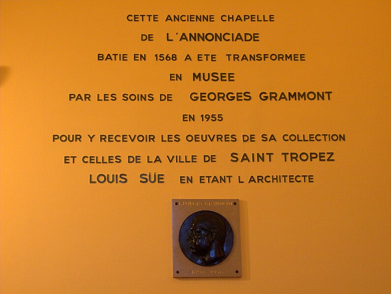 La chapelle des Pénitents blancs, dite Notre-Dame de l'Annonciade, à Saint-Tropez, a été édifiée vers 1510 par la confrérie des Pénitents blancs. Elle a été vendue comme bien national pendant la Révolution française. En 1821, l'édifice est devenu un atelier de construction marine : le clocher a été abattu et la toiture a pris sa forme actuelle. En 1937, la partie supérieure de la chapelle a été aménagée pour accueillir le « Museon Tropelen ». Georges Grammont, désireux de rendre accessibles les toiles et sculptures qu'il avait rassemblées, a demandé en 1950 à l'architecte Louis Süe de transformer le bâtiment, mis à sa disposition par la commune. Le musée de l'Annonciade a ouvert ses portes le 7 août 1955, présentant cinquante-six œuvres de la collection de Grammont. Le portail d'entrée a été inscrit au titre des Monuments historiques par arrêté du 30 mai 1947. L'ancienne chapelle, ainsi que le bâtiment de l'ancienne sacristie accolée à la façade nord, ont fait l'objet d'une inscription complémentaire par arrêté du 25 mai 2024. Des informations complémentaires sont disponibles sur des ressources en ligne comme Clochers de France, la base Mérimée et les portails consacrés à l'architecture chrétienne, au Var et aux monuments historiques français.