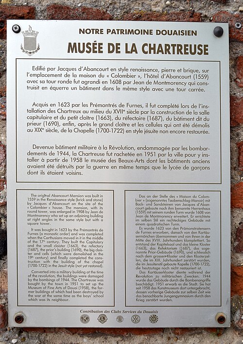 Le premier fonds du musée est constitué en 1792 à partir d'œuvres saisies dans les églises et les monastères ; ces pièces sont entreposées dans l'église des Dominicains et inventoriées par le peintre Charles-André Caullet. En 1802 un musée est créé rue Fortier, dans un ancien collège de Jésuites, et ouvre partiellement au public en lien avec la bibliothèque municipale. Au XIXe siècle les collections s'étoffent et couvrent les beaux-arts, les arts décoratifs, la musique, l'ethnographie européenne et extra-européenne, l'histoire naturelle, l'archéologie et l'histoire locale. Les beaux-arts et les arts décoratifs s'enrichissent par des dons et legs : en 1852 le sculpteur Théophile Bra fait don de son fonds d'atelier (statues, esquisses, dessins), en 1857 le docteur Escallier lègue 176 tableaux flamands et hollandais, Foucques de Wagnonville donne une collection rapportée d'Italie et Jean-Baptiste Fortier laisse des fonds permettant l'achat d'œuvres de Véronèse, Rubens et Courbet. Ces apports sont complétés par des acquisitions, des achats aux ventes, des récompenses aux salons des Amis des arts de Douai et des dépôts de l'État. Le musée subit des pertes majeures pendant les deux guerres mondiales : en 1918 ses collections sont largement pillées par l'armée allemande en retraite, et en août 1944 les bâtiments et les collections d'ethnographie et d'histoire naturelle sont détruits par un bombardement, provoquant la disparition de plusieurs dizaines de milliers de pièces. Après la Seconde Guerre mondiale, les collections restantes sont entreposées dans l'ancien couvent des Chartreux, transformé progressivement en musée classé et ouvert au public en 1958 sous le nom de Musée de la Chartreuse.