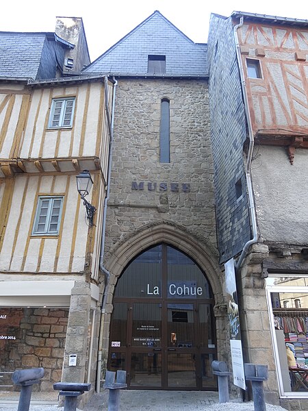 La porte Est de l’ancienne Cohue est ornée d’une archivolte en tiers-point aux dents de scie et de piédroits supportant des chapiteaux à fleurettes ; à côté du chapiteau droit, un chapiteau réemployé montre, aux angles visibles, une sirène aux longues nattes enserrant le motif et soutenant les branches de sa queue en croissant, séparée d’une seconde sirène par une tête de hibou. L’ensemble bâti remonte à plusieurs époques et est lié aux usages du marché et de la justice ; le premier texte localisant la Cohue date de 1416, mais l’observation du bâtiment révèle des parties antérieures au XIIe siècle. Au rez-de-chaussée, sous la salle haute, deux murs parallèles d’environ vingt mètres, distants d’environ sept mètres et limités à l’est par une reprise au pied de la double arcade, appartiennent à l’époque romane, de même que des murs côté sud donnant sur la rue des Halles et des contreforts romans du grand mur sud. Une campagne de travaux datable de la fin du XIIe ou du début du XIIIe siècle est attestée par les pierres de taille de la façade Est et par l’extension vers l’est, que Dégez suppose symétriquement doublée vers l’ouest. Au XIVe siècle, les murs centraux sont percés de quatre arcades en tiers-point, en vis-à-vis par paires ; l’arcade sud-ouest a été remplacée au XIXe siècle par une baie en plein cintre. L’étage a été élevé en deux phases : la plus ancienne, contemporaine des travaux du XIVe siècle, correspond à une petite salle rectangulaire mentionnée au XVIIe siècle comme salle du conseil, dont la cheminée et la disposition des pierres confirment la datation. La grande salle dite du Présidial, construite transversalement à la nef et aux bas-côtés, est attribuée au milieu du XVe siècle d’après ses murs pignons et ses fenêtres à coussièges ; toutefois, la restauration des années 1970 a mis au jour une première élévation en torchis et colombage, semblable au mur ouest de la salle du conseil construit en charpente et gros poteaux. En 1653, d’après les plaids généraux du Présidial, cette salle haute fut profondément modifiée par la construction de murs transversaux en maçonnerie remplaçant la structure initiale à colombage ; la charpente, initialement du XVe siècle, a été reprise à cette époque avec réemploi d’éléments antérieurs, probablement d’une charpente apparente à chevrons et fermes déjà signalée en 1636. Ces travaux comprenaient également la couverture des bas-côtés de la halle centrale, jusque-là ouverts. Les vestiges d’un escalier d’accès à la salle restent visibles dans le mur droit du vestibule, qui a conservé deux balustres plats encastrés ; la disposition en équerres de cet escalier apparaît sur un plan du XVIIIe siècle où cet accès est nommé « peron ». Pendant la Révolution, la Cohue servit de tribunal civil. Au XIXe siècle, la façade ouest fut entièrement remaniée en 1819 selon le plan d’alignement de 1787, et la création d’un « théâtre civique » après la Révolution entraîna la construction d’un escalier droit vers la rue des Halles pour l’entrée du théâtre. Les restaurations des années 1970 ont ajouté un escalier en béton côté ouest formant un second accès à la salle de l’étage et ont restitué des volumes intérieurs altérés par des aménagements successifs. Depuis le Moyen Âge la Cohue, terme d’origine bretonne désignant les halles, appartenait au duc de Bretagne ; sa partie la plus ancienne remonte au XIIIe siècle et l’édifice a été agrandi aux XIVe et XVIIe siècles. Située face à la cathédrale Saint-Pierre, la Cohue abritait au rez-de-chaussée le marché et des échoppes, tandis que l’étage accueillait le palais de la justice ducale jusqu’en 1796 ; à partir de 1675, le parlement de Bretagne exilé y tint séance, et les États de Bretagne s’y réunirent à dix reprises entre 1431 et 1703. Devenue propriété de la ville en 1813, la Cohue fut transformée en théâtre actif jusque dans les années 1950, puis restaurée à partir de 1970. Depuis 1982, le bâtiment abrite le musée des Beaux-Arts de Vannes, dit musée de la Cohue ; il est inscrit au titre des monuments historiques depuis 1929 et le musée est labellisé « Musée de France ». Les collections municipales exposées comprennent des peintures du XIXe et XXe siècles, avec notamment un espace permanent consacré à Geneviève Asse depuis 2013, ainsi que des œuvres de Delacroix, Joseph-Félix Bouchor, Jean Frélaut, Henry Moret, Jules Noël, Flavien-Louis Peslin et d’autres peintres. Le musée conserve aussi un ensemble de sculptures en bois polychrome des XIVe et XVIe siècles, des pièces d’orfèvrerie et des meubles du XVIIIe siècle, des objets d’art décoratif et un fonds d’estampes des XIXe et XXe siècles, dont dix-huit estampes de Jean Urvoy. Depuis 1982, ses expositions temporaires explorent la création plastique contemporaine en présentant notamment des artistes comme Pierre Buraglio, Olivier Debré, François Morellet, Aurélie Nemours et Jean-Pierre Pincemin.