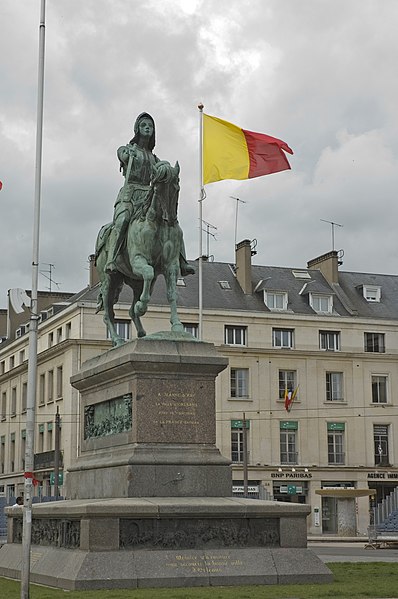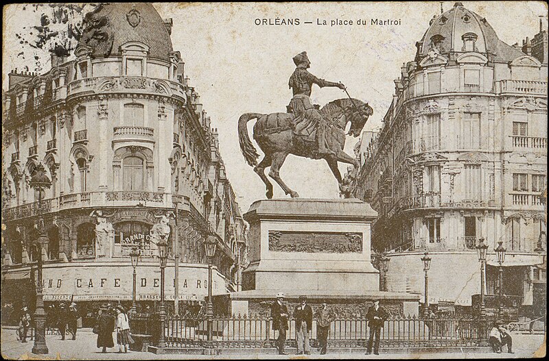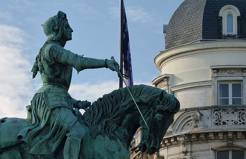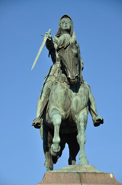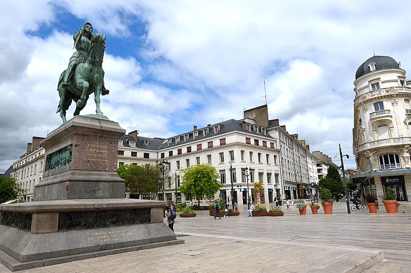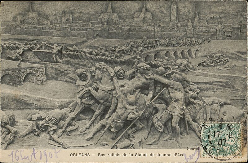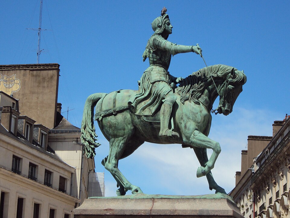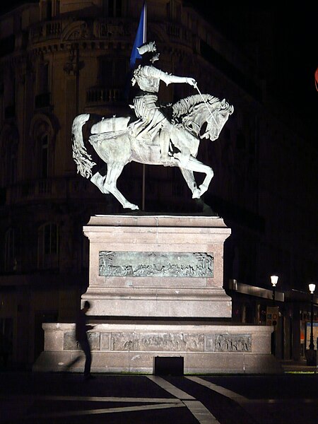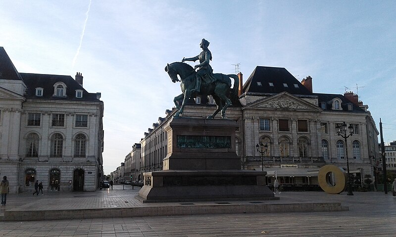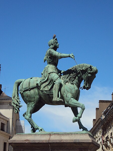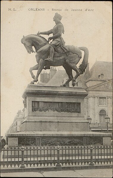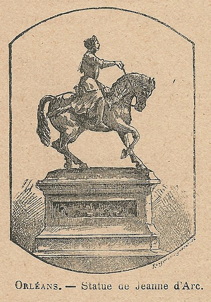 La statue équestre de Jeanne d'Arc, place du Martroi à Orléans, est une œuvre en bronze du sculpteur Denis Foyatier réalisée en 1855. Majestueuse, elle représente Jeanne d'Arc en chef de guerre, l'épée levée, juchée sur son cheval et incarnant détermination et courage. Fondue à partir du bronze de neuf canons, la statue a été inaugurée le 8 mai lors des Fêtes Johanniques d'Orléans. Elle remplaça une première statue d'Edme-François-Étienne Gois, jugée trop modeste au regard des attentes du XIXe siècle. L'installation du monument fut marquée par un différend entre Foyatier et la municipalité au sujet des bas-reliefs du piédestal, qui furent finalement confiés à Vital Gabriel Dubray en 1859 et achevés en 1861. Ces dix reliefs ornaient la partie basse du socle et illustraient des scènes de la vie de Jeanne d'Arc et de la Libération d'Orléans. La statue subit d'importants dégâts en 1944, lors de la libération de la ville, des éclats d'obus endommageant le piédestal et brisant notamment l'épée. Une campagne de restauration fut menée en 1950 grâce à la mobilisation d'Orléans, à une souscription de La Nouvelle-Orléans (Louisiane) et à la participation financière de l'armée américaine pour la confection d'une nouvelle épée. Le monument repose sur un imposant socle en granit doté d'un emmarchement qui renforce sa solennité. Par souci de conservation, les dix reliefs originaux de Dubray ont été déposés en 1988 au Musée des Beaux-Arts d'Orléans et remplacés sur le piédestal par des moulages en résine afin de préserver l'aspect visuel du monument. L'ensemble a été inscrit au titre des Monuments historiques par arrêté du 20 novembre 2017, la protection couvrant le site et le domaine public non cadastré où il se dresse. La statue demeure un élément central du patrimoine orléanais, à la fois historique et mémoriel.
