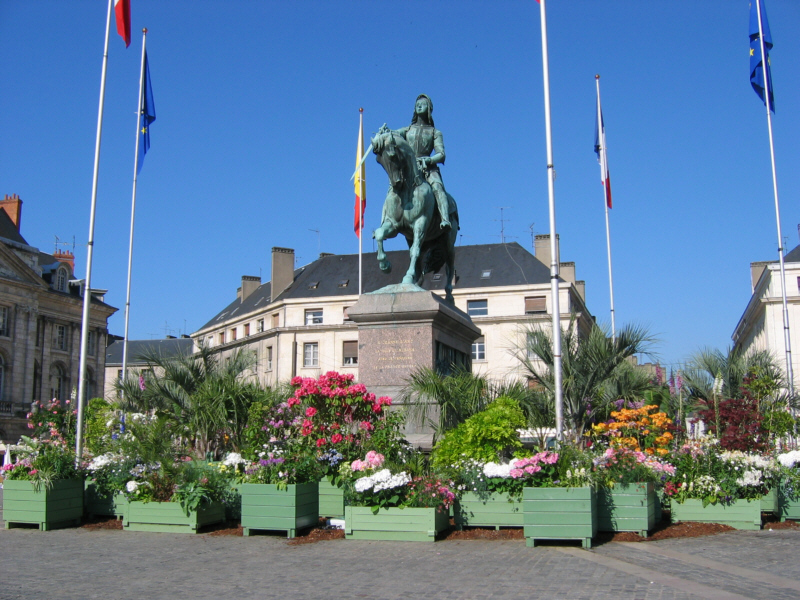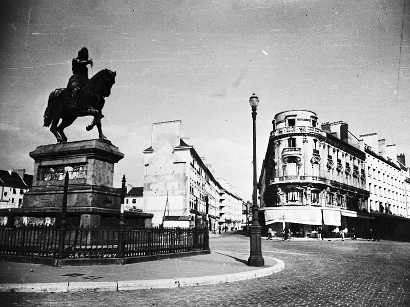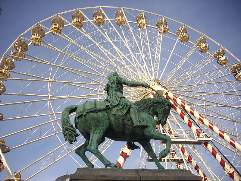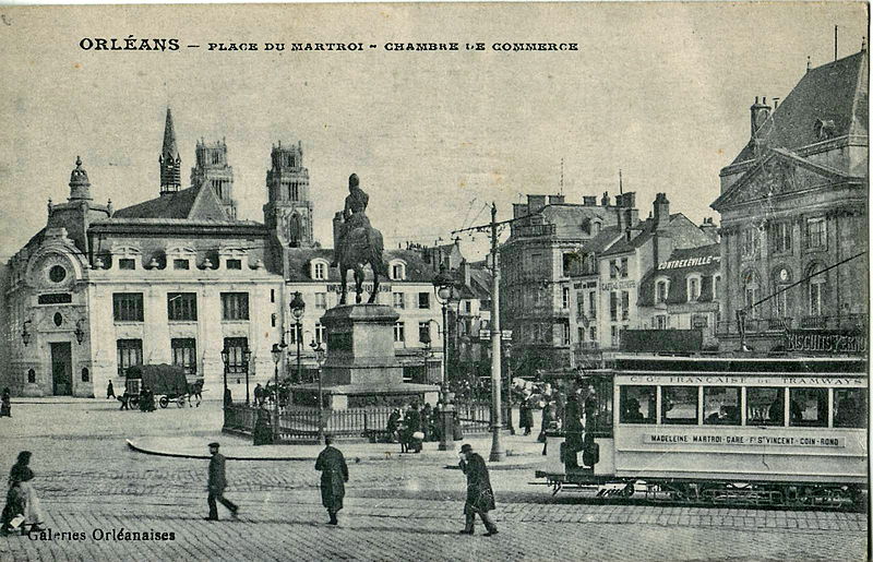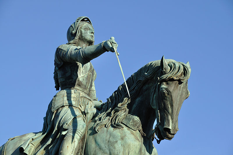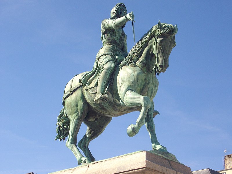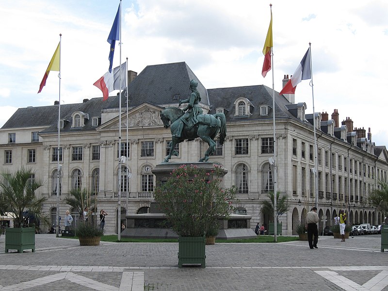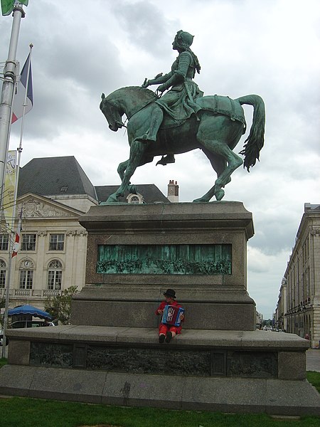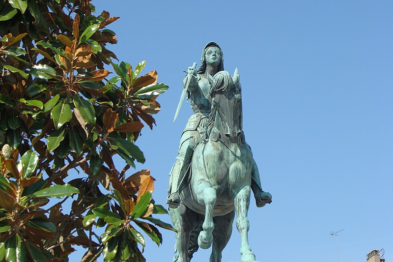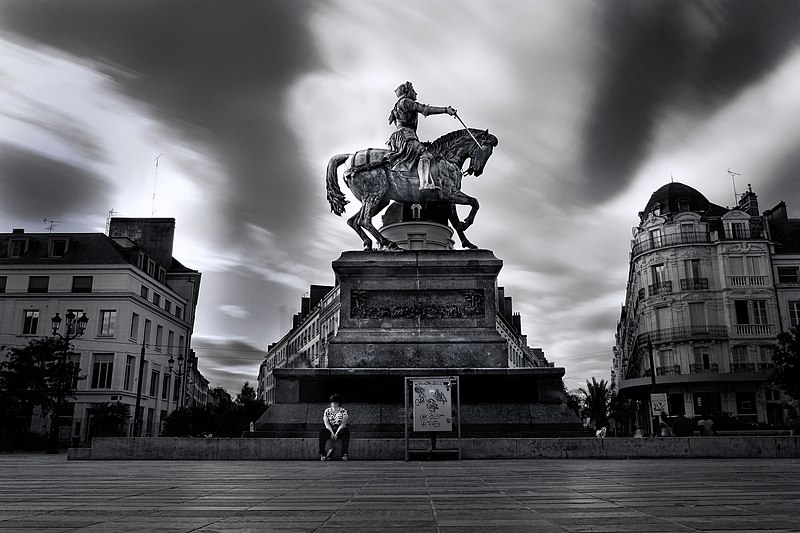 La statue équestre de Jeanne d'Arc, place du Martroi à Orléans, est une œuvre en bronze du sculpteur Denis Foyatier réalisée en 1855. Majestueuse, elle représente Jeanne d'Arc en chef de guerre, l'épée levée, juchée sur son cheval et incarnant détermination et courage. Fondue à partir du bronze de neuf canons, la statue a été inaugurée le 8 mai lors des Fêtes Johanniques d'Orléans. Elle remplaça une première statue d'Edme-François-Étienne Gois, jugée trop modeste au regard des attentes du XIXe siècle. L'installation du monument fut marquée par un différend entre Foyatier et la municipalité au sujet des bas-reliefs du piédestal, qui furent finalement confiés à Vital Gabriel Dubray en 1859 et achevés en 1861. Ces dix reliefs ornaient la partie basse du socle et illustraient des scènes de la vie de Jeanne d'Arc et de la Libération d'Orléans. La statue subit d'importants dégâts en 1944, lors de la libération de la ville, des éclats d'obus endommageant le piédestal et brisant notamment l'épée. Une campagne de restauration fut menée en 1950 grâce à la mobilisation d'Orléans, à une souscription de La Nouvelle-Orléans (Louisiane) et à la participation financière de l'armée américaine pour la confection d'une nouvelle épée. Le monument repose sur un imposant socle en granit doté d'un emmarchement qui renforce sa solennité. Par souci de conservation, les dix reliefs originaux de Dubray ont été déposés en 1988 au Musée des Beaux-Arts d'Orléans et remplacés sur le piédestal par des moulages en résine afin de préserver l'aspect visuel du monument. L'ensemble a été inscrit au titre des Monuments historiques par arrêté du 20 novembre 2017, la protection couvrant le site et le domaine public non cadastré où il se dresse. La statue demeure un élément central du patrimoine orléanais, à la fois historique et mémoriel.