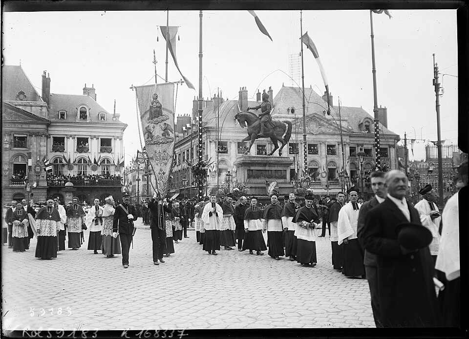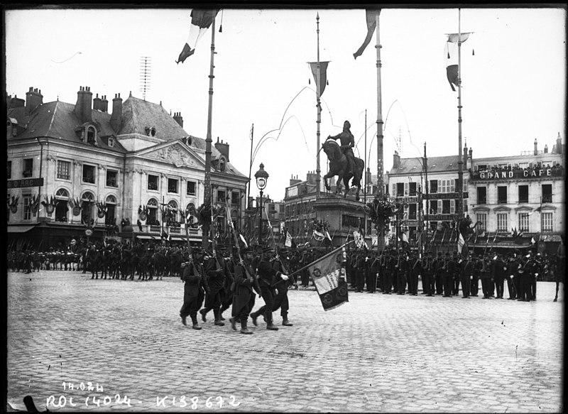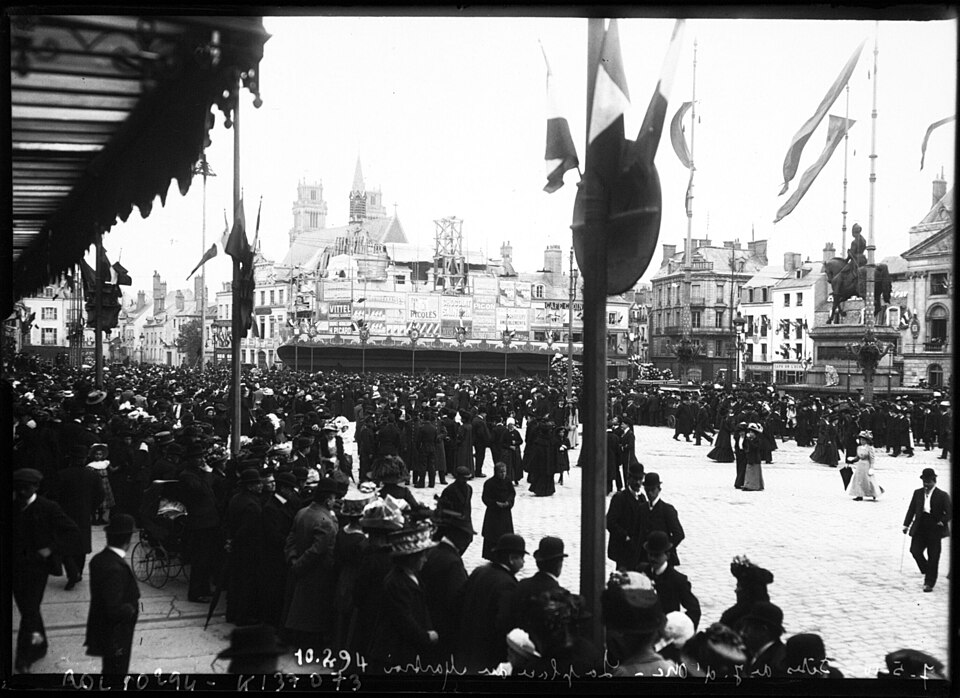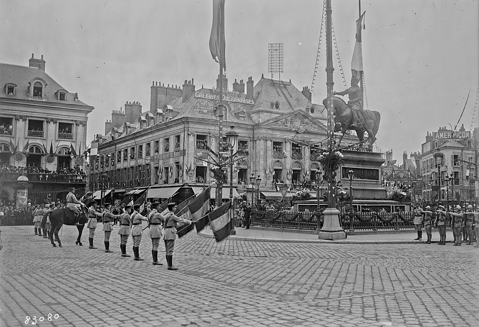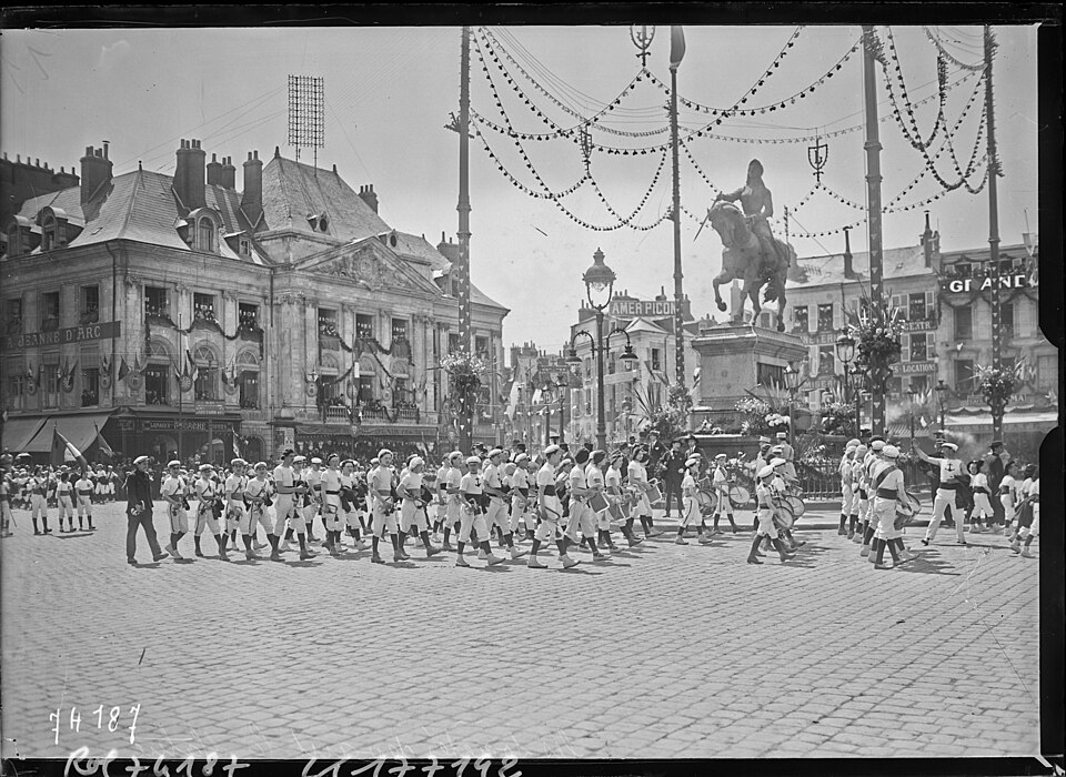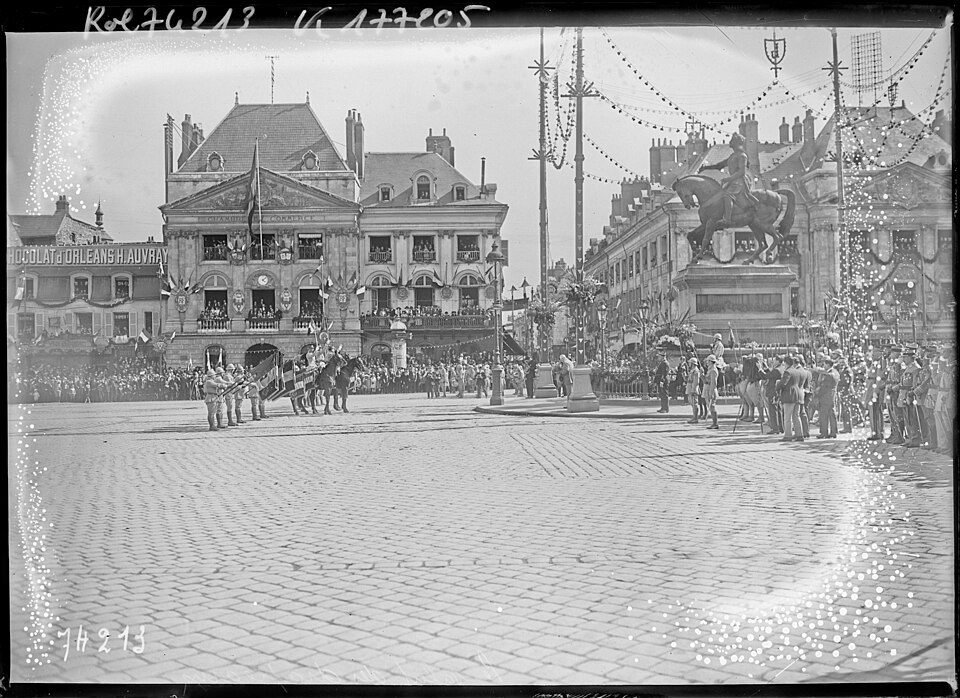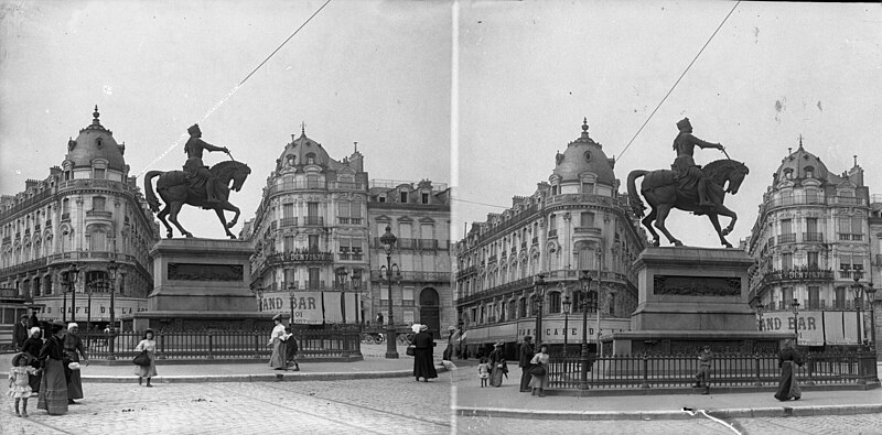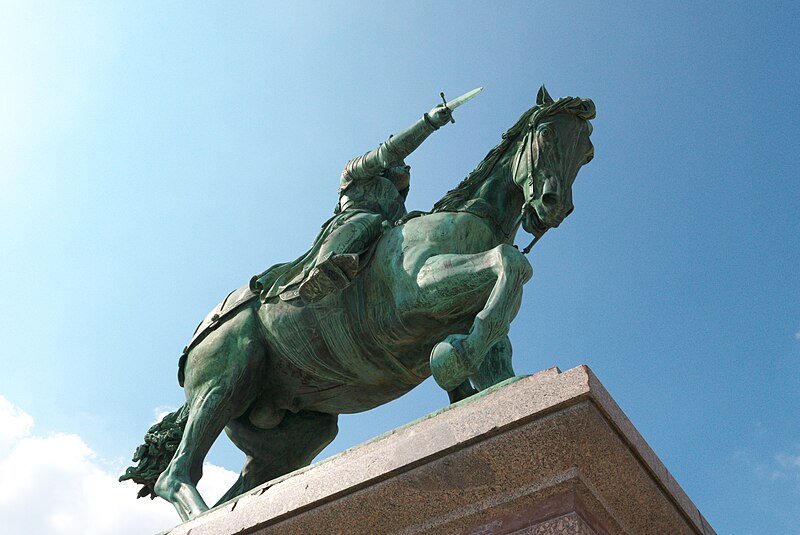 La statue équestre de Jeanne d'Arc, place du Martroi à Orléans, est une œuvre en bronze du sculpteur Denis Foyatier réalisée en 1855. Majestueuse, elle représente Jeanne d'Arc en chef de guerre, l'épée levée, juchée sur son cheval et incarnant détermination et courage. Fondue à partir du bronze de neuf canons, la statue a été inaugurée le 8 mai lors des Fêtes Johanniques d'Orléans. Elle remplaça une première statue d'Edme-François-Étienne Gois, jugée trop modeste au regard des attentes du XIXe siècle. L'installation du monument fut marquée par un différend entre Foyatier et la municipalité au sujet des bas-reliefs du piédestal, qui furent finalement confiés à Vital Gabriel Dubray en 1859 et achevés en 1861. Ces dix reliefs ornaient la partie basse du socle et illustraient des scènes de la vie de Jeanne d'Arc et de la Libération d'Orléans. La statue subit d'importants dégâts en 1944, lors de la libération de la ville, des éclats d'obus endommageant le piédestal et brisant notamment l'épée. Une campagne de restauration fut menée en 1950 grâce à la mobilisation d'Orléans, à une souscription de La Nouvelle-Orléans (Louisiane) et à la participation financière de l'armée américaine pour la confection d'une nouvelle épée. Le monument repose sur un imposant socle en granit doté d'un emmarchement qui renforce sa solennité. Par souci de conservation, les dix reliefs originaux de Dubray ont été déposés en 1988 au Musée des Beaux-Arts d'Orléans et remplacés sur le piédestal par des moulages en résine afin de préserver l'aspect visuel du monument. L'ensemble a été inscrit au titre des Monuments historiques par arrêté du 20 novembre 2017, la protection couvrant le site et le domaine public non cadastré où il se dresse. La statue demeure un élément central du patrimoine orléanais, à la fois historique et mémoriel.