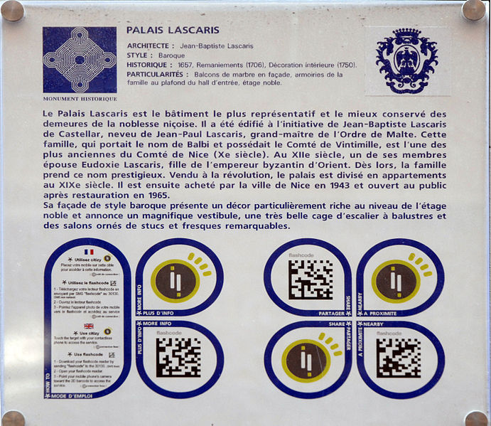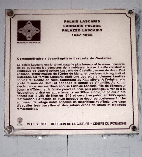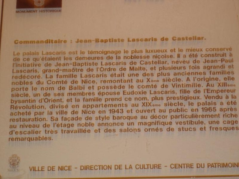 Le palais Lascaris est une ancienne demeure aristocratique de Nice, construite par la famille Lascaris de Vintimille dans la première moitié du XVIIe siècle et située au cœur du Vieux-Nice. De style baroque dit génois, son architecture est attribuée à des auteurs inconnus faute de sources documentaires. La mairie de Nice indique que le palais abrite aujourd'hui un musée des instruments de musique anciens rassemblant environ 500 pièces, la deuxième collection la plus importante en France. Propriété des Lascaris de Vintimille jusqu'en 1802, le bâtiment est tombé en décrépitude au début du XXe siècle avant d'être acquis par la ville de Nice en 1942 pour y installer un musée des arts et traditions populaires régionaux. Classé au titre des monuments historiques le 15 février 1946, il a fait l'objet d'une réhabilitation de 1963 à 1970, année de son ouverture définitive au public. En 2001, les collections instrumentales de la ville, jusqu'alors au musée Masséna, ont été transférées au palais et l'exposition permanente des instruments a été inaugurée en 2011. Intégré au tissu urbain ancien, le palais présente en façade une ornementation riche mettant en valeur fenêtres et balcons à balustres de marbre blanc. Dès l'entrée, un vaste vestibule voûté d'arêtes, peint de motifs aux tons vigoureux, produit un fort effet visuel. Un escalier monumental, fermé par des galeries d'arcades et décoré de statues, mène aux salles du premier étage consacrées aux expositions temporaires. L'étage noble conserve ses appartements d'apparat et leurs décors plafonnants peints à la fresque au milieu du XVIIe siècle ; le mobilier d'apparat date des XVIIe et XVIIIe siècles, tandis que les statues et le décor rocaille des salons furent ajoutés au XVIIIe siècle. Tapisseries flamandes et d'Aubusson ornent les murs, et de nombreux tableaux à thèmes religieux évoquent l'influence de l'ordre de Saint‑Jean de Jérusalem ; reliquaires et objets de dévotion témoignent de l'héritage de la famille Lascaris‑Vintimille. Le palais consacre aujourd'hui ses espaces d'exposition à la présentation permanente de la collection d'instruments de musique anciens issue du legs du notable niçois Antoine Gautier. Le legs d'Antoine Gautier, né à Nice en 1825, a pris effet en 1904 et comprenait plus de 225 instruments ainsi qu'une bibliothèque musicale, avec une dotation destinée à l'entretien des instruments. Musicien amateur et fondateur d'un quatuor familial, Gautier avait rassemblé dans son salon de la rue Papacino une importante collection et reçu des artistes tels que Jacques Thibaud, Eugène Ysaÿe et Gabriel Fauré. Depuis ce legs, la Ville de Nice a enrichi la collection, exposée successivement au musée des beaux-arts, au musée Masséna, au conservatoire, puis au palais Lascaris. La collection comporte des pièces remarquables : une sacqueboute ténor d'Anton Schnitzer (Nuremberg, 1581), des violes d'amour et des violes de gambe de divers luthiers, et une basse de violon de Paolo Antonio Testore (Milan, 1696). Elle comprend également plusieurs guitares baroques rares, des flûtes à bec et un clavecin anonyme du XVIIIe siècle, de nombreuses harpes — dont des prototypes de Sébastien Érard et une harpe de Naderman (Paris, 1780) — ainsi qu'un ensemble rare de clarinettes et des instruments à cordes expérimentaux. On y trouve aussi plusieurs instruments d'Adolphe Sax, des instruments à clavier français du XVIIIe au XXe siècle, dont un piano Pleyel (Paris, 1863), une guitare en état de jeu d'Antonio de Torres (Almeria, 1884), de nombreux instruments de facture méridionale, une cinquantaine d'instruments extra-européens issus du legs Gautier et un ensemble d'instruments de jazz comprenant un saxophone Grafton des années 1950. En 2009, le groupe AXA a déposé au palais le fonds Gaveau‑Érard‑Pleyel, présenté au public dans deux expositions en 2011 et 2012, et l'Institut de France a déposé en 2013 la collection Tissier‑Grandpierre (66 instruments, dont 18 harpes anciennes). La collection instrumentale du palais Lascaris participe au projet MIMO (Musical Instrument Museums Online) et ses notices sont accessibles sur le site Europeana.