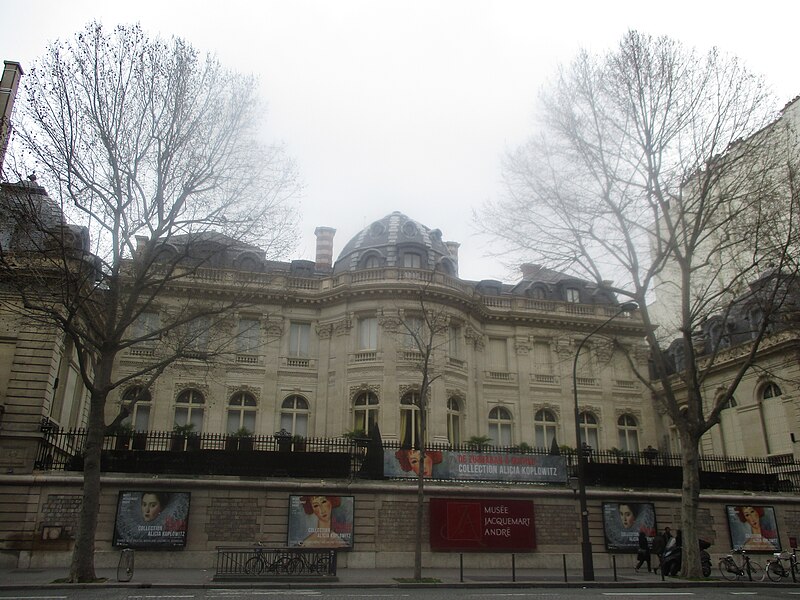 Le musée Jacquemart-André, musée de beaux-arts et d'arts décoratifs, est situé au 158 boulevard Haussmann dans le 8e arrondissement de Paris ; il appartient à l'Institut de France et sa gestion a été confiée à la société Culturespaces dans les années 1990, qui assure la valorisation des espaces, les expositions temporaires, l'accueil des visiteurs, la communication ainsi que l'exploitation du salon de thé et de la boutique. À l'origine demeure privée de grands bourgeois, l'hôtel particulier fut édifié sur commande d'Édouard André, qui fit appel à l'architecte Henri Parent pour construire ce second hôtel entre 1869 et 1875 sur un terrain de 5 700 m2 acquis pour 1 520 000 francs ; il était destiné aux réceptions et doté des commodités modernes dans un décor théâtral. Installé depuis 1864 avec sa collection à l'hôtel de Saint‑Paul, Édouard André prit des responsabilités dans le monde des arts en rachetant la Gazette des Beaux‑Arts et en dirigeant l'Union centrale des arts décoratifs, et il conçut un fonds consacré notamment aux tableaux, sculptures, tapisseries et objets d'art du XVIIIe siècle. En 1881, son mariage avec la peintre Nélie Jacquemart fit naître une collaboration dans les acquisitions et l'aménagement de la demeure ; Nélie se consacra particulièrement à la peinture italienne, des primitifs des XIVe et XVe siècles à la Renaissance ; selon le texte, cela correspond à 124 des 137 tableaux italiens de la collection. À la mort d'Édouard André, Nélie acheva le projet muséal et décida de léguer l'hôtel et les collections à l'Institut de France à la condition qu'ils soient ouverts au public ; son legs réunit également la collection de l'abbaye de Chaalis. Le legs prit effet en 1913 et, depuis cette date, l'Institut de France et la Fondation Jacquemart‑André veillent à la conservation et à la mise en valeur du patrimoine en maintenant la disposition et le mobilier d'origine, selon un « accrochage archéologique ». Le musée fut inauguré officiellement le 8 décembre 1913 par le président de la République Raymond Poincaré. Une campagne de restauration menée à partir de l'automne 2023 a permis, entre autres, de restaurer la fresque de Tiepolo ainsi que les marbres et les bronzes de l'escalier. Parmi les conservateurs qui se sont succédé figurent Émile Bertaux, Pierre de Nolhac, Lucien Simon, Robert Poughéon, Jean‑Gabriel Domergue, Julien Cain, René Huyghe, Nicolas Sainte‑Fare‑Garnot et Pierre Curie, avec quelques intérims comme Pierre Clamorgan et Arnaud Doria. L'hôtel particulier présente une façade sur le boulevard Haussmann encadrée par deux pavillons et rythmée de pilastres, avec un avant‑corps central arrondi inspiré du Petit Trianon ; une haute terrasse domine un soubassement percé de deux portes cochères, dont l'une ouvre sur la cour d'honneur. Cette cour est fermée par un mur en hémicycle traversé d'arcatures aveugles et d'une arche qui donnait accès à des installations fonctionnelles — manège, sellerie, écuries pour quatorze chevaux et remise pour treize voitures — et comportait des accès secondaires par la rue de Courcelles et l'impasse Émery. La façade principale sur la cour comporte un avant‑corps à baies en plein cintre orné de colonnes ioniques ; l'entrée se marque par un escalier flanqué de deux lions assis et de lampadaires, tandis que les niveaux latéraux s'organisent en travées rectangulaires surmontées d'une corniche et d'une balustrade ornée de vases en pierre. Au centre de l'élévation se détache une très grande fenêtre d'atelier surmontée d'un fronton triangulaire, élément caractéristique de l'aménagement du musée. L'intérieur conserve les salons de réception et les espaces privés d'origine : vestibule, Salon des Peintures, Grand Salon, Salon des Tapisseries, cabinet de travail, boudoir, bibliothèque, salon de musique, jardin d'hiver et escalier d'honneur ponctué par la fresque de Tiepolo, ainsi que le fumoir et la galerie des musiciens. Le musée italien comprend plusieurs salles thématiques (salle des sculptures, salle florentine, salle vénitienne) et les appartements conservent des pièces comme la chambre de Madame, l'antichambre et la chambre de Monsieur ; l'ancienne salle à manger sert désormais de restaurant. Les collections réunissent principalement des peintures italiennes et françaises, ainsi que des œuvres hollandaises, flamandes et anglaises, des sculptures, du mobilier et des objets d'art ; on y reconnaît des noms majeurs tels que Giovanni Bellini, Botticelli, Mantegna, Donatello, Canaletto, Carpaccio, Le Pérugin, Rembrandt, Van Dyck, Frans Hals, Chardin, David, Fragonard, Boucher, Reynolds, Tiepolo, Uccello, Signorelli, Jacob van Ruisdael et Hubert Robert, ainsi qu'un livre d'heures de Jean de Boucicaut. Le musée organise régulièrement des expositions temporaires et a présenté de nombreuses manifestations consacrées à des artistes et collections comme Fragonard, Van Dyck, Fra Angelico, Canaletto, Rembrandt, Mary Cassatt, le Caravage, Turner, Botticelli, la galerie Borghèse ou la collection Alana. Enfin, le Jacquemart‑André a servi de décor à plusieurs films, dont La Traversée de Paris, Gigi, La Porteuse de pain, Fedora et La Vengeance de Monte‑Cristo.