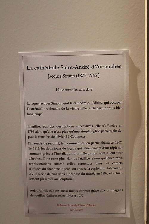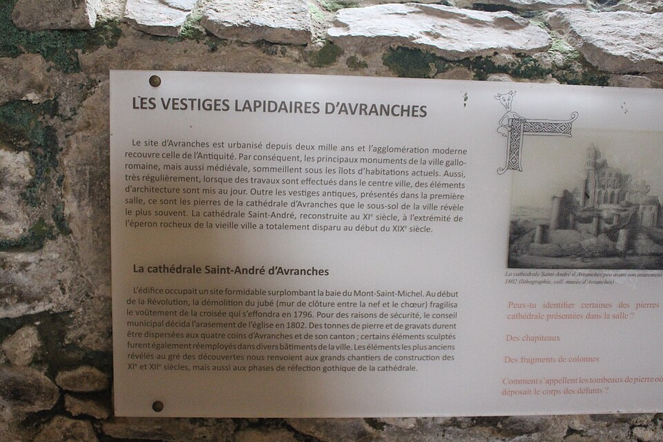 Le Musée municipal de l'Avranchin a connu plusieurs implantations successives. Le premier musée, créé en 1835 par la société locale d'archéologie, était installé dans l'ancien évêché mais fut anéanti par un incendie en 1899. Un second musée, réinstallé dans l'ancien couvent des Capucins, disparaît sous les bombardements de 1944. Depuis 1963, le musée occupe les locaux désaffectés de la prison et de la gendarmerie, anciennes dépendances de l'évêché. Ses collections couvrent l'archéologie, les arts décoratifs, les beaux-arts, l'histoire et l'ethnologie, avec des pièces liées à l'Afrique et à l'Océanie.