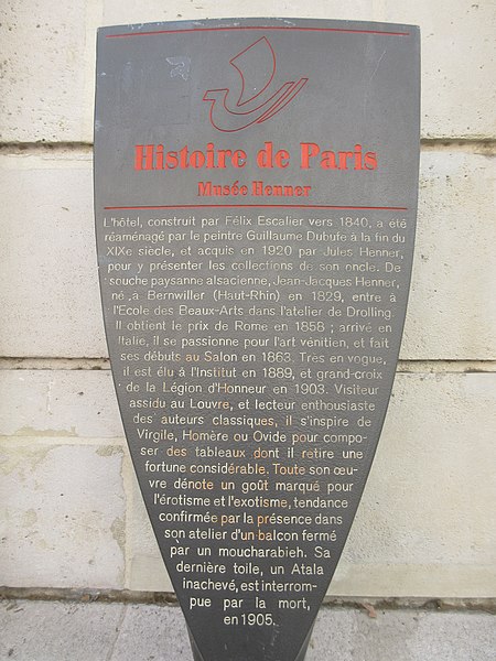 Le musée Henner est installé dans un hôtel particulier représentant l'architecture privée sous la IIIe République. Cet hôtel fut la demeure et l'atelier du peintre Guillaume Dubufe, qui l'acheta en 1878. En 1921, Marie Henner, veuve du neveu de Jean-Jacques Henner, acquiert le bâtiment aux héritiers de Dubufe pour y présenter les œuvres de son oncle qu'elle souhaite donner à l'État. Dans les années qui suivent, l'architecte Marcel Legendre dirige d'importants travaux, notamment dans les espaces de réception du rez-de-chaussée : il ouvre le salon néo-Renaissance sur le jardin d'hiver par une colonnade en stuc, d'où le nom actuel de « salon aux colonnes », et recouvre la mosaïque d'origine d'une dalle de béton. Le musée ouvre au public en 1924 et Many Benner, ancien élève et fils d'un ami du peintre, en devient le premier conservateur.