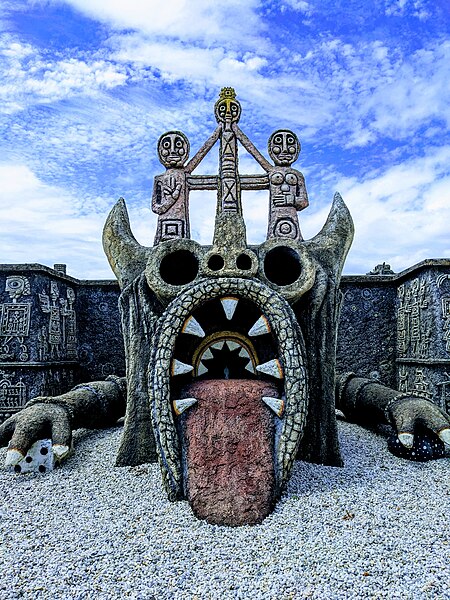 Le totem d'André Breton, partagé en deux parties, oppose le rêve, figuré par un oiseau jaillissant de la bouche, à une figure entravée qui matérialise la tension entre imaginaire et réalité. Le totem du verbe Être, placé face au verbe Avoir, montre des poches renversées, des mains ouvertes, un visage aux oreilles surdimensionnées et l'ouroboros, symbole du cycle éternel. Le totem d'Ubu roi, inspiré de la pièce d'Alfred Jarry, figure un personnage aux oreilles bouchées assis sur un dé truqué, image critique de l'ego et de l'autoritarisme. Le totem du Maître Compagnon rappelle la période où Tatin travailla dans la construction ; il représente un homme coiffé d'un chapeau et d'une cape portant une pierre taillée qui symbolise la maîtrise du travail de la pierre. Le totem Picasso montre une double présence masculine et féminine réunie en un visage unique coiffé de la colombe de la paix, illustrant la dualité créatrice. Le totem Paul Gauguin évoque l'artiste voyageur et représente Gauguin tenant sa muse par les pieds. Le totem Seurat rend hommage au père du pointillisme et à sa recherche de luminosité par la juxtaposition de points.