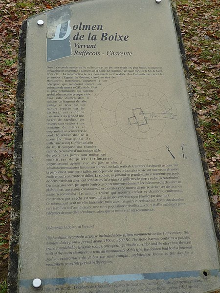 La nécropole de la Boixe est un ensemble de onze tumulus situés sur les communes de Vervant, Maine‑de‑Boixe et Cellettes, en Charente. La première mention figure dans la Statistique monumentale de la Charente ; Gustave Chauvet et Auguste‑François Lièvre ont décrit les fouilles menées entre 1874 et 1876 et ont désigné les tumuli encore visibles par les lettres de A à K, précisant qu'à l'origine la nécropole comprenait une quinzaine de monuments dont certains furent démantelés pour récupérer des pierres. Le dolmen B a été classé monument historique (liste de 1889, arrêté du 11 mai 1971) et la nécropole a été inscrite par arrêté du 22 avril 1991.