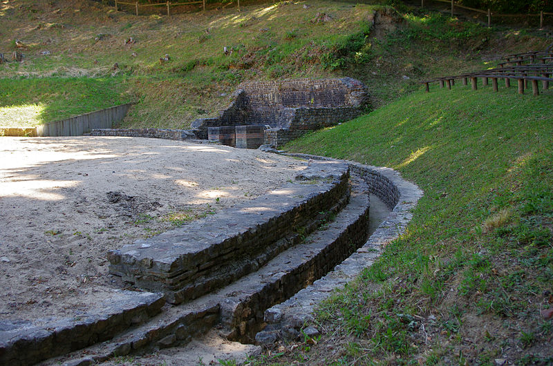 L'arène elliptique mesure 43,60 sur 38,55 mètres et est entourée d'un mur-podium interrompu pour ménager des passages ; derrière ce mur, un couloir de circulation est encadré par deux murs curvilignes. Ces murs délimitent un espace à la base de la cavea où un euripe a été creusé pour évacuer les eaux de ruissellement et servent de support à un plancher qui porte les gradins réservés aux notables. Deux loges ouvrant sur le couloir, interprétées comme locaux de service ou carceres, complètent l'organisation fonctionnelle de l'édifice. L'appareil des murs, l'euripe et les aménagements de circulation restent des témoins visibles de la conception de ce théâtre-amphithéâtre.