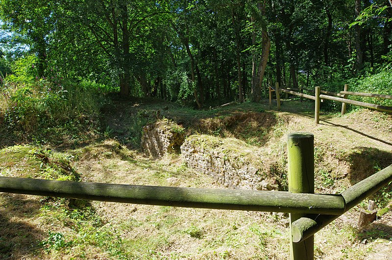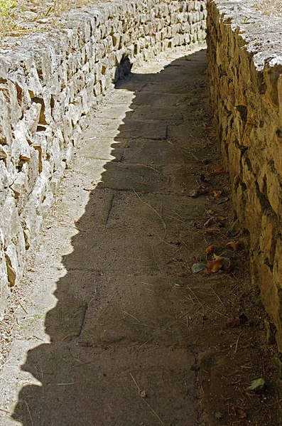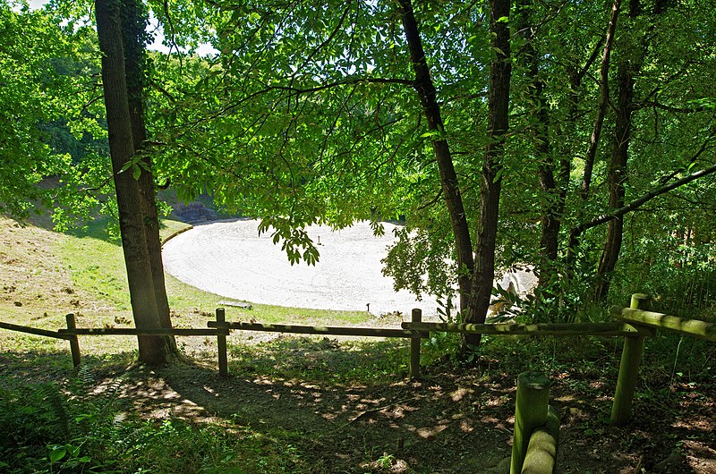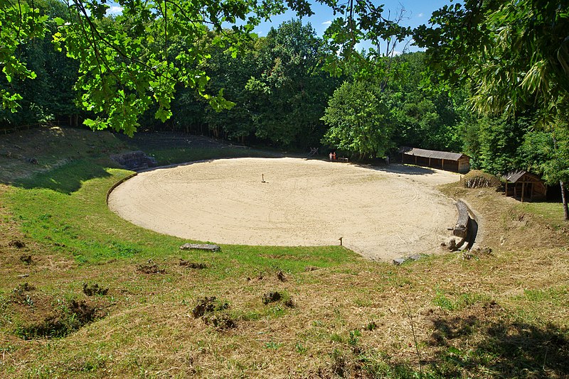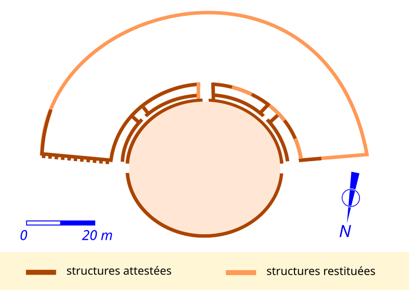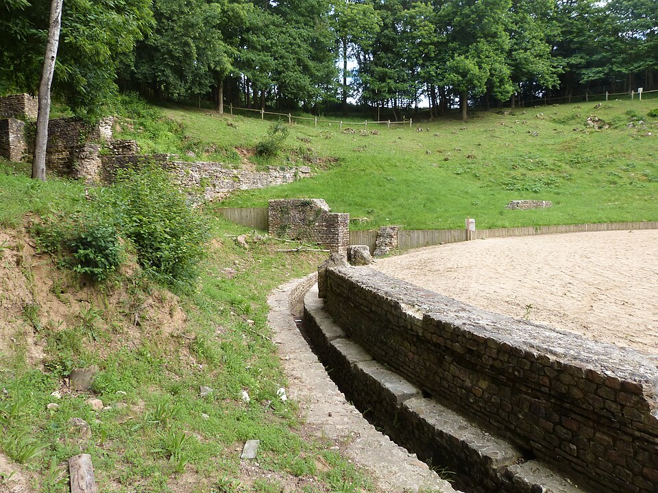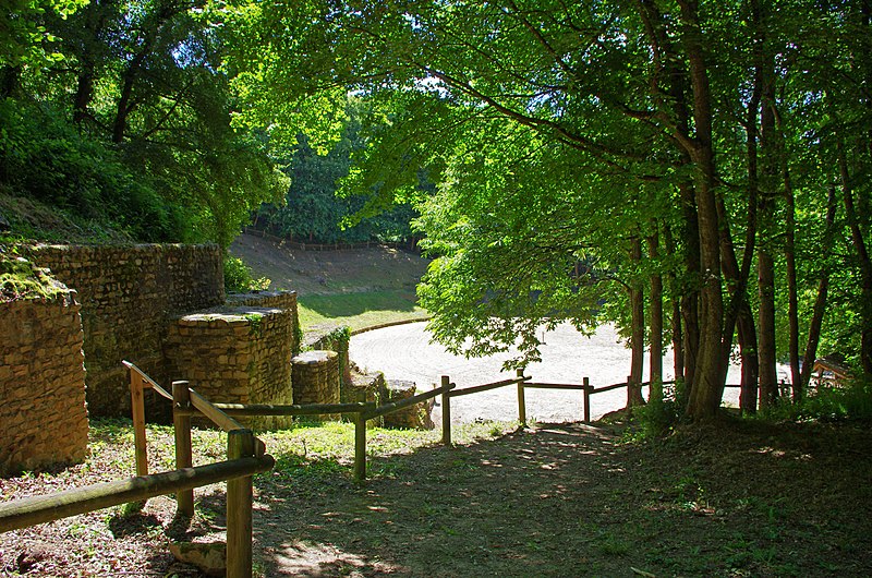La cavea, qui ne forme pas tout à fait un demi-cercle comme celle du site de Montbouy, présente un diamètre de 94 mètres et une capacité estimée à 5 000 personnes. Près de l'arène, certains gradins semblent avoir été aménagés pour les notables avec des assises de pierre, tandis que le reste de la cavea repose sur une pente de terre retenue par un contrefort à l'arrière et devait recevoir des gradins en bois dont des clous ont été retrouvés. La forte poussée des remblais est compensée par des contreforts appuyés sur le mur limitant la cavea, visibles dans la partie orientale du site.