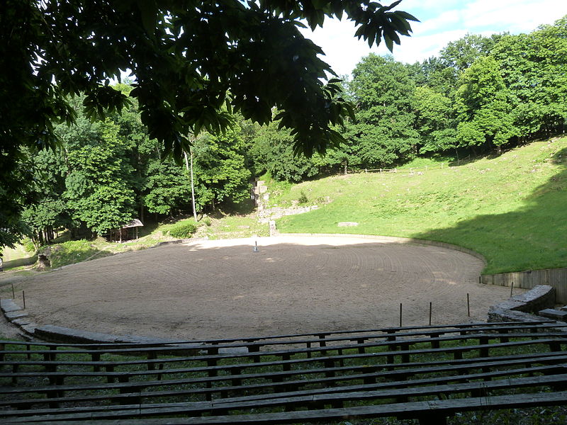 Le plan associe une arène elliptique complète, propre aux amphithéâtres, et une cavea incomplète qui n'occupe qu'environ la moitié du périmètre, caractéristique des théâtres ; ce type mixte, fréquent en Gaule et surtout dans des agglomérations secondaires ou des ensembles ruraux, permettait d'accueillir des spectacles de nature diverse. Implanté sur le flanc d'un vallon qui descend vers le ruisseau d'Avort, le monument tire parti de la topographie pour limiter le gros-œuvre et bénéficie d'une orientation qui évite l'éblouissement des spectateurs, conformément aux prescriptions de Vitruve.