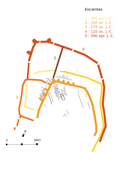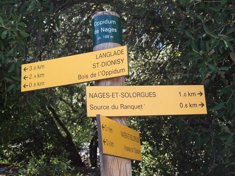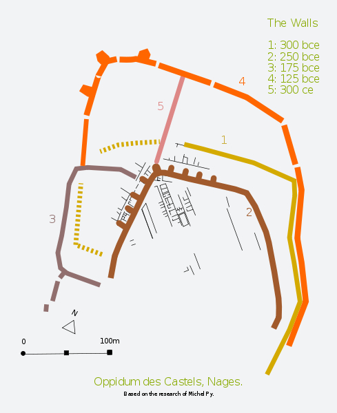 L'oppidum de Nages, aussi appelé oppidum des Castels ou de Saint‑Dionisy, se situe dans la vallée de la Vaunage sur la commune de Saint‑Dionisy, à proximité de Nages‑et‑Solorgues, dans le Gard. Il occupe le sommet de la colline de la Roque de Vif, à environ 160 mètres d'altitude, et domine la plaine de la Vaunage ; depuis le site on aperçoit les villages environnants — Calvisson avec ses hameaux de Sinsans et Bizac, Saint‑Côme‑et‑Maruéjols, Clarensac, Saint‑Dionisy, Caveirac, Boissières et Nages‑et‑Solorgues — ainsi que l'oppidum voisin de Mauressip. L'accès se fait depuis Nîmes, à 15 km à l'ouest, par la CD 40 en direction de Sommières, puis par la route vers Nages‑et‑Solorgues ; le site se trouve au nord du village, en direction de la fontaine romaine. Occupé du Néolithique à l'époque romaine, il figure parmi les sept oppidums gaulois qui rassemblaient la population de la Vaunage à l'âge du fer (800 à 50 av. J.-C.). Des vestiges lithiques néolithiques ont été découverts en 1958 au pied de la colline par Maurice Aliger. L'oppidum fut occupé au milieu du IIIe siècle av. J.-C. par la tribu des Volques Arécomiques, installé en position stratégique d'où l'on aperçoit le tracé de l'ancienne voie romaine reliant Nîmes à Sommières. La Voie Domitienne, construite à partir de -118 et reliant l'Italie à l'Espagne, passe à proximité, plus au sud ; un petit pont romain permettant de franchir le Rhôny a été restauré. Entre 290 av. J.-C. et 10 apr. J.-C., une partie des quatre enceintes successives de l'oppidum a été dégagée ; l'enceinte en pierres plates, les tours de guet et de défense ont été largement restaurées. Les fouilles ont mis au jour un réseau de rues en damier, des maisons d'habitation, des magasins et un fanum daté de 70 av. J.-C., qui fut détruit par un incendie au début du Ier siècle. Cet incendie correspond à l'abandon du site : les habitants rejoignirent Nemausus (Nîmes), qui devint alors la capitale romanisée de la région. Le site fut brièvement réoccupé au IIIe siècle et une cinquième et dernière enceinte engloba son quart nord‑ouest. Les recherches et la restauration du site ont été conduites de 1958 à 1974 par l'archéologue Michel Py. Pendant 48 ans, une petite salle au premier étage de la mairie de Nages‑et‑Solorgues abritait un musée municipal présentant des vestiges issus des fouilles ; faute de fonds, ce musée a fermé en 2023 et la collection a quitté le village sans lieu de dépôt précisé.