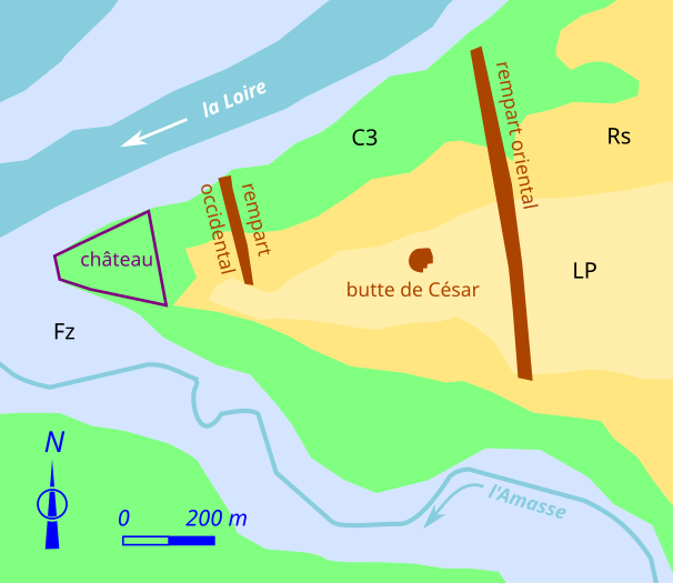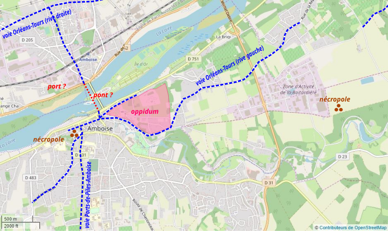 L'oppidum protohistorique des Châteliers domine la ville d'Amboise depuis un éperon calcaire qui s'élève d'environ cinquante mètres au-dessus du confluent de la Loire et de l'Amasse. Le plateau est occupé depuis le Paléolithique et fait l'objet d'une occupation quasi continue du Néolithique au IVe siècle. À son développement maximal, il couvre plus de cinquante hectares et aurait pu, sous le nom d'Ambacia, jouer un rôle central pour le peuple des Turones. Le site est un exemple régional caractéristique d'éperon barré : un rempart massif de terre long d'environ huit cents mètres, précédé d'un fossé large, ferme complètement l'accès oriental du plateau. Les remparts gaulois sont datés entre 400 et 50 av. J.-C. et le rempart primitif a connu des recharges successives jusqu'à former un talus très élevé et large. La butte dite « de César », au centre du plateau, est très vraisemblablement une butte artificielle et pourrait correspondre à un tumulus funéraire de l'âge du Bronze ou du premier Âge du Fer, mais sa nature reste mal connue. L'oppidum rassemble alors un ensemble organisé : un secteur cultuel et public au point le plus haut, des ateliers artisanaux, et des quartiers d'habitat disposés selon un schéma d'urbanisation que la prospection et les fouilles commencent à préciser. Des voies orientées est‑ouest et nord‑sud ainsi que des tronçons de circulation ont été reconnus, les activités artisanales bruyantes et polluantes se retrouvant en bordure du plateau tandis que les productions plus nobles et les habitations occupent la partie médiane. Plusieurs temples de type fanum et d'autres grands édifices publics ont été mis au jour dans une zone cultuelle concentrée sur au moins trois hectares ; de nombreux dépôts rituels et statuettes anthropomorphes confirment l'importance des pratiques religieuses. Un dépôt de l'âge du Bronze riche en armes, bijoux et pièces de char témoigne du rôle ancien du site comme lieu de centralisation et de prestige. L'activité artisanale et commerciale est soutenue : ateliers de poterie, tissage, métallurgie et tabletterie, fours et moules attestent de productions locales parfois inspirées de formes étrangères, tandis que les échanges s'étendent vers des régions lointaines et s'accompagnent d'apports variés de matières et de produits. La circulation monétaire est abondante, avec une forte proportion de potins gaulois parmi les monnaies découvertes. À la fin de l'époque augustéenne l'oppidum perd en importance politique au profit de Caesarodunum et se réoriente vers une fonction essentiellement économique et artisanale ; l'occupation décline ensuite progressivement, l'abandon étant consommé entre le début du IIIe siècle et la fin de l'Empire. Au Bas‑Empire et au Moyen Âge la pointe de l'éperon reste occupée par des structures fortifiées puis par le château médiéval, tandis que le reste du plateau est remis en culture ou planté de vignes, opérations qui ont limité l'épaisseur des dépôts archéologiques tout en permettant l'accès aux vestiges. La géologie du secteur associe limons éoliens quaternaires recouvrant des argiles à silex sénoniennes, tandis que le tuffeau turonien affleure sur les pentes et que les vallées sont comblées d'alluvions récentes. Les recherches archéologiques se poursuivent depuis plusieurs décennies : fouilles de sauvetage, sondages, diagnostics et opérations programmées ont permis de mieux comprendre la longue histoire du site ; près de soixante‑dix opérations ont été réalisées et des mesures de protection et d'acquisition ont été prises pour préserver son potentiel. Le plateau des Châteliers est inscrit au titre des monuments historiques et la valorisation du site, notamment par une meilleure information du public, fait l'objet d'initiatives locales et scientifiques.