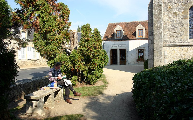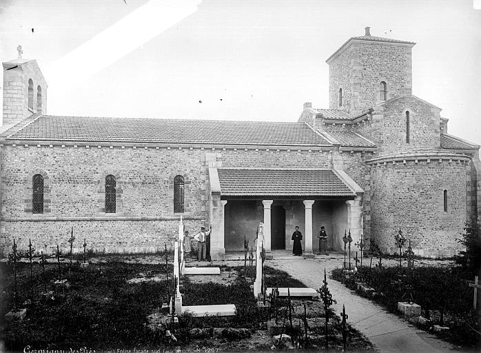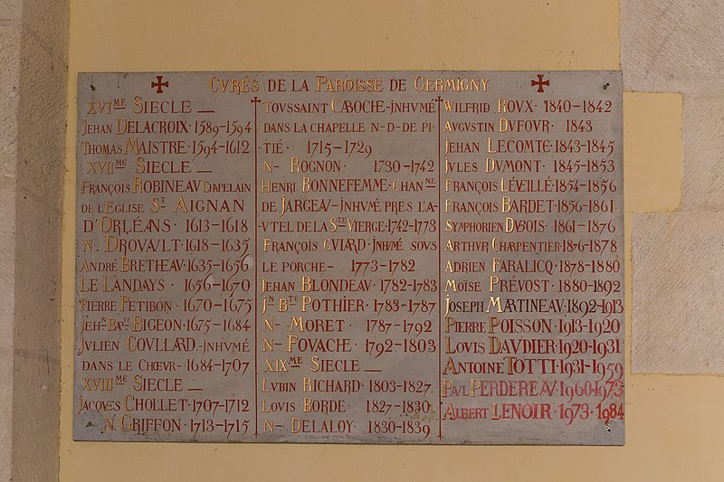 Le décor en stuc de la tour, représenté par des archivoltes et des colonnettes au second étage, relève d'un répertoire ancien et quelques éléments ont été relevés par Prosper Mérimée avant la démolition de 1867. Le mobilier de l'église est limité : on y note une pietà de tradition bourguignonne près de l'oratoire, un reliquaire émaillé d'atelier limousin de la fin du XIIe siècle exposé dans le petit musée de l'église, et une lanterne des morts des XVIe–XVIIe siècles déposée dans le jardin. La mosaïque de Germigny a été reproduite sur un timbre postal en 2000 et l'oratoire accueille chaque année plusieurs dizaines de milliers de visiteurs, en faisant l'un des monuments les plus fréquentés du département.
