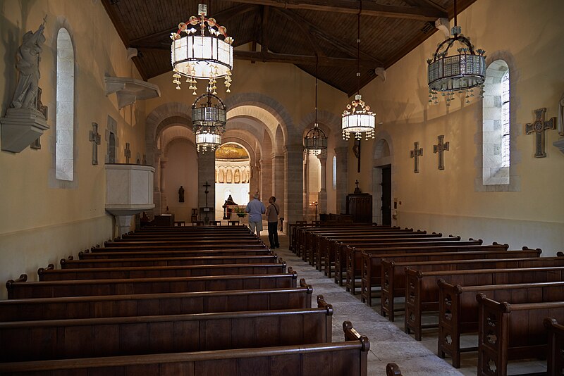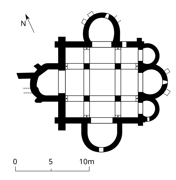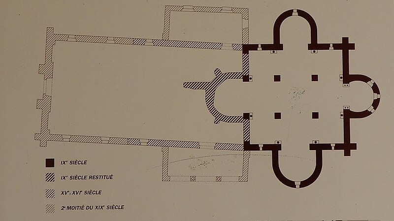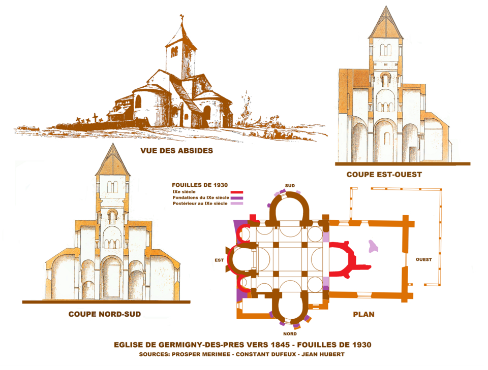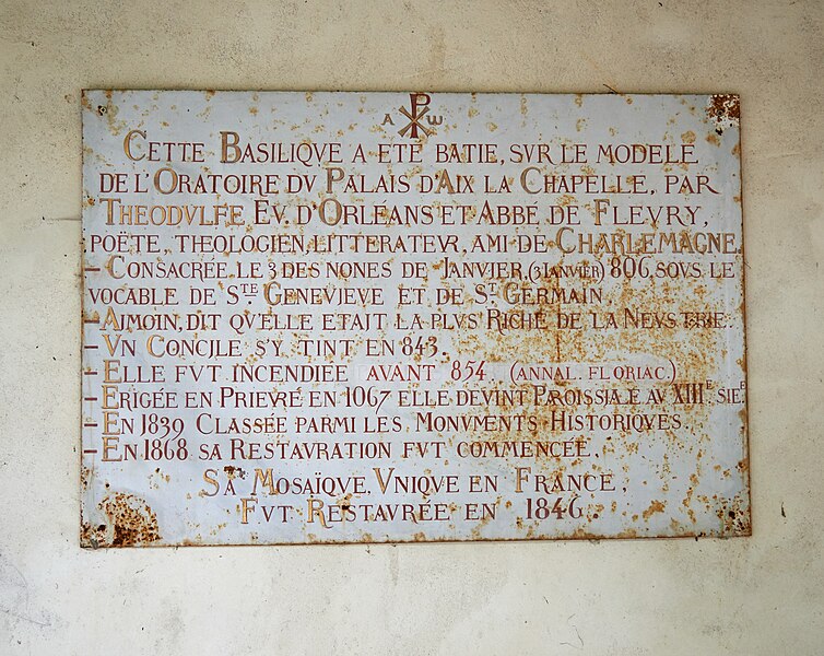 L'oratoire carolingien de Germigny-des-Prés, dit église de la Très-Sainte-Trinité, se trouve sur la commune de Germigny-des-Prés, dans le Loiret, en Val de Loire. Construit par l'évêque d'Orléans Théodulphe pour sa villa de Germigny, l'édifice adopte un plan centré en croix grecque inscrit dans un carré, avec trois absides orientées et des absidioles flanquant l'abside ouest. Une abside à l'extrémité des bras nord et sud existait également, tandis que l'abside ouest a disparu lors de l'adjonction d'une nef unique aux XVe–XVIe siècles. Au centre se dressait une tour-lanterne élevée sur quatre piles, éclairée par des voûtes en berceau et soutenue par de petites coupoles aux angles du carré. Dès le IXe siècle, des contreforts renforcent les murs qui portent ce dispositif voûté. Les fouilles ont révélé des niveaux successifs : le dallage primitif, des fondations d'absides en moellons et des sols postérieurs, ainsi que des vestiges de la loge épiscopale et d'un porche à l'ouest. Classée monument historique en 1840, l'église a fait l'objet de multiples restaurations et reconstructions ; l'important chantier de 1867–1876 par Juste Lisch a profondément transformé l'édifice et seule subsiste véritablement de l'original la mosaïque de l'abside orientée, quelques fondations et des fragments de décor conservés au Musée historique d'Orléans. Des éléments mis au jour et relevés au XIXe siècle, notamment des chapiteaux et des morceaux de stuc, ont été déposés au musée Cabu.