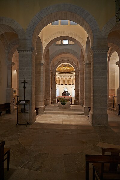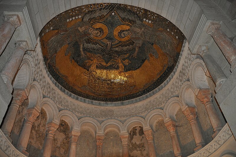 La mosaïque de l'abside, découverte et partiellement dégagée au XVIIIe siècle puis protégée et restaurée au XIXe siècle, constitue la principale survivance carolingienne de l'édifice. Collée sur toile et consolidée lors des interventions de Delton, Ciuli et Chrétin, elle conserve des parties authentiquement du début du IXe siècle et présente une conque elliptique de 6,25 m de base et 4,60 m de hauteur. Le sujet, annoncé par une inscription latine, représente l'Arche d'alliance posée sur une large bande d'or, portée par un des bâtons et gardée par deux chérubins vêtus de tuniques d'or ; deux anges nimbés et presque symétriques, d'1,96 mètre, montrent l'Arche et dominent la composition, tandis que la main de Dieu traverse un arc-en-ciel au sommet de la voûte. Une large bordure polychrome à grands octogones et un cartouche bleu inscrit occupent le registre inférieur.