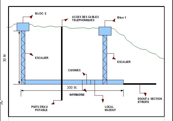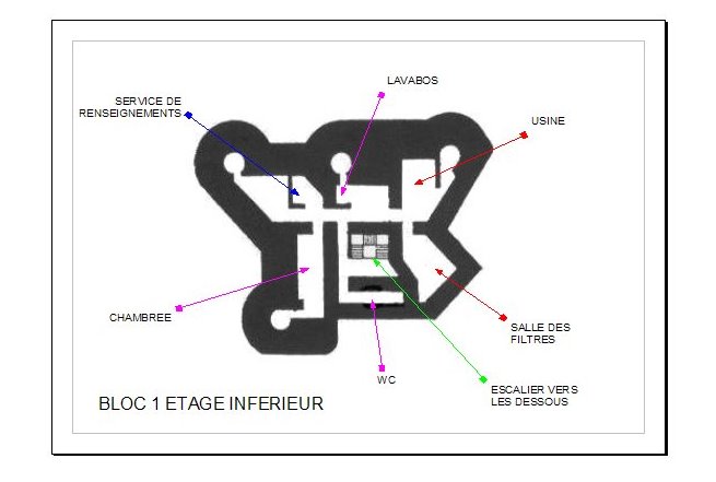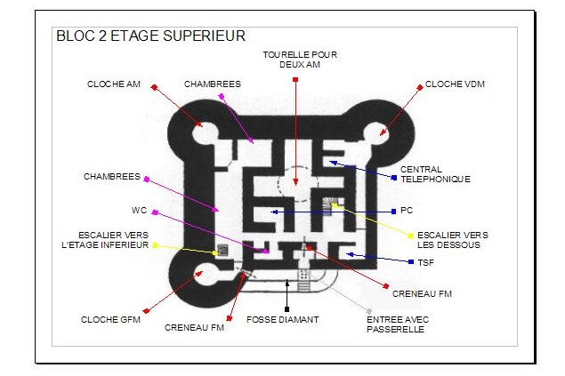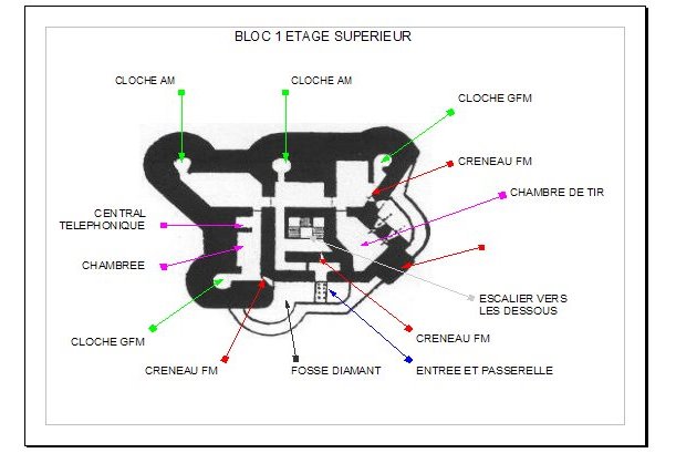 Le bloc 1, qui servait de casemate d’infanterie et d’entrée principale, comportait une entrée munie d’une grille et d’une porte blindée en chicane, des fossés diamants défendus par des fusils‑mitrailleurs et des goulottes lance‑grenades, une chambre de tir équipée d’un créneau JM/AC 47 et d’un créneau pour jumelage de mitrailleuses, ainsi que des locaux de vie et techniques (réservoir d’eau, chambres de repos, central téléphonique, groupes électrogènes, salle de neutralisation des gaz). Le bloc 1 était coiffé de deux cloches GFM et de deux cloches AM et complété par un projecteur sous abri bétonné. Le bloc 2, de configuration analogue mais plus compact, comprenait une entrée secondaire, des chambres de repos (30 lits au total), un local radio avec antenne de 14 mètres, des locaux techniques en sous‑sol et, sur le dessus, une tourelle AM pour deux armes mixtes, une cloche GFM, une cloche VDP (la seule de la tête de pont de Montmédy) et une cloche d’arme mixte ; la tourelle AM, mobile et blindée, pesait 135 tonnes et était servie par une vingtaine d’hommes. Les deux blocs étaient reliés par une galerie courbe et faiblement éclairée longue de plus de 270 mètres, située respectivement à 19 m et 28,60 m de profondeur sous les blocs, desservant cuisine, laverie, magasin aux vivres, réserve à charbon, infirmerie, puits, arrivée téléphonique et magasin à munitions, ainsi qu’une galerie d’évacuation‑assainissement de 80 mètres sous le dallage dont les eaux se jetaient dans la Chiers.