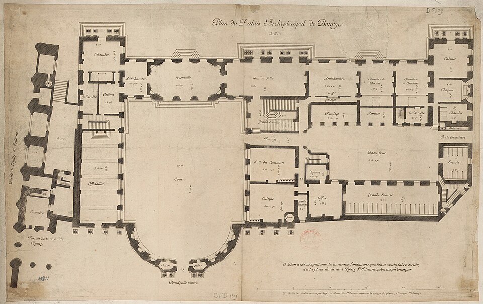 Le palais archiépiscopal, l'un des principaux bâtiments du centre de Bourges, fait face à la cathédrale. Il a servi d'hôtel de ville de 1910 à 1995 et abrite aujourd'hui le musée des « Meilleurs Ouvriers de France », qui rassemble des œuvres issues du tour de France des lauréats. Une maison de l'archevêque est attestée depuis sa reconstruction par Pierre de La Châtre (1141-1171) ; située près des remparts gallo-romains, elle a souffert des incendies de 1252 et 1353 et a été plusieurs fois modifiée. En 1677, l'archevêque Phélypeaux de La Vrillière juge la demeure indigne d'un prélat et confie à l'architecte Pierre Bullet la conception d'un vaste palais. Bullet prévoit plusieurs bâtiments disposés autour d'une cour d'honneur et d'une cour de service, complétés par des jardins, des parterres et un Grand Séminaire (actuellement la Cité administrative Condé). Du projet initial n'ont été réalisés que deux murs du corps de logis prévu entre les deux cours, ainsi que le grand escalier central et l'aile sud dite Pavillon de La Vrillière, précédée d'un péristyle à colonnes. À la mort de l'archevêque en 1694, le projet est abandonné après qu'une lettre de cachet du roi, sollicitée par la famille, a interrompu les travaux. Les écuries ont été réaménagées pour accueillir les archives. Après l'incendie du 25 juillet 1871, les destructions ont permis de remanier et d'achever le pavillon La Vrillière sous la responsabilité d'Émile Tarlier. Le palais est le résultat des évolutions successives du projet initial. En 1906, à la suite du départ de l'archevêque Pierre Servonnet lors de l'application de la loi de 1905 sur la séparation des Églises et de l'État, la commune, sous le mandat d'Henri Ducrot, récupère le bâtiment et l'installe en hôtel de ville jusqu'à la construction du nouvel hôtel de ville en 1995, auquel il est relié par une passerelle. Les jardins de l'archevêché conservent une portion de l'enceinte gallo-romaine, comportent quelques sculptures et évoquent un jardin public de la seconde moitié du XIXe siècle ; ils ne correspondent pas au projet de Le Nôtre. Les trois façades et toitures formant le pavillon La Vrillière ainsi que l'escalier monumental sont inscrits au titre des monuments historiques par arrêté du 10 juin 2004.