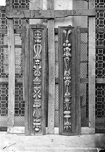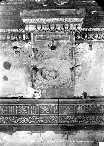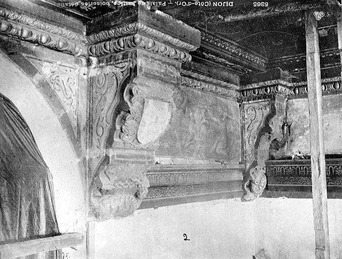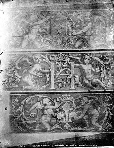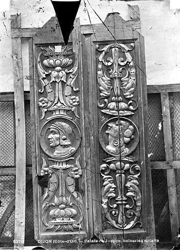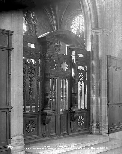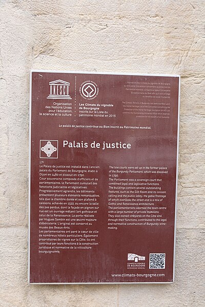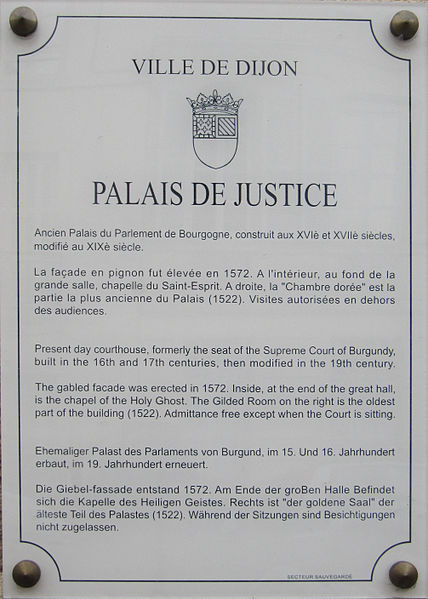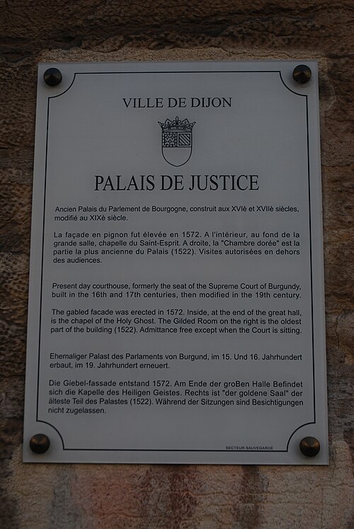 Le palais de justice de Dijon, ancien Parlement de Dijon, se situe à Dijon (Côte‑d'Or) et est classé monument historique depuis le 15 février 1926. De 1480 à 1789 il abritait l'ancien Parlement ; de 1790 à 1989 il a accueilli le tribunal de première instance puis le tribunal de grande instance. Aujourd'hui, l'ancien bâtiment ne conserve que la cour d'appel de Dijon ; depuis 1989 le Tribunal judiciaire, le Conseil de prud'hommes et le Tribunal de commerce siègent dans la Cité judiciaire, au 13 boulevard Clemenceau. La construction s'étend du XVIe au XIXe siècle : la Chambre dorée est achevée en 1522, la Tournelle est entreprise en 1549 et la salle Saint Louis ainsi que la façade Renaissance sont terminées en 1580. La porte de la façade est sculptée par Hugues Sambin. La Chambre des Requêtes, datée du XVIIe siècle, possède un plafond décoré d'une Allégorie de la justice réalisée en 1688 par Gabriel Revel, membre de l'Académie royale de peinture et de sculpture. Des travaux se poursuivent au XVIIIe siècle sur la façade donnant sur la place du Palais et le XIXe siècle voit des restaurations, dont le déplacement de la chapelle du Saint‑Esprit dans le prolongement de la salle Saint Louis. La Chambre dorée, édifiée à l'initiative de Louis XII, présente un plafond composé de trente‑cinq caissons ornés de motifs liés au pouvoir royal ; la frise centrale porte des lettres évoquant Yahvé, signe de la primauté de la justice divine, et le plafond a été remanié sous Louis XIII avec des lettres L et A. Les vitraux en grisaille illustrent la foi, la charité et l'espérance, et la salle conserve une tapisserie des Gobelins de la fin du XVIIIe siècle représentant « Laban et ses filles ». La salle des Pas‑Perdus, aussi appelée salle Saint Louis, se distingue par une voûte en nef de bateau renversé ; la symétrie des ouvertures et des décors confère à l'ensemble un caractère néogothique. De cette chapelle subsiste principalement une porte en bois sculpté ; la salle est très proche de la salle des malades des hospices de Beaune, sans qu'il soit possible de déterminer laquelle est la réplique de l'autre. La salle des assises, la plus récente, a été construite à partir de 1862 pour y tenir les assises jusque‑là tenues dans la Grand' chambre. Son plafond provient de l'ancienne chambre des comptes ; au centre figurent les armes de France et de Navarre entourées du collier de l'ordre de Saint‑Michel. Une peinture intitulée « La Famille » (1901) orne un mur et la maxime « non omnis moriar » y est gravée. La salle des Enquêtes, construite en 1641 et aujourd'hui transformée en bibliothèque de la cour d'appel, porte au plafond une allégorie de la justice et abrite des ouvrages anciens ayant échappé aux destructions et pillages de la Révolution. On y trouve les symboles traditionnels de la justice : la balance, le serpent, le glaive et une main de justice. La Grand' chambre, cœur historique du Parlement de Bourgogne et partie la plus ancienne du palais, accueille aujourd'hui le cabinet du premier président. Au XVIIe siècle, ses baies en accolade ont été remplacées par des baies rectangulaires et la salle a été divisée ; elle recevait les audiences, mieux chauffée que la Chambre dorée réservée aux séances d'apparat. Quelques ouvrages très anciens y sont conservés et le bureau actuel du secrétariat général faisait autrefois partie de la Grand' chambre ; on y trouve par ailleurs un portrait du chancelier d'Aguesseau, en dépôt mais propriété de l'Hôpital général. La salle des Avocats, ancienne chambre de la Tournelle construite en 1549 et remaniée au XVIIe siècle, se remarque par son plafond à la française, son décor polychrome et une cheminée monumentale de 1610 provenant du château de Turcey. Au‑dessus de la cheminée figure un écusson royal entouré des colliers des ordres de Saint‑Michel et du Saint‑Esprit. Le nom de « chambre de la Tournelle » évoque la rotation des conseillers ; la salle conserve une porte de l'époque d'Henri II portant les lettres H, C (pour Catherine de Médicis) et un C inversé pouvant évoquer Diane de Poitiers. La courette, garnie d'arcades et d'un puits, correspondait à la conciergerie et aux prisons ; subsiste la porte d'un ancien cachot qui mène à une salle voûtée du sous‑sol aux murs très épais. Le palais est illustré par de nombreuses photographies présentant l'extérieur (vue panoramique, façade principale rue du Palais, entrée, porte d'Hugues Sambin, façade de la Tournelle, façade du n°10 rue du Palais, arrière sur la rue Amiral Roussin), l'intérieur (salle Saint Louis, chapelle du Saint‑Esprit, Chambre dorée, salle des assises, plafonds de l'ancienne Chambre des Enquêtes et de la salle de la Tournelle) ainsi que la plaque d'information du bâtiment. La notice s'accompagne d'une bibliographie, d'annexes et de références ainsi que de liens vers des ressources et archives relatives au palais.