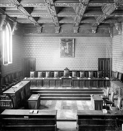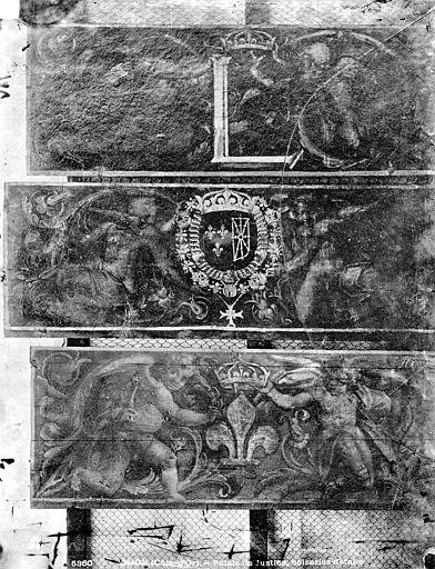 Grande salle des Pas-Perdus : façades, murs, voûtes, charpentes, combles et couvertures de la salle ; porche et perron extérieurs placés contre la face Nord ; petite chapelle intérieure dans le mur Sud. Salle des assises : murs, plafond avec sa charpente, combles, couvertures de la salle et des couloirs longeant à l'extérieur les côtés Nord-Est et Sud de la salle. Chambre civile : murs, lambris, plafond, charpente des combles, couvertures et couloirs longeant les côtés Nord et Sud de cette chambre. Dégagement et vestibules situés dans le prolongement et à l'Ouest de la chambre civile : murs, plafond, combles et couvertures. Salle de la bibliothèque et des audiences privées : murs, plafonds, combles et couvertures. Cour intérieure au Sud de la bibliothèque : façades. Vestibules de la salle et du conseil des avocats : murs, planchers, combles et couvertures. Salle du conseil des avocats : murs, cheminées, planchers, combles et couvertures : classement par arrêté du 15 février 1926