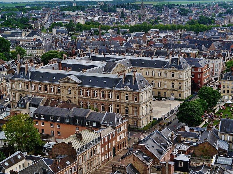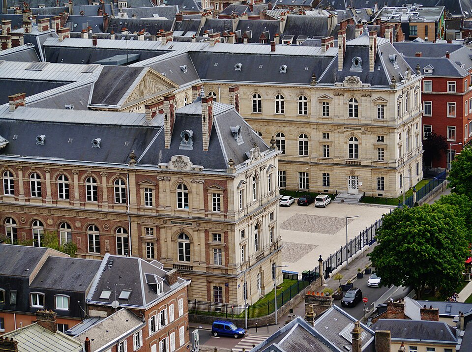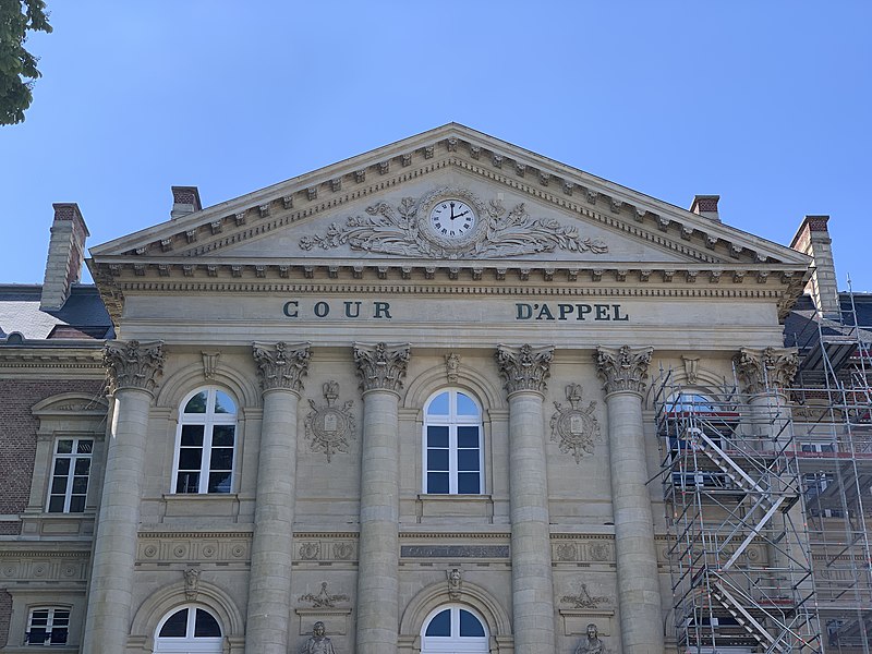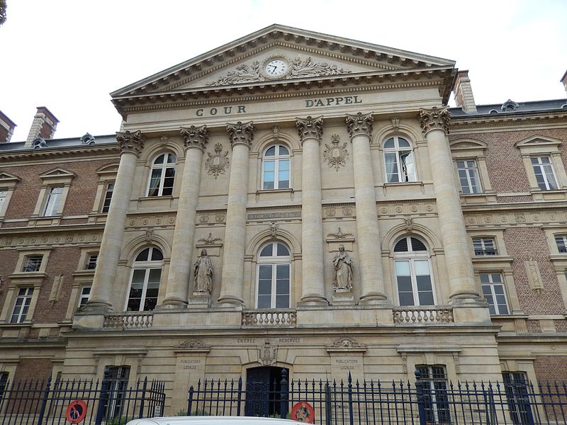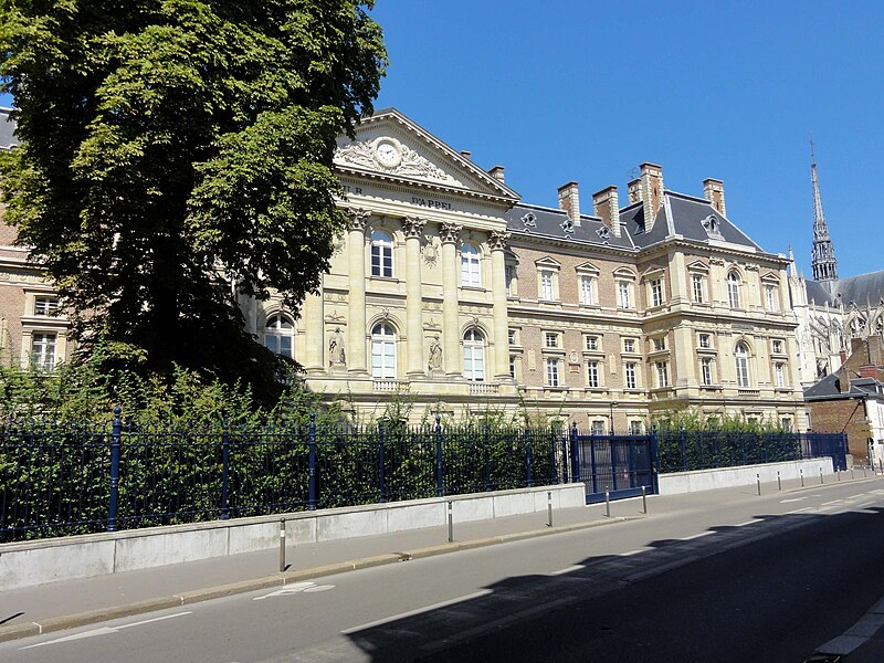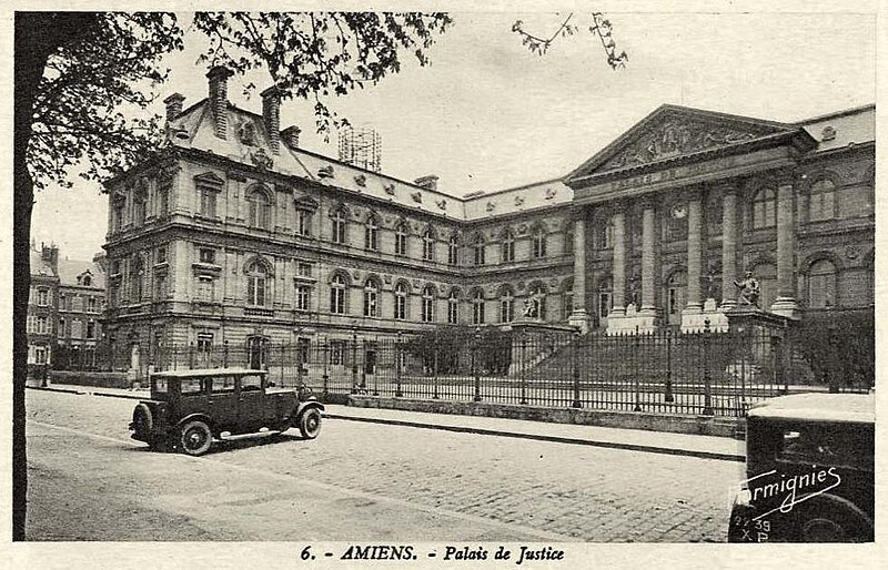 Le Palais de justice d'Amiens a été élevé sur l'emplacement de l'ancien couvent des Célestins et conçu pour regrouper en un même lieu l'ensemble des juridictions territoriales, faisant de lui l'un des premiers palais de justice en France à remplir cette fonction. Sa construction, menée à partir des plans de l'architecte départemental Jean Herbault, associé à Natalis Daullé, s'est déroulée en deux campagnes, de 1864 à 1868 puis de 1874 à 1880 ; l'entrepreneur Leroy-Digeon a été adjudicataire des travaux en 1866 et Natalis Daullé est décédé en 1873, laissant la direction à Jean Herbault. Le projet a suscité des critiques et des adaptations, notamment de la part de Jacques Hittorff qui intervint sur le parti architectural et sur la composition de l'entrée avec sa colonnade. L'édifice, de style néoclassique, est bâti en brique et pierre et présente un plan en U ; son entrée principale s'atteint par un grand escalier et est couronnée d'un fronton triangulaire supporté par six colonnes aux chapiteaux corinthiens. Les sculptures du fronton et les statues qui encadrent l'escalier, ainsi que la Charité de Saint-Martin et les allégories de l'Industrie et de la Science sur la façade nord, sont l'œuvre de Justin Sanson ; les statues de Montesquieu et d'Henri-François d'Aguesseau figurent sur la façade est et sont signées Edmond Lévêque. À l'intérieur, le décor reflète l'éclectisme du XIXe siècle et intègre un ensemble important de boiseries démontées au début du XVIIIe siècle et réalisées par François Cressent (avec la participation de son fils Charles) pour le couvent des Célestins, réintégrées dans l'ornementation du palais. Le bâtiment a connu d'importants problèmes structurels : l'affaissement de planchers dans de vastes salles, attribué à des erreurs de calcul et à un mauvais choix de matériaux, a nécessité le renforcement des voûtes et des planchers par des colonnes de fonte et des arcs de décharge, travaux conduits sous la direction d'Émile Ricquier après le suicide de Jean Herbault en 1880. Les grilles extérieures, la cour d'honneur et le jardin sur la rue Victor-Hugo font l'objet d'une protection au titre des monuments historiques par arrêté du 29 juin 1994. Une annexe du palais, l'Espace Pierre Dubois, est située rue Pierre Dubois.
