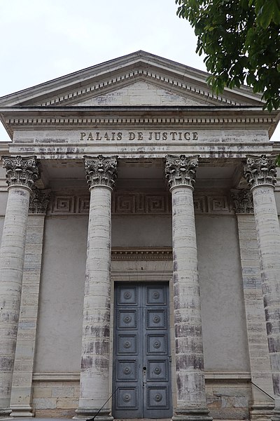 Construit de 1833 à 1836 sur les plans des architectes Christophe Colard et Auguste Sirodot, le Palais de Justice illustre les constructions publiques urbaines de style néo-classique de la première moitié du XIXe siècle. Le bâtiment, de plan en U, délimite une cour intérieure et son corps principal est précédé d’un avant-corps formant porche. Ce porche repose sur des colonnes à chapiteaux corinthiens et est couronné d’un fronton triangulaire. Dans le tribunal de commerce, une salle d’audience conserve un décor peu modifié depuis le XIXe siècle. L’édifice a été érigé à l’emplacement de l’ancien jardin du couvent des Cordeliers.