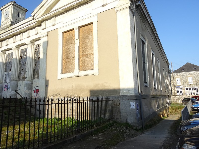 Le Palais de Justice, achevé en 1853, a abrité le tribunal de Mayenne jusqu'en 1992. L'idée d'un nouvel édifice avait été évoquée dès 1840 pour remédier aux conditions de travail dénoncées par les magistrats, un procureur signalant dès 1835 que le parquet se réunissait à son domicile. En 1843, l'architecte parisien Édouard Moll est choisi pour mener le projet ; en 1844 le périmètre est étendu pour inclure le tribunal de commerce et un projet est finalisé en 1845. L'adjudication prévue le 28 juin 1847 est infructueuse et plusieurs tentatives échouent, jusqu'à une attribution hors marché en décembre 1848 à M. Guérin, qui venait d'achever sous la direction d'Édouard Moll l'hôpital civil rue Roullois. La réception des travaux, pour un coût de 186 095,93 francs, a lieu le 13 octobre 1853, et l'année suivante le tribunal civil et le tribunal de commerce s'installent dans le bâtiment. L'édifice conserve cette fonction jusqu'en 1992, date de construction d'un nouveau tribunal motivée par des rapports soulignant les inconvénients du lieu et le coût élevé des adaptations nécessaires. Le 24 février 1994, la façade et les toitures, alors du bâtiment désaffecté, sont inscrites au titre des monuments historiques, écartant ainsi la menace de démolition. En 2005, le conseil général met l'immeuble en vente pour 120 000 euros ; la mairie, prioritaire, décline l'achat et plusieurs projets sont évoqués par la suite, allant de commerces en 2008 à une cité juridique en 2014 puis une reconversion en bureaux en 2015. Entre-temps, les sous-sols avaient été aménagés en un bar de nuit, Le Justice, ouvert le 1er mai 2010. Après trois ans de travaux, la réhabilitation s'achève au printemps 2019 avec l'ouverture de commerces de bouche — un bar à huîtres, un restaurant et une conserverie artisanale — organisés autour d'un patio lumineux, faisant du site un nouveau lieu de rencontre du centre-ville.