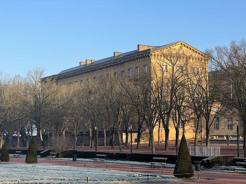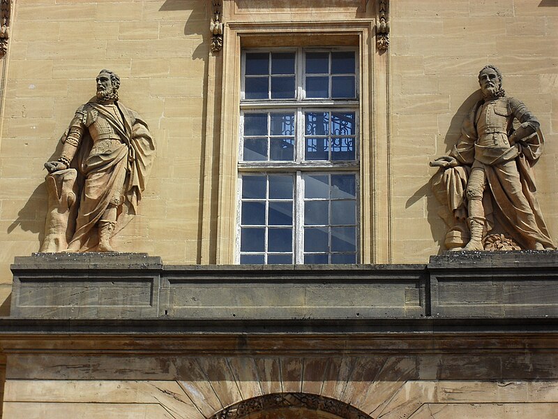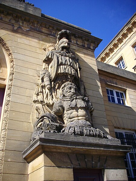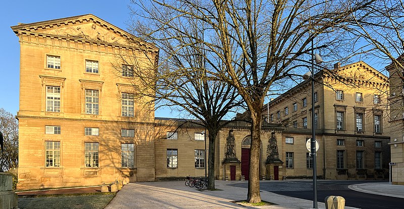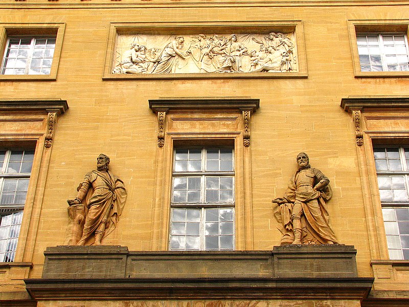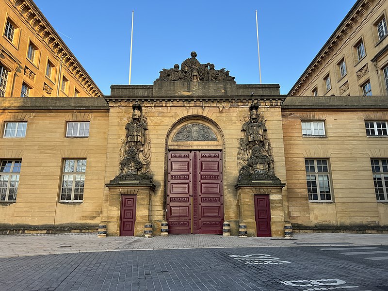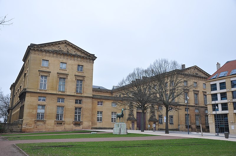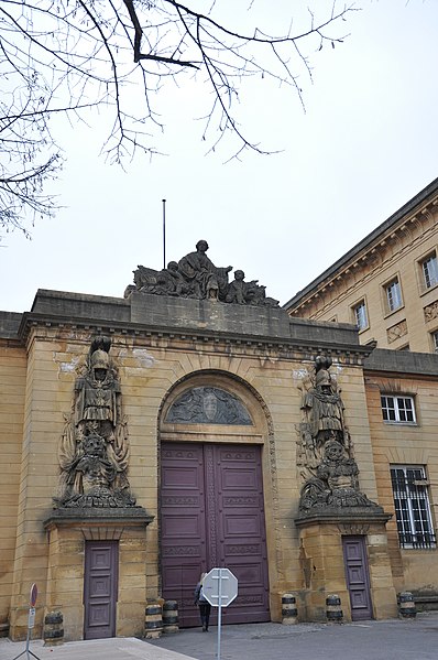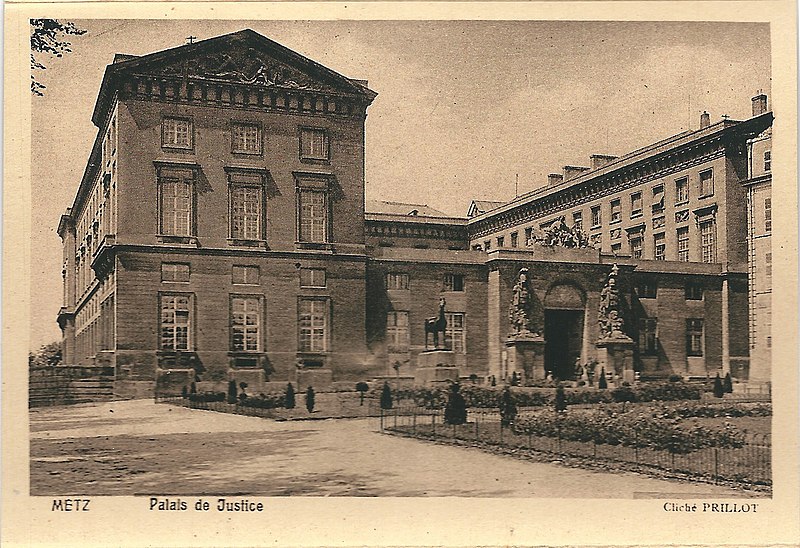 Le palais de justice de Metz, situé dans le quartier Metz‑Centre, abrite les tribunaux de la ville et la Cour d'appel de Metz. Bâti en pierre de Jaumont, cet édifice imposant était à l'origine destiné à la résidence du gouverneur militaire et des intendants de la province des Trois‑Évêchés. Dès 1728, le maréchal Charles Louis Auguste Fouquet de Belle‑Isle entreprend de repenser l'urbanisme de Metz : après l'édification d'un nouveau théâtre sur l'île du Petit Saulcy, il projette d'ouvrir le quartier de la cathédrale en créant une place royale centrale entourée de bâtiments publics. Après de longues négociations avec le clergé et les notables, Blondel est chargé du projet d'hôtel de ville, puis, en 1777, Charles‑Louis Clérisseau reçoit la responsabilité des plans de l'hôtel du Gouvernement, futur palais de justice. Sur ordre du roi, la construction démarre en 1776 à proximité de la citadelle et se poursuit jusqu'en 1791 ; la Révolution empêche l'achèvement complet et laisse inachevée la façade donnant sur la rue du Juge Michel. Les mouvements populaires entraînent la destruction de plusieurs sculptures et des trois bas‑reliefs de la façade arrière. L'édifice est toutefois utilisé pendant la Révolution comme siège de l'administration départementale puis comme tribunal révolutionnaire, et il devient officiellement palais de justice en 1812 sous l'Empire. Architectoniquement, le bâtiment se compose de trois corps en U, fermés au sud par des pavillons encadrant un portail monumental et entourant une vaste cour intérieure dont les façades est et ouest sont ornées de bas‑reliefs. Les façades en pierre de Jaumont rappellent la vocation militaire première du lieu. Le portail, encadré de deux trophées, est surmonté d'un groupe sculpté intitulé « la France veillant sur ses enfants » ; dans le fronton gauche, Hercule symbolise la force, tandis que Minerve casquée, dans le fronton droit, représente la science militaire. Les bas‑reliefs évoquent des épisodes historiques : la première aile, à gauche, montre le duc de Guise portant secours aux soldats blessés abandonnés par Charles‑Quint lors du siège de 1552 ; la seconde, à droite, rappelle que La Fayette, alors officier de la garnison de Metz, décida de partir pour l'Amérique. Un autre bas‑relief décrit la guérison de Louis XV à Metz. Dans la cour, des statues de guerriers — dont le duc de Guise, le duc de Montmorency, le maréchal de Vieilleville, le duc de Broglie et le duc de Gonnord — se dressent sur les corniches des portes latérales, tandis que, côté jardin Boufflers, figurent Turenne et le maréchal de Luxembourg. Le palais comporte plusieurs salles judiciaires : cour d'instance, cour de grande instance, cour d'appel, juridiction correctionnelle, chambre d'instruction, service de police et chambre de cassation ; la dernière condamnation à mort y a été prononcée en 1967. Deux escaliers de pierre desservent les étages, celui de l'aile droite étant particulièrement monumental. Le palais de l'Intendant royal, aujourd'hui préfecture, est moins imposant, reflet du fait que le gouverneur, et non l'intendant, détenait le pouvoir à Metz. Le palais de justice est classé au titre des monuments historiques : ses façades et toits le sont depuis 1921, et son vestibule reçoit une protection en 1929. En tant que bâtiment historique, il ne dispose pas de rampes d'accès pour les personnes handicapées. Des ressources et illustrations sur le palais sont disponibles dans les bases Mérimée et sur Wikimedia Commons.