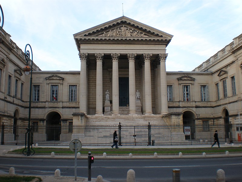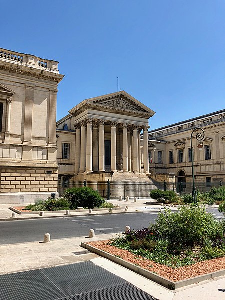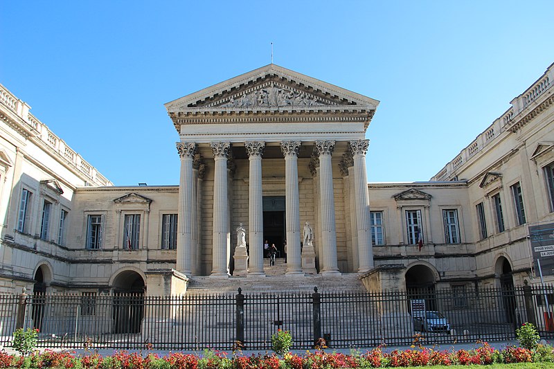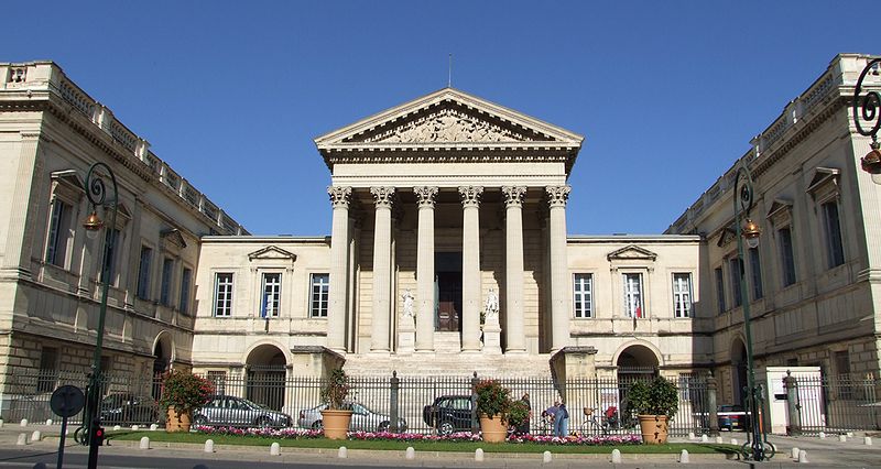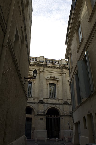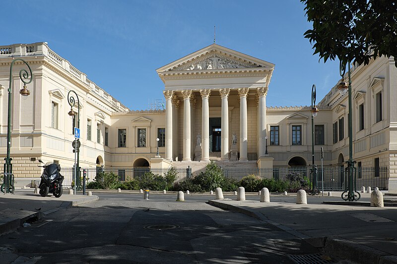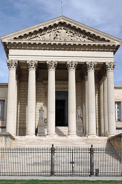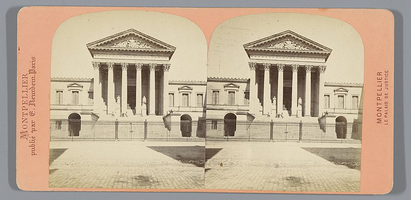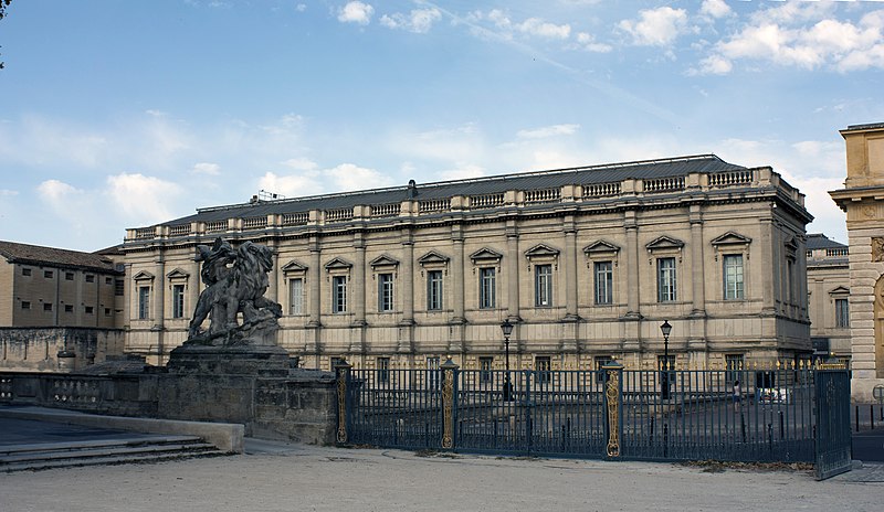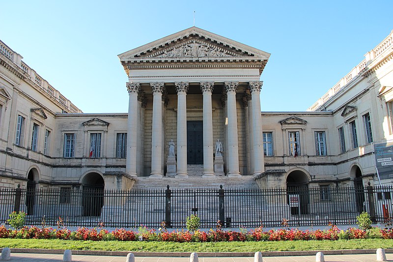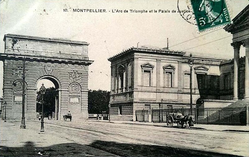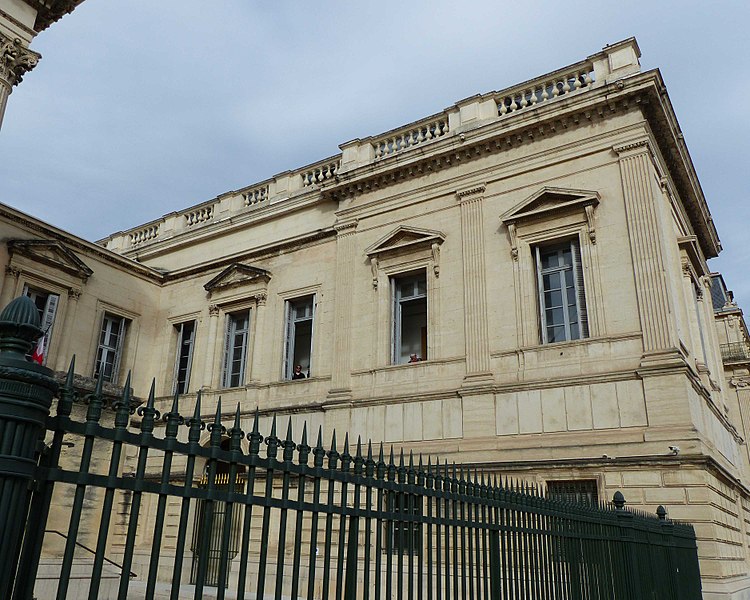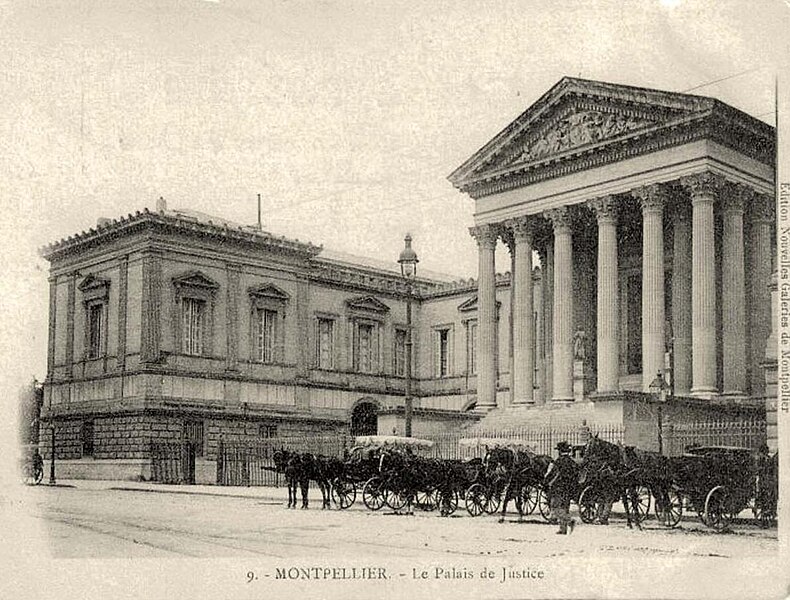 Le palais de justice de Montpellier, situé rue Foch au cœur de l’Écusson, est un édifice néoclassique achevé en 1853 et inscrit aux monuments historiques. Le site a connu une longue histoire : en 1143 y furent édifiés un château féodal et une chapelle privée, détruits en 1207. Au Moyen Âge se dressait là la forteresse des Guilhems ; Guilhem Ier reçut ce fief de Bernard II, comte de Melgueil, et la justice y était rendue par un bailli, ses jugements pouvant être relevés devant la cour seigneuriale puis la cour de bailli. En 1349, Montpellier passa sous la domination des rois de France, qui se firent représenter par des gouverneurs du palais, et en 1577 l’ancien château-fort fut démoli pendant les guerres de Religion. En 1629 l’emplacement fut concédé aux cours souveraines et la nouvelle Cour des Comptes, Aides et Finances s’installa sur les ruines ; un devis de construction fut dressé vers 1630 par Bernard Bordés et Simon Levesville. L’édifice en place fut réparé en 1789 pour accueillir le Tribunal révolutionnaire, qui devint ensuite Cour impériale puis Cour royale. En raison d’un état de délabrement marqué, le gouvernement décida en 1839 de reconstruire le palais ; le projet de Charles Abric, architecte du département de l’Hérault, fut retenu et les travaux, ouverts en 1846, s’achevèrent en 1853. Aujourd’hui, le bâtiment historique abrite la Cour d’assises et la cour d’appel, tandis que d’autres services judiciaires ont été transférés au nouveau palais de justice (Cité Judiciaire Méditerranée) et que le tribunal judiciaire a été transféré en 1996 au nouveau palais place Pierre-Flotte. L’édifice, représentatif du néoclassicisme, présente un ensemble architectural marqué par des colonnes et un fronton décoratif. Dans le cadre du secteur sauvegardé, il fait l’objet d’une inscription au titre des monuments historiques depuis le 25 mars 1994 ; plusieurs mobiliers y sont également inscrits, notamment les tableaux « Louis XIV soutenu par la Justice et la Religion » et « Province du Languedoc se mettant sous la protection de la Justice », ainsi que trois cartels et quatre fauteuils.