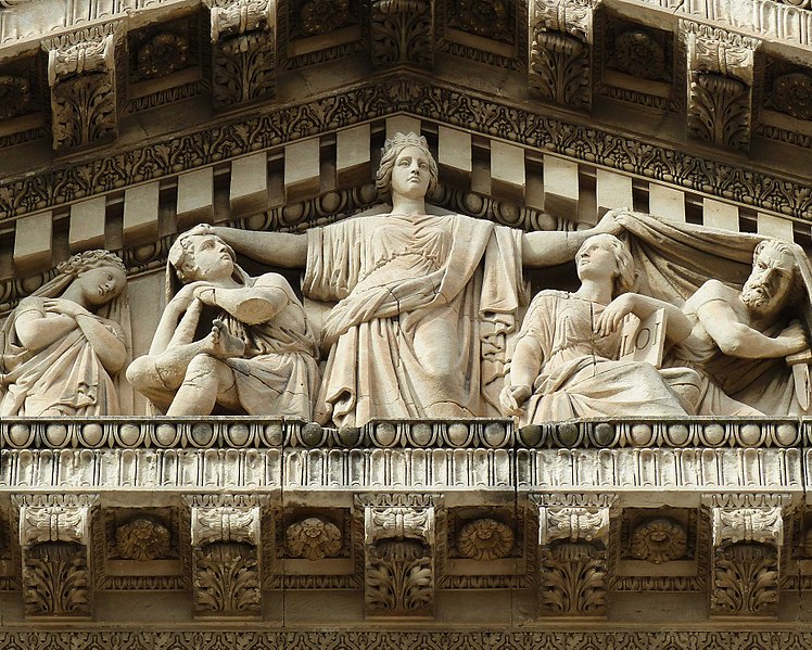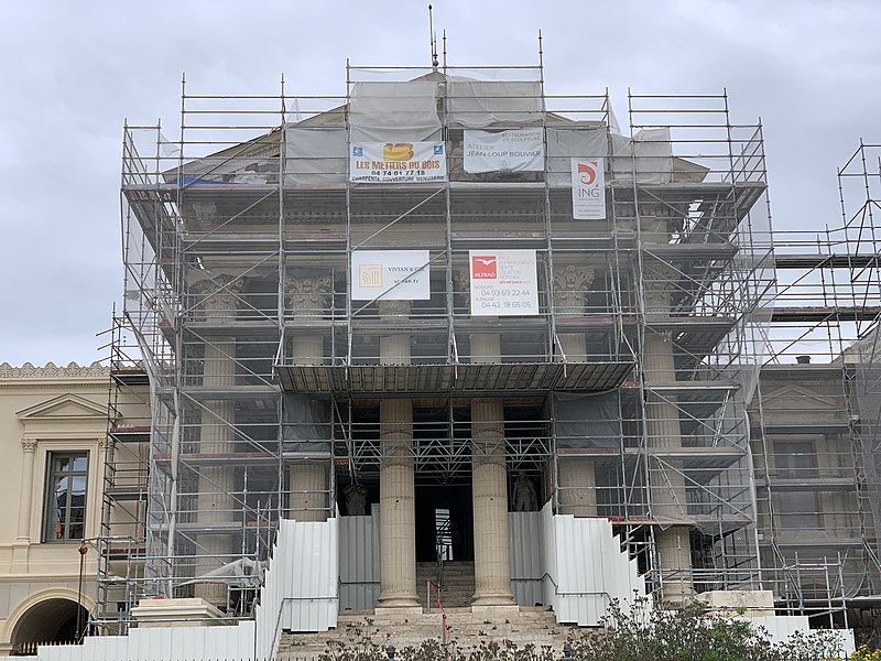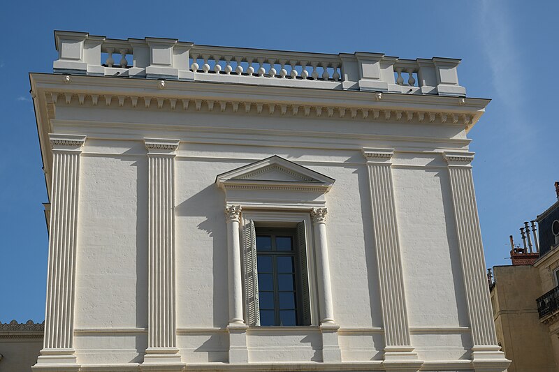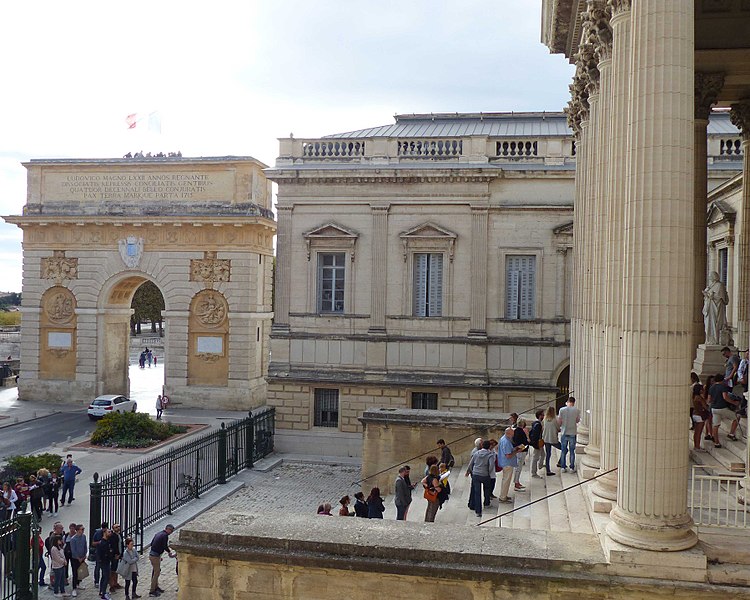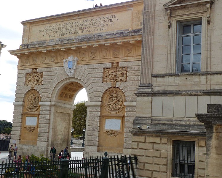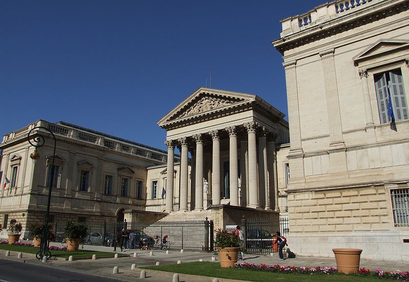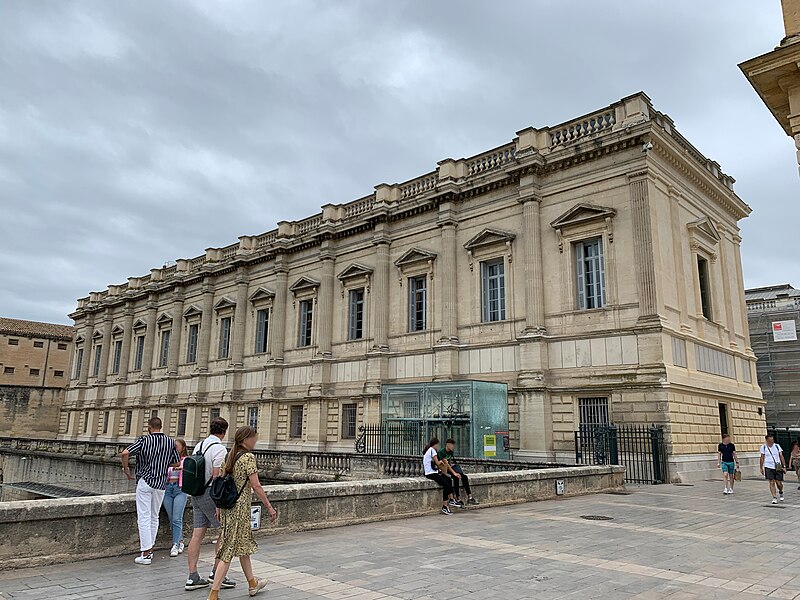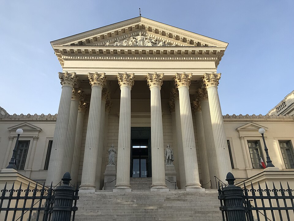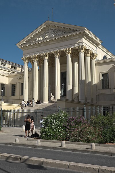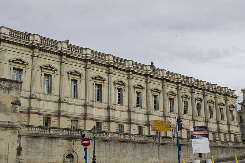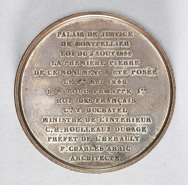 Le palais de justice de Montpellier, situé rue Foch au cœur de l’Écusson, est un édifice néoclassique achevé en 1853 et inscrit aux monuments historiques. Le site a connu une longue histoire : en 1143 y furent édifiés un château féodal et une chapelle privée, détruits en 1207. Au Moyen Âge se dressait là la forteresse des Guilhems ; Guilhem Ier reçut ce fief de Bernard II, comte de Melgueil, et la justice y était rendue par un bailli, ses jugements pouvant être relevés devant la cour seigneuriale puis la cour de bailli. En 1349, Montpellier passa sous la domination des rois de France, qui se firent représenter par des gouverneurs du palais, et en 1577 l’ancien château-fort fut démoli pendant les guerres de Religion. En 1629 l’emplacement fut concédé aux cours souveraines et la nouvelle Cour des Comptes, Aides et Finances s’installa sur les ruines ; un devis de construction fut dressé vers 1630 par Bernard Bordés et Simon Levesville. L’édifice en place fut réparé en 1789 pour accueillir le Tribunal révolutionnaire, qui devint ensuite Cour impériale puis Cour royale. En raison d’un état de délabrement marqué, le gouvernement décida en 1839 de reconstruire le palais ; le projet de Charles Abric, architecte du département de l’Hérault, fut retenu et les travaux, ouverts en 1846, s’achevèrent en 1853. Aujourd’hui, le bâtiment historique abrite la Cour d’assises et la cour d’appel, tandis que d’autres services judiciaires ont été transférés au nouveau palais de justice (Cité Judiciaire Méditerranée) et que le tribunal judiciaire a été transféré en 1996 au nouveau palais place Pierre-Flotte. L’édifice, représentatif du néoclassicisme, présente un ensemble architectural marqué par des colonnes et un fronton décoratif. Dans le cadre du secteur sauvegardé, il fait l’objet d’une inscription au titre des monuments historiques depuis le 25 mars 1994 ; plusieurs mobiliers y sont également inscrits, notamment les tableaux « Louis XIV soutenu par la Justice et la Religion » et « Province du Languedoc se mettant sous la protection de la Justice », ainsi que trois cartels et quatre fauteuils.