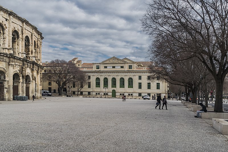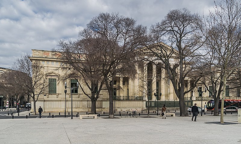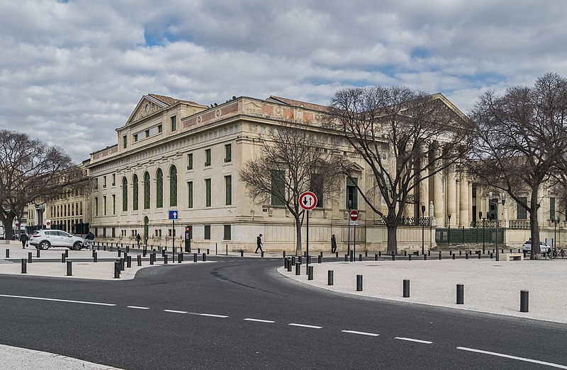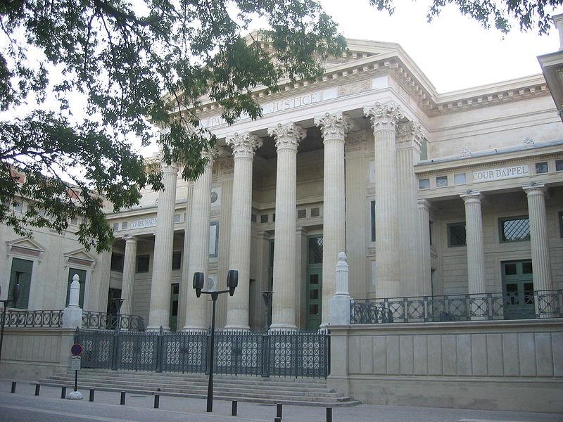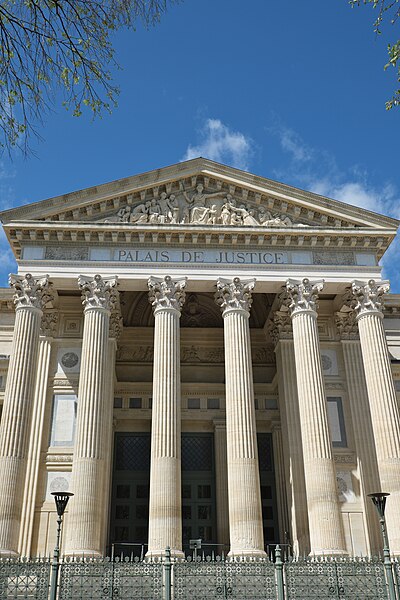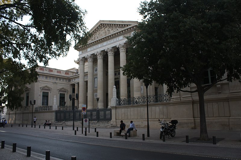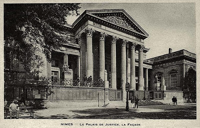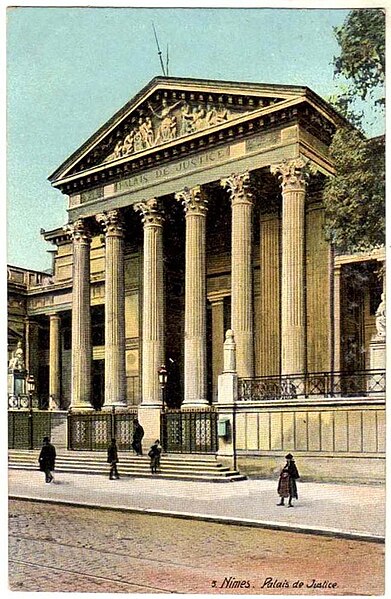 Le palais de justice de Nîmes occupe l'emplacement de l'ancienne "Maison du Roi", à la jonction de la vieille ville et des nouveaux quartiers, près des arènes romaines. Une première construction, réalisée en 1810 d'après Charles Durand, fut rapidement jugée insuffisante et remplacée. Les plans du palais actuel, dessinés par Gaston Bourdon, furent prêts en 1833 et la façade s'inspire de la Maison carrée. La première pierre fut posée en 1838; les aménagements intérieurs furent achevés en 1848. Les travaux, engagés après l'accord de Louis-Philippe qui suivit la Révolution de juillet 1830, entraînèrent un important dépassement de coût : le budget initial de 246 000 francs atteignit finalement 737 000 francs à la charge de l'État. Édifice néo-classique, le palais est un bel exemple d'architecture didactique, répondant aux critères de fonctionnalité, de symétrie et de pédagogie et doté d'un important programme iconographique. La façade s'ouvre sur l'esplanade Charles-de-Gaulle par une puissante colonnade de colonnes corinthiennes cannelées, dont l'élancement souligne une influence grecque. Le fronton et l'ensemble des sculptures extérieures sont l'œuvre de Paul Colin. Les peintures décoratives furent confiées au peintre nîmois Numa Boucoiran. Boucoiran a peint notamment les plafonds de la troisième chambre, représentant La Justice protectrice et La Justice répressive, et deux grands sujets historiques de la Chambre correctionnelle : Caracalla après le meurtre de Geta et Achille de Harlay lors de la Journée des Barricades. La décoration intérieure — boiseries, stucs, plafonds à caissons et peintures en faux marbre — a été conservée. Le bâtiment, situé au centre-ville et jouxtant les arènes, est inscrit aux monuments historiques par arrêté du 16 août 1993.