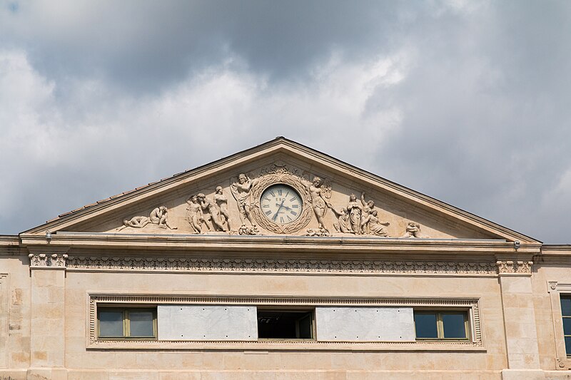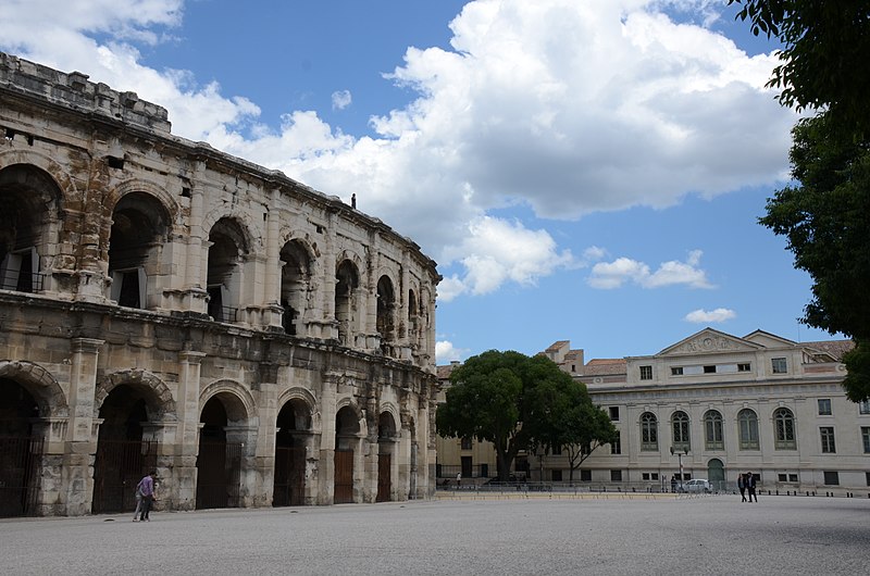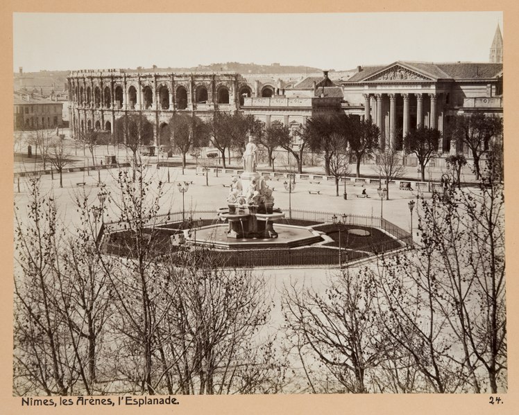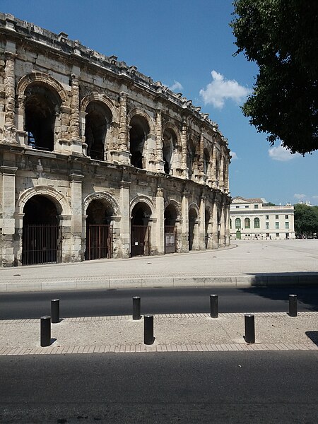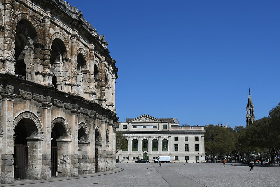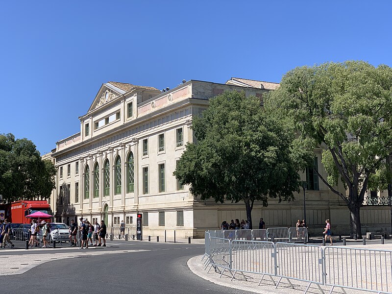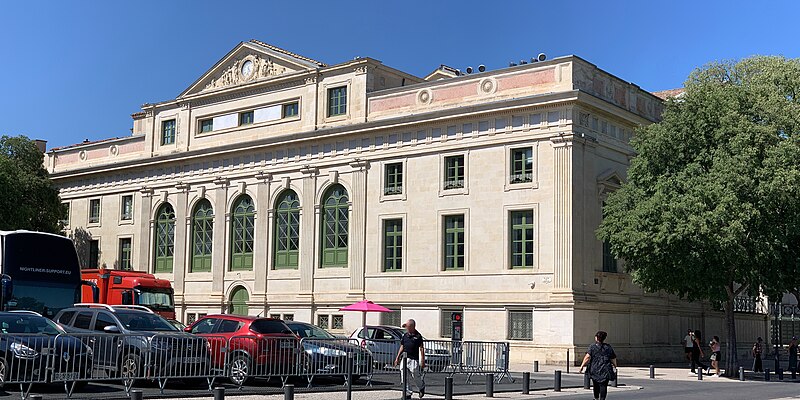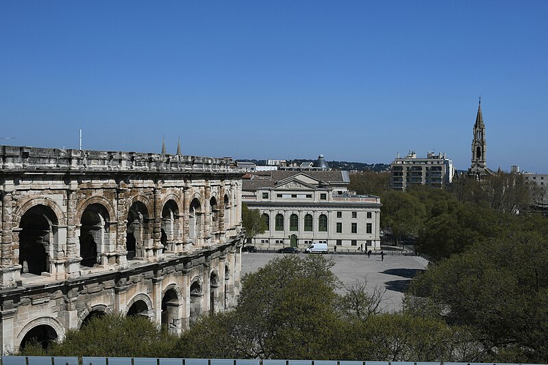 Le palais de justice de Nîmes occupe l'emplacement de l'ancienne "Maison du Roi", à la jonction de la vieille ville et des nouveaux quartiers, près des arènes romaines. Une première construction, réalisée en 1810 d'après Charles Durand, fut rapidement jugée insuffisante et remplacée. Les plans du palais actuel, dessinés par Gaston Bourdon, furent prêts en 1833 et la façade s'inspire de la Maison carrée. La première pierre fut posée en 1838; les aménagements intérieurs furent achevés en 1848. Les travaux, engagés après l'accord de Louis-Philippe qui suivit la Révolution de juillet 1830, entraînèrent un important dépassement de coût : le budget initial de 246 000 francs atteignit finalement 737 000 francs à la charge de l'État. Édifice néo-classique, le palais est un bel exemple d'architecture didactique, répondant aux critères de fonctionnalité, de symétrie et de pédagogie et doté d'un important programme iconographique. La façade s'ouvre sur l'esplanade Charles-de-Gaulle par une puissante colonnade de colonnes corinthiennes cannelées, dont l'élancement souligne une influence grecque. Le fronton et l'ensemble des sculptures extérieures sont l'œuvre de Paul Colin. Les peintures décoratives furent confiées au peintre nîmois Numa Boucoiran. Boucoiran a peint notamment les plafonds de la troisième chambre, représentant La Justice protectrice et La Justice répressive, et deux grands sujets historiques de la Chambre correctionnelle : Caracalla après le meurtre de Geta et Achille de Harlay lors de la Journée des Barricades. La décoration intérieure — boiseries, stucs, plafonds à caissons et peintures en faux marbre — a été conservée. Le bâtiment, situé au centre-ville et jouxtant les arènes, est inscrit aux monuments historiques par arrêté du 16 août 1993.