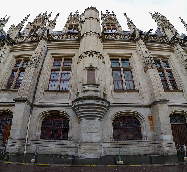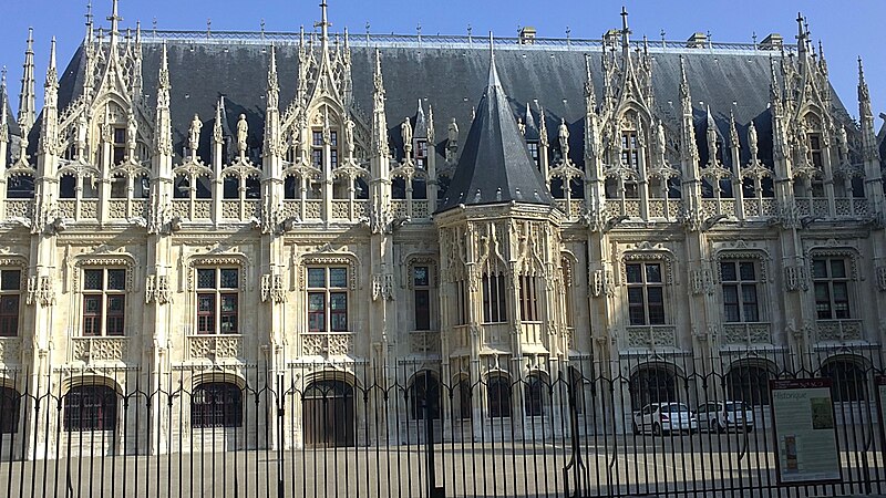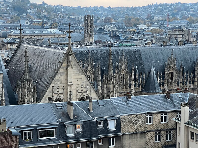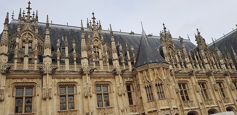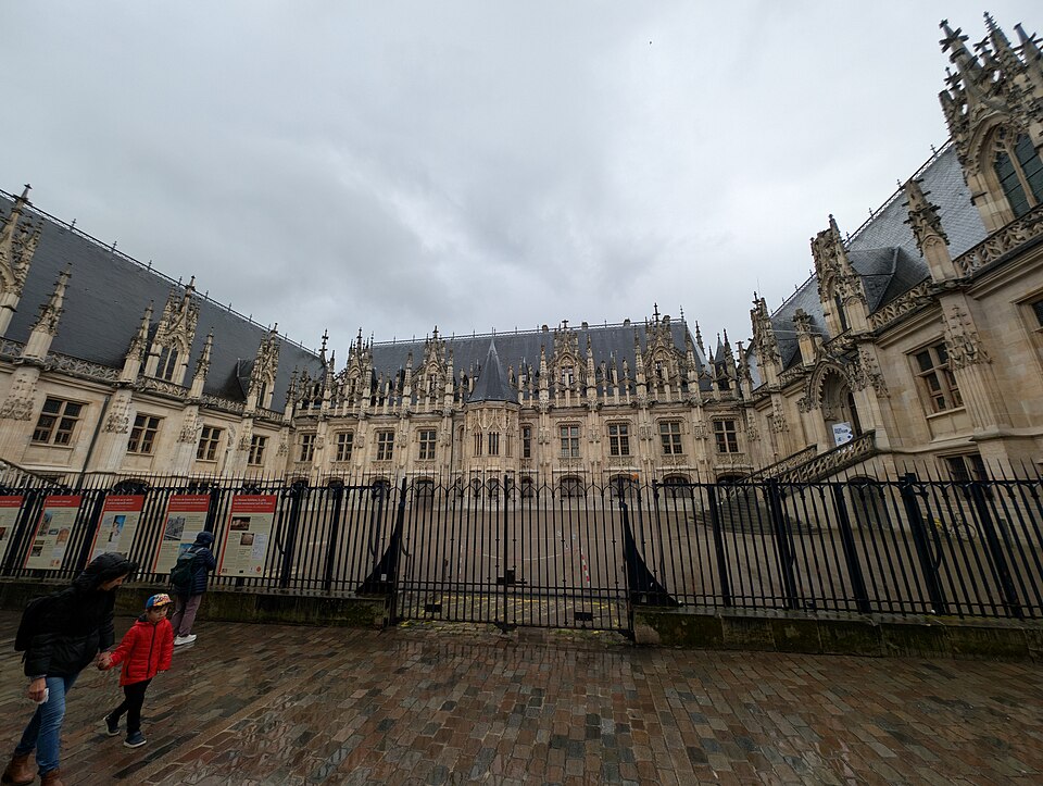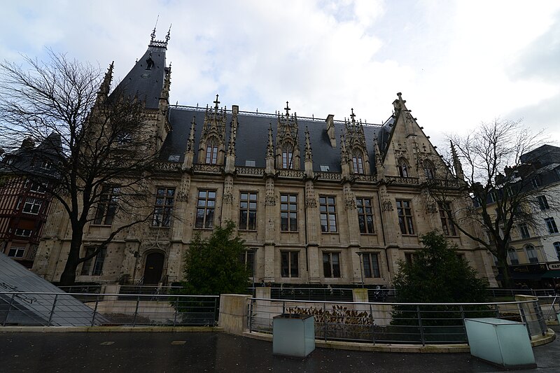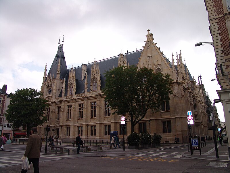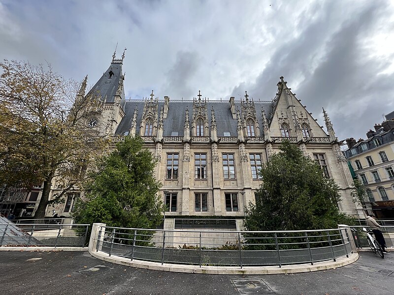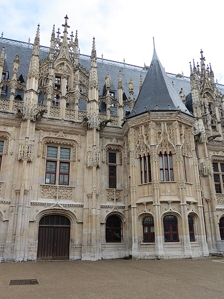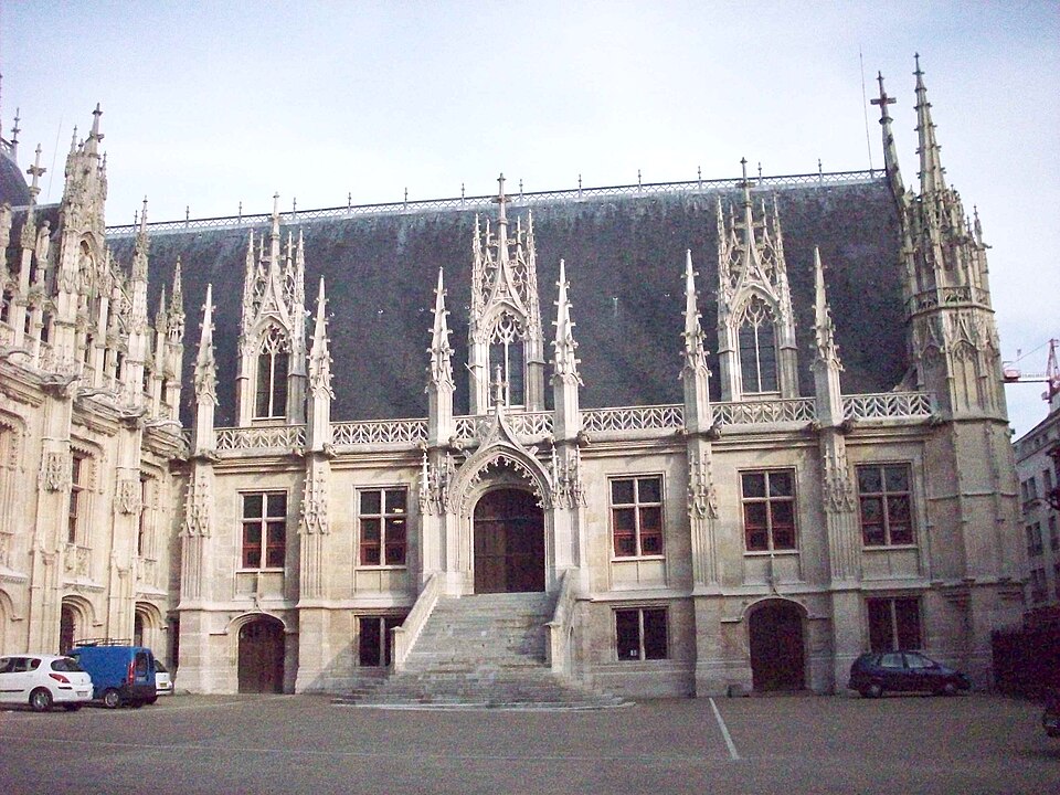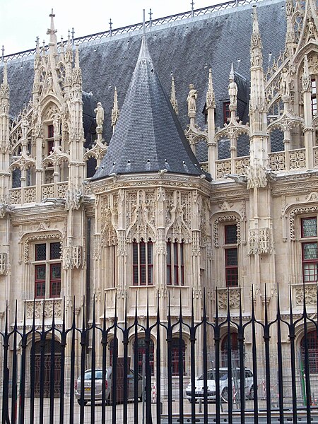 Le palais de justice de Rouen, ancien Échiquier puis Parlement de Normandie, est l’un des monuments emblématiques de la ville. Des vestiges juifs datés des XIe et XIIe siècles subsistent sur le site. En mars 1494 les conseillers décidèrent de construire au Neuf Marché une grande salle, aujourd’hui dite Salle des Procureurs ; sa réalisation, ainsi que celle de l’aile ouest, fut conduite entre 1499 et 1508 par Roger Ango et Roulland Le Roux. Le corps central, élevé au début du XVIe siècle pour le Palais royal et l’Échiquier, adopte le style Louis XII, transition entre gothique et Première Renaissance, et devient Parlement de Normandie sous François Ier avant de remplir les fonctions de palais de justice à partir de la Révolution. L’ensemble fut agrandi et modifié à plusieurs reprises : rallongement et lucarnes au début du XVIe siècle, nouveaux escaliers en 1531, créations et achèvements aux XVIIIe et XIXe siècles par Jacques II Millets‑Désruisseaux, Pierre Jarry, Alexandre Dubois, puis travaux de restauration et d’agrandissement menés au XIXe siècle par Henri Charles Grégoire et Lucien Lefort. La façade monumentale et les lucarnes rappellent l’architecture civile gothique flamboyante et la richesse décorative du style Louis XII ; l’édifice est comparé à l’hôtel de Bourgtheroulde et au bureau des Finances contemporains. Classé parmi les monuments historiques dès la liste de 1840, il a fait l’objet d’une importante restitution après les destructions de la Seconde Guerre mondiale, qui ont profondément endommagé l’aile ouest le 19 avril 1944 puis anéanti presque complètement le corps de logis central le 26 août 1944 ; seuls les murs de pierre subsistaient alors. Les intérieurs, dont la salle des Assises avec son plafond à caissons de la Renaissance et la grande salle dite des Procureurs avec sa charpente en carène renversée, ont été reconstitués à l’identique après-guerre, les charpentes ayant été remplacées par des carènes en béton pour la restitution. Certaines parties néogothiques, moins touchées, conservent volontairement des traces de dégâts comme mémoire des bombardements ; cette volonté commémorative a suscité des débats, notamment autour d’une installation en 2020. L’affaire dite « de l’escalier » au début du XXe siècle illustre les polémiques sur les restitutions : l’escalier projeté par Lucien Lefort provoqua une vive opposition et fut remplacé en 1904 par celui de Paul Selmersheim. Pour remplacer la statuaire disparue à la Révolution, Joseph Brun réalisa dès 1836 des figures représentant personnages et classes sociales liés à l’histoire du palais. Des interventions ultérieures au XIXe siècle ont ajouté des éléments néogothiques, dont la tour de l’horloge et des façades d’angle, tandis que des restaurations récentes ont poursuivi la remise en état des décors. La « Maison sublime », découverte en 1976 sous l’escalier de l’aile est et datée autour de 1100, est un rare témoignage roman lié au quartier médiéval dit du Clos aux Juifs : une inscription en hébreu, des sculptures et l’hypothèse d’une yeshiva ont été avancées, des documents d’archives citant des savants comme le Rashbam et Abraham ibn Ezra. L’expulsion des Juifs de France en 1306 interrompit son usage, la construction du palais en 1499 enfouit son premier niveau, sa découverte moderne fut suivie d’une démolition partielle par le ministère de la Justice en 1982 pour aménager des bureaux et un parking, puis d’une réouverture au public en 2022 sous l’égide de l’Office de tourisme de Rouen. Le palais conserve aussi la mémoire sociale de la ville : à la fin du XVIIIe siècle, les prisons de la Conciergerie ont servi de « dépôt des noirs » pour des esclaves au service de leurs maîtres. Des restaurations récentes du bestiaire sculpté se poursuivent, notamment des compléments de gargouilles réalisés en 2011 par les ateliers Mainponte. Le site est desservi par la station de tramway Palais de Justice – Gisèle Halimi.