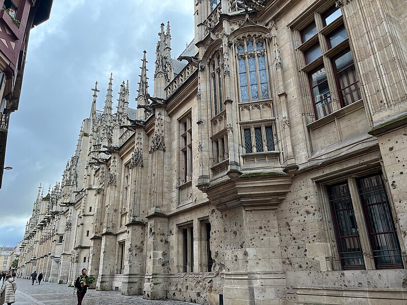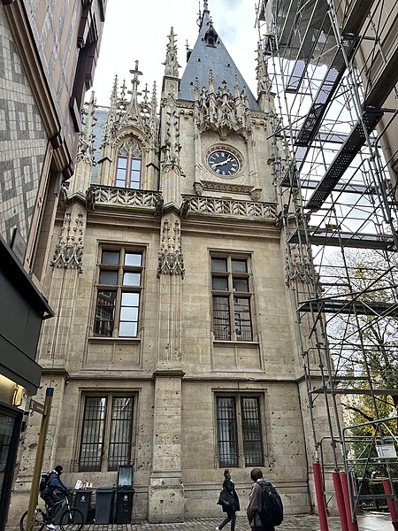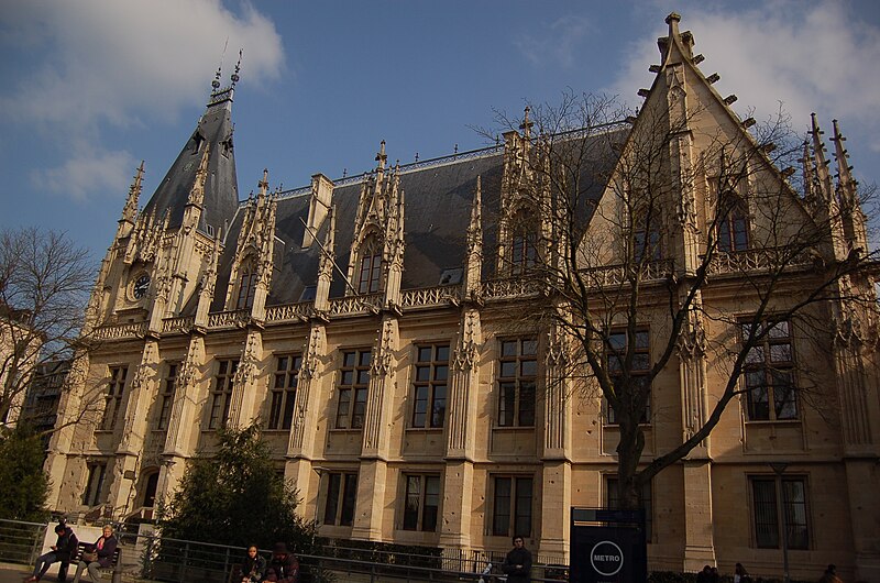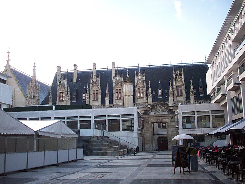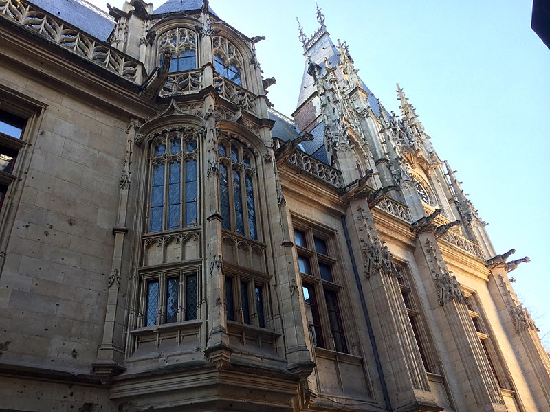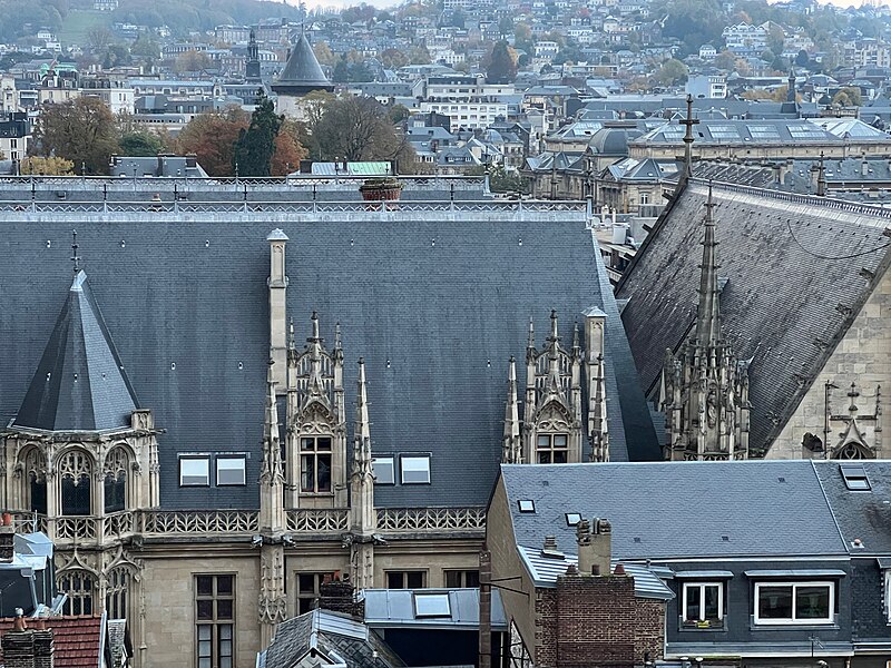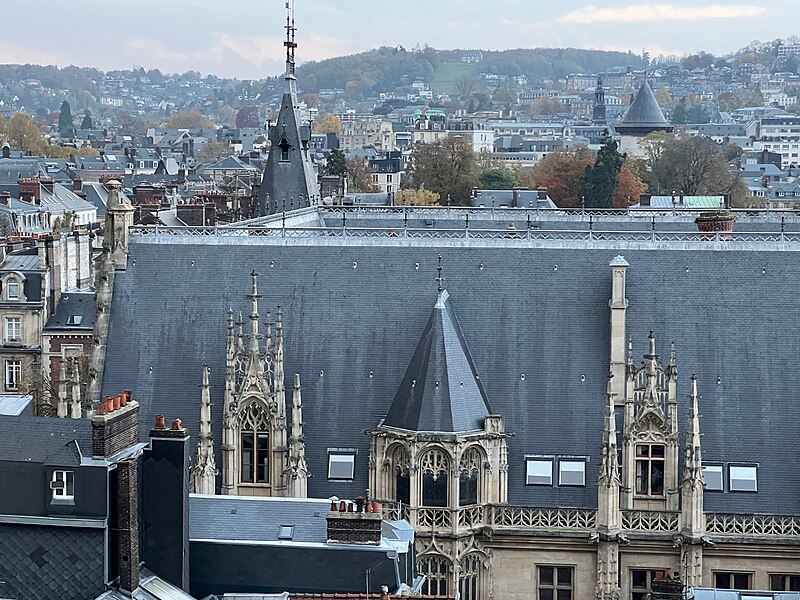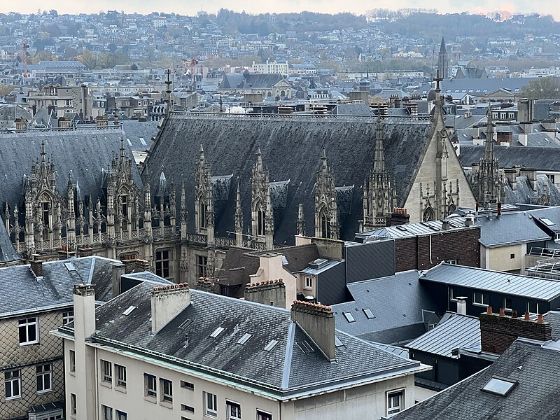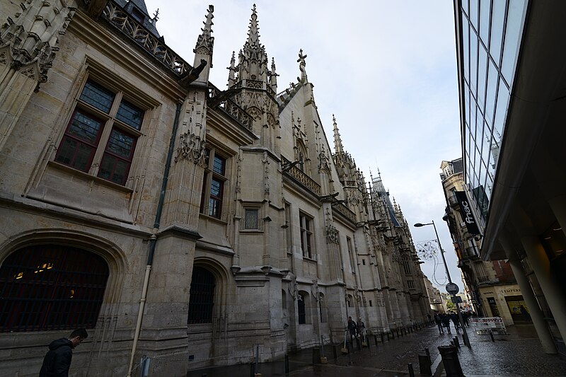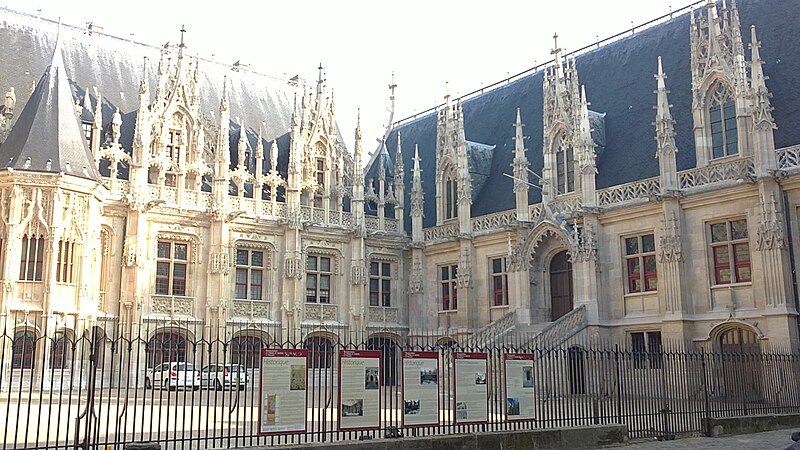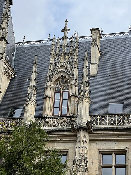 Le palais de justice de Rouen, ancien Échiquier puis Parlement de Normandie, est l’un des monuments emblématiques de la ville. Des vestiges juifs datés des XIe et XIIe siècles subsistent sur le site. En mars 1494 les conseillers décidèrent de construire au Neuf Marché une grande salle, aujourd’hui dite Salle des Procureurs ; sa réalisation, ainsi que celle de l’aile ouest, fut conduite entre 1499 et 1508 par Roger Ango et Roulland Le Roux. Le corps central, élevé au début du XVIe siècle pour le Palais royal et l’Échiquier, adopte le style Louis XII, transition entre gothique et Première Renaissance, et devient Parlement de Normandie sous François Ier avant de remplir les fonctions de palais de justice à partir de la Révolution. L’ensemble fut agrandi et modifié à plusieurs reprises : rallongement et lucarnes au début du XVIe siècle, nouveaux escaliers en 1531, créations et achèvements aux XVIIIe et XIXe siècles par Jacques II Millets‑Désruisseaux, Pierre Jarry, Alexandre Dubois, puis travaux de restauration et d’agrandissement menés au XIXe siècle par Henri Charles Grégoire et Lucien Lefort. La façade monumentale et les lucarnes rappellent l’architecture civile gothique flamboyante et la richesse décorative du style Louis XII ; l’édifice est comparé à l’hôtel de Bourgtheroulde et au bureau des Finances contemporains. Classé parmi les monuments historiques dès la liste de 1840, il a fait l’objet d’une importante restitution après les destructions de la Seconde Guerre mondiale, qui ont profondément endommagé l’aile ouest le 19 avril 1944 puis anéanti presque complètement le corps de logis central le 26 août 1944 ; seuls les murs de pierre subsistaient alors. Les intérieurs, dont la salle des Assises avec son plafond à caissons de la Renaissance et la grande salle dite des Procureurs avec sa charpente en carène renversée, ont été reconstitués à l’identique après-guerre, les charpentes ayant été remplacées par des carènes en béton pour la restitution. Certaines parties néogothiques, moins touchées, conservent volontairement des traces de dégâts comme mémoire des bombardements ; cette volonté commémorative a suscité des débats, notamment autour d’une installation en 2020. L’affaire dite « de l’escalier » au début du XXe siècle illustre les polémiques sur les restitutions : l’escalier projeté par Lucien Lefort provoqua une vive opposition et fut remplacé en 1904 par celui de Paul Selmersheim. Pour remplacer la statuaire disparue à la Révolution, Joseph Brun réalisa dès 1836 des figures représentant personnages et classes sociales liés à l’histoire du palais. Des interventions ultérieures au XIXe siècle ont ajouté des éléments néogothiques, dont la tour de l’horloge et des façades d’angle, tandis que des restaurations récentes ont poursuivi la remise en état des décors. La « Maison sublime », découverte en 1976 sous l’escalier de l’aile est et datée autour de 1100, est un rare témoignage roman lié au quartier médiéval dit du Clos aux Juifs : une inscription en hébreu, des sculptures et l’hypothèse d’une yeshiva ont été avancées, des documents d’archives citant des savants comme le Rashbam et Abraham ibn Ezra. L’expulsion des Juifs de France en 1306 interrompit son usage, la construction du palais en 1499 enfouit son premier niveau, sa découverte moderne fut suivie d’une démolition partielle par le ministère de la Justice en 1982 pour aménager des bureaux et un parking, puis d’une réouverture au public en 2022 sous l’égide de l’Office de tourisme de Rouen. Le palais conserve aussi la mémoire sociale de la ville : à la fin du XVIIIe siècle, les prisons de la Conciergerie ont servi de « dépôt des noirs » pour des esclaves au service de leurs maîtres. Des restaurations récentes du bestiaire sculpté se poursuivent, notamment des compléments de gargouilles réalisés en 2011 par les ateliers Mainponte. Le site est desservi par la station de tramway Palais de Justice – Gisèle Halimi.