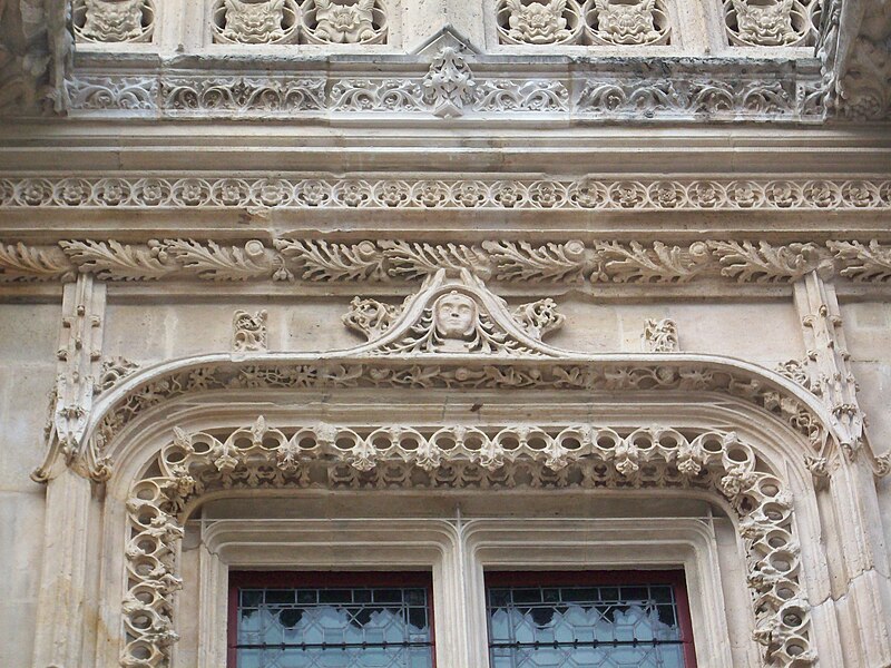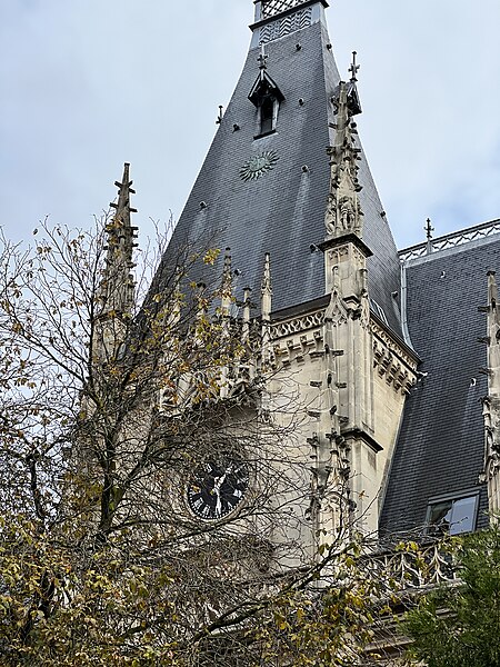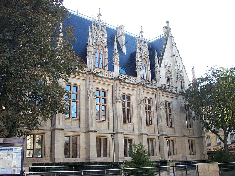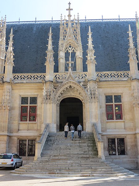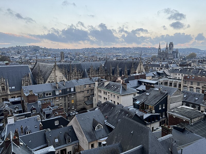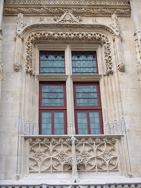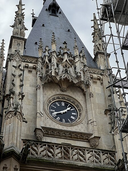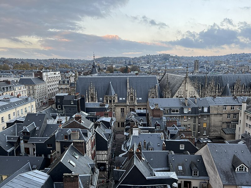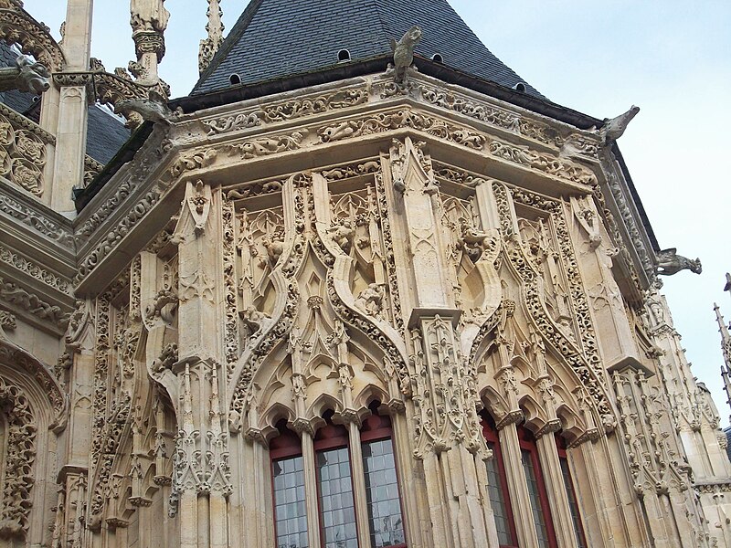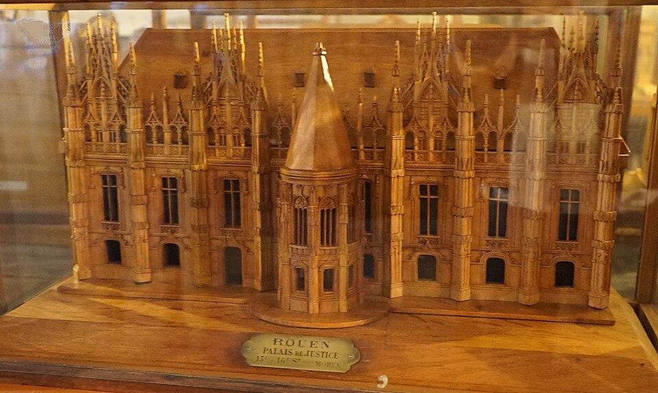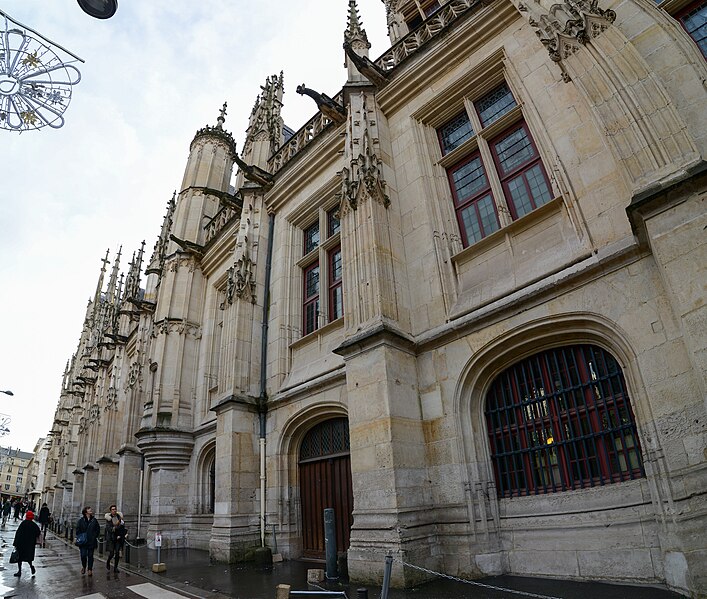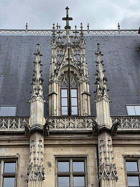 Le palais de justice de Rouen, ancien Échiquier puis Parlement de Normandie, est l’un des monuments emblématiques de la ville. Des vestiges juifs datés des XIe et XIIe siècles subsistent sur le site. En mars 1494 les conseillers décidèrent de construire au Neuf Marché une grande salle, aujourd’hui dite Salle des Procureurs ; sa réalisation, ainsi que celle de l’aile ouest, fut conduite entre 1499 et 1508 par Roger Ango et Roulland Le Roux. Le corps central, élevé au début du XVIe siècle pour le Palais royal et l’Échiquier, adopte le style Louis XII, transition entre gothique et Première Renaissance, et devient Parlement de Normandie sous François Ier avant de remplir les fonctions de palais de justice à partir de la Révolution. L’ensemble fut agrandi et modifié à plusieurs reprises : rallongement et lucarnes au début du XVIe siècle, nouveaux escaliers en 1531, créations et achèvements aux XVIIIe et XIXe siècles par Jacques II Millets‑Désruisseaux, Pierre Jarry, Alexandre Dubois, puis travaux de restauration et d’agrandissement menés au XIXe siècle par Henri Charles Grégoire et Lucien Lefort. La façade monumentale et les lucarnes rappellent l’architecture civile gothique flamboyante et la richesse décorative du style Louis XII ; l’édifice est comparé à l’hôtel de Bourgtheroulde et au bureau des Finances contemporains. Classé parmi les monuments historiques dès la liste de 1840, il a fait l’objet d’une importante restitution après les destructions de la Seconde Guerre mondiale, qui ont profondément endommagé l’aile ouest le 19 avril 1944 puis anéanti presque complètement le corps de logis central le 26 août 1944 ; seuls les murs de pierre subsistaient alors. Les intérieurs, dont la salle des Assises avec son plafond à caissons de la Renaissance et la grande salle dite des Procureurs avec sa charpente en carène renversée, ont été reconstitués à l’identique après-guerre, les charpentes ayant été remplacées par des carènes en béton pour la restitution. Certaines parties néogothiques, moins touchées, conservent volontairement des traces de dégâts comme mémoire des bombardements ; cette volonté commémorative a suscité des débats, notamment autour d’une installation en 2020. L’affaire dite « de l’escalier » au début du XXe siècle illustre les polémiques sur les restitutions : l’escalier projeté par Lucien Lefort provoqua une vive opposition et fut remplacé en 1904 par celui de Paul Selmersheim. Pour remplacer la statuaire disparue à la Révolution, Joseph Brun réalisa dès 1836 des figures représentant personnages et classes sociales liés à l’histoire du palais. Des interventions ultérieures au XIXe siècle ont ajouté des éléments néogothiques, dont la tour de l’horloge et des façades d’angle, tandis que des restaurations récentes ont poursuivi la remise en état des décors. La « Maison sublime », découverte en 1976 sous l’escalier de l’aile est et datée autour de 1100, est un rare témoignage roman lié au quartier médiéval dit du Clos aux Juifs : une inscription en hébreu, des sculptures et l’hypothèse d’une yeshiva ont été avancées, des documents d’archives citant des savants comme le Rashbam et Abraham ibn Ezra. L’expulsion des Juifs de France en 1306 interrompit son usage, la construction du palais en 1499 enfouit son premier niveau, sa découverte moderne fut suivie d’une démolition partielle par le ministère de la Justice en 1982 pour aménager des bureaux et un parking, puis d’une réouverture au public en 2022 sous l’égide de l’Office de tourisme de Rouen. Le palais conserve aussi la mémoire sociale de la ville : à la fin du XVIIIe siècle, les prisons de la Conciergerie ont servi de « dépôt des noirs » pour des esclaves au service de leurs maîtres. Des restaurations récentes du bestiaire sculpté se poursuivent, notamment des compléments de gargouilles réalisés en 2011 par les ateliers Mainponte. Le site est desservi par la station de tramway Palais de Justice – Gisèle Halimi.