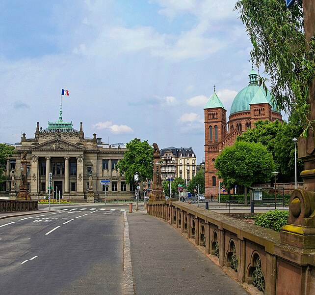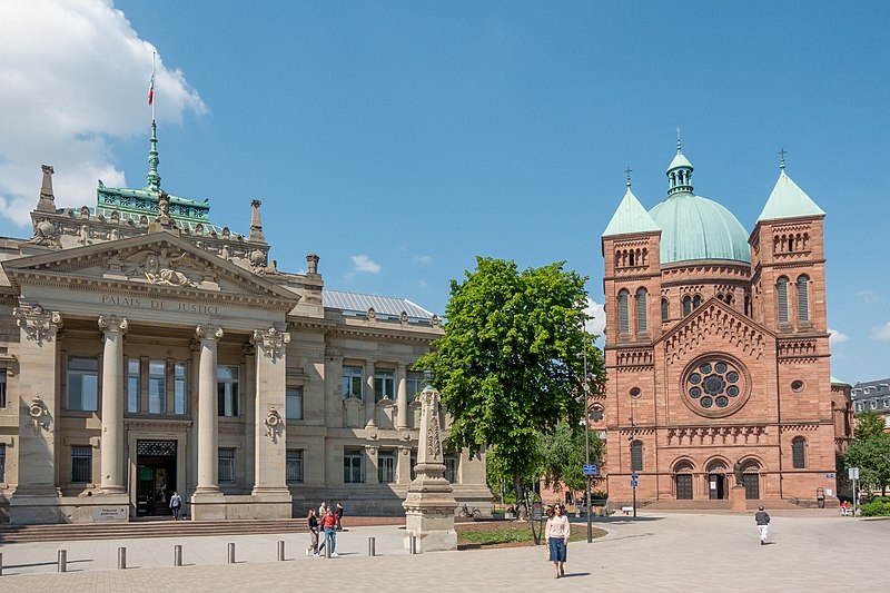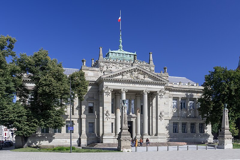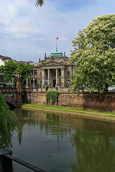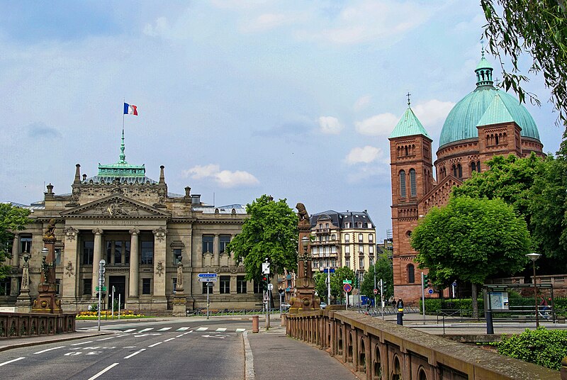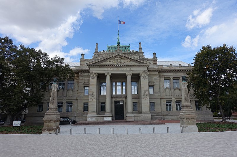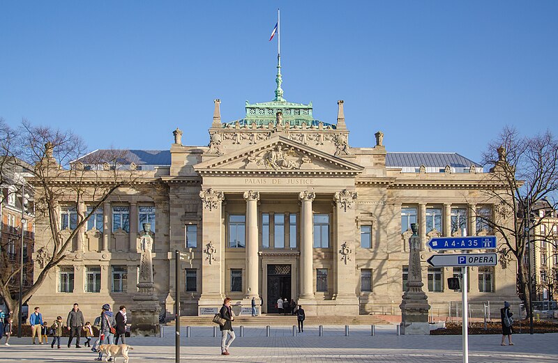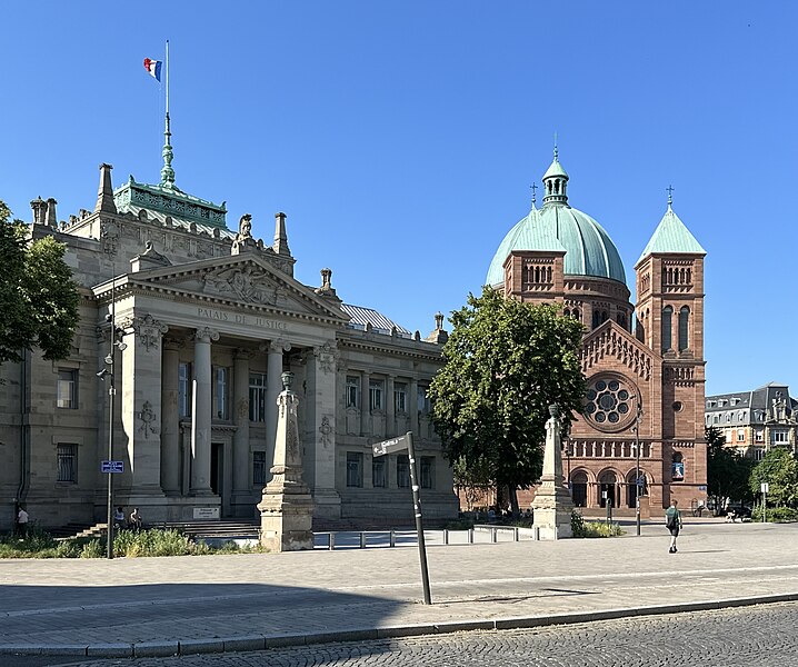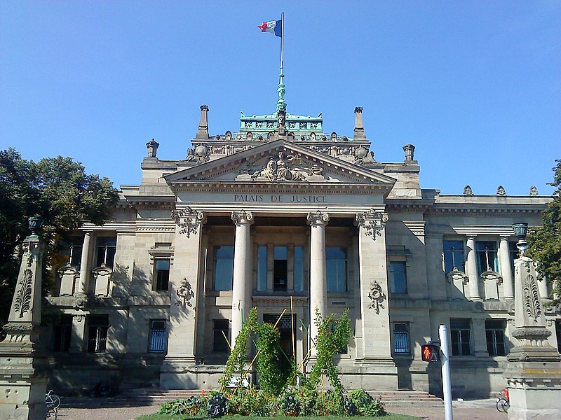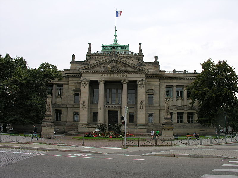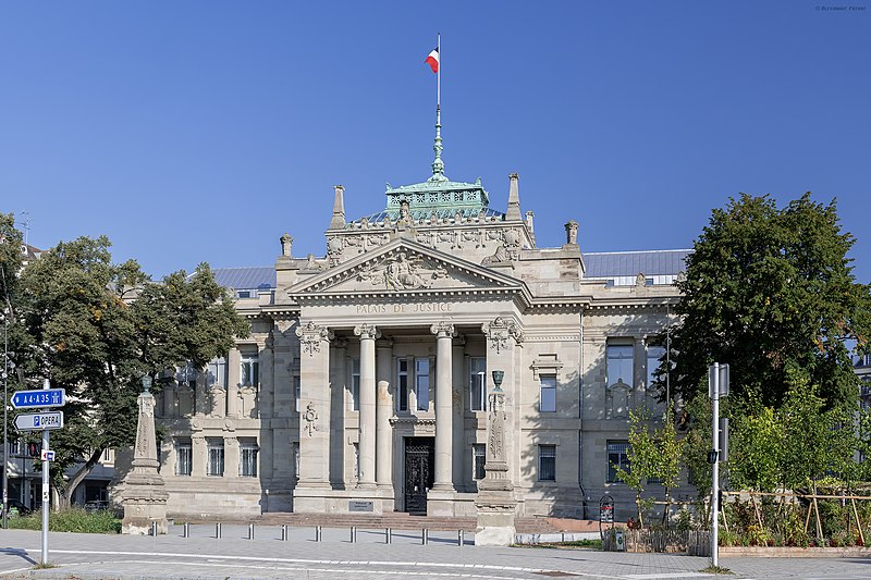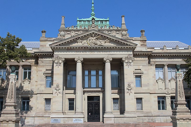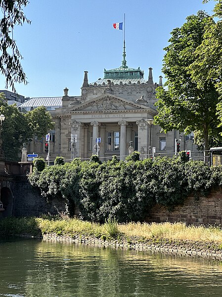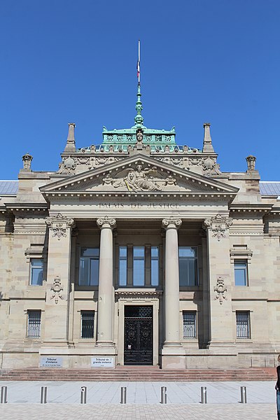 Le palais de justice de Strasbourg, siège du tribunal de grande instance, est situé quai Finkmatt dans le quartier du Tribunal de la Neustadt. Construit entre 1894 et 1897 par Skjöld Neckelmann dans le cadre de l'aménagement de la Neustadt, il remplace l'ancien tribunal installé rue de la Nuée-Bleue depuis 1789. Durant la Révolution de 1918, il a servi de siège au Soviet suprême de Strasbourg : les portraits officiels des souverains allemands ont été décrochés et le buste de l'empereur d'Allemagne remplacé par celui de Karl Marx. Le palais abritait jusqu'à récemment la cour d'assises du Bas-Rhin, le tribunal d'instance et le tribunal de grande instance ; le tribunal d'instance a depuis déménagé dans de nouveaux locaux rue du Fossé des Treize, restant dans le quartier et permettant l'extension des services judiciaires. Les façades et toitures du bâtiment d'origine, les deux pylônes devant la façade principale et la clôture de la cour, ainsi que, à l'intérieur, le vestibule d'entrée, la salle des pas-perdus avec ses escaliers et ses galeries, la salle d'audience et ses décors, sont inscrits au titre des monuments historiques par arrêté du 2 juillet 1992. Un important chantier de rénovation-réhabilitation a débuté en juin 2014 ; le projet de l'architecte catalan Jordi Garcés, choisi en 2012, a été retenu. Pendant les travaux, les services du tribunal ont été installés dans un bâtiment provisoire sur le parvis, tandis que la cour d'assises et le contentieux familial occupaient un bâtiment provisoire place d'Islande, au bout de l'avenue de la Forêt-Noire. Les travaux se sont achevés fin 2016. La remise des clefs du palais rénové à l'Agence publique pour l'immobilier de la justice a eu lieu le 8 décembre 2016 en présence du préfet du Bas-Rhin, Stéphane Fratacci ; le coût de l'opération s'est élevé à 63,2 millions d'euros. Les services du tribunal, y compris l'annexe place d'Islande, ont emménagé en février 2017, puis le parvis a été réaménagé après le démontage des bâtiments provisoires. Le palais de justice rénové a été inauguré le 6 mars 2017 par le garde des Sceaux Jean-Jacques Urvoas.