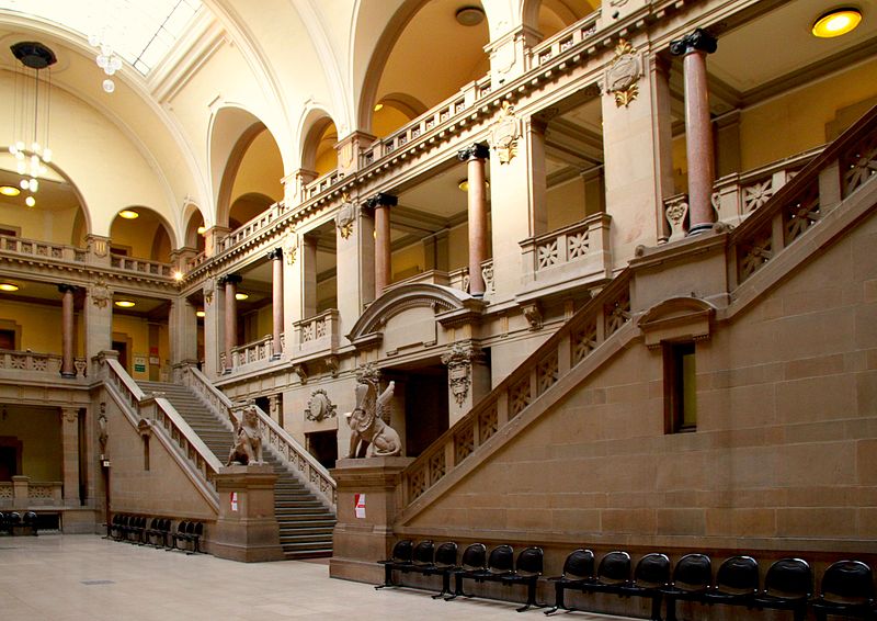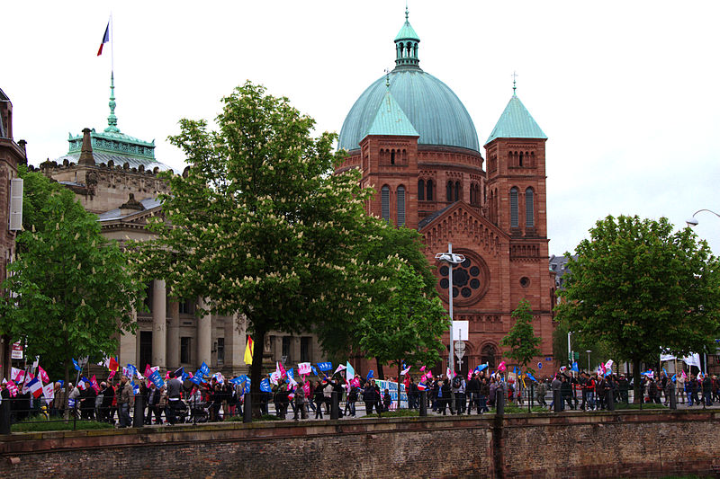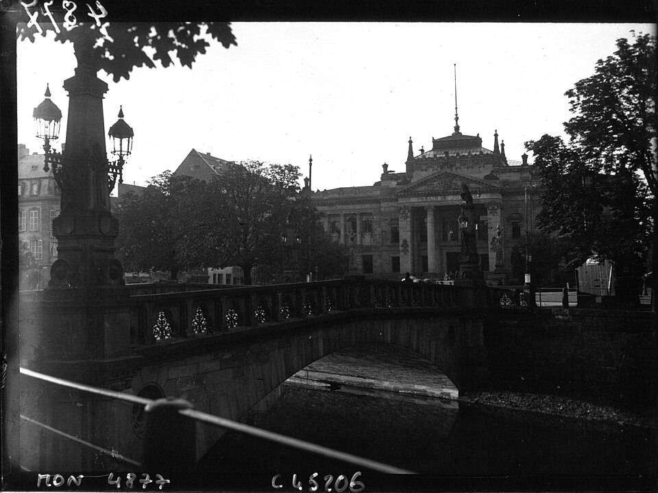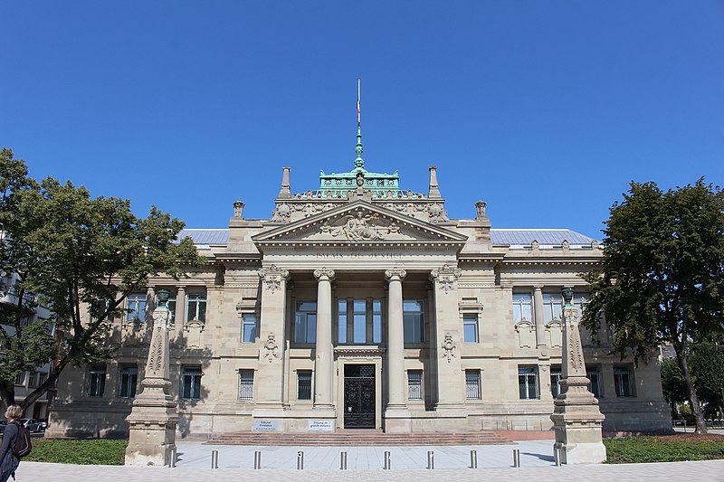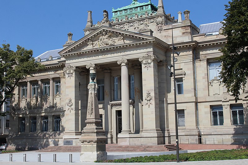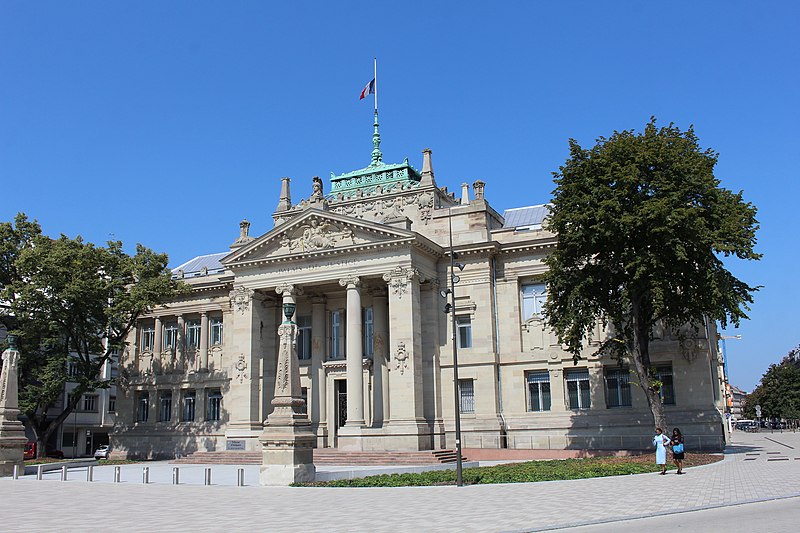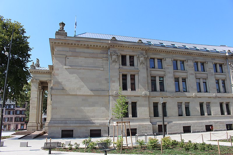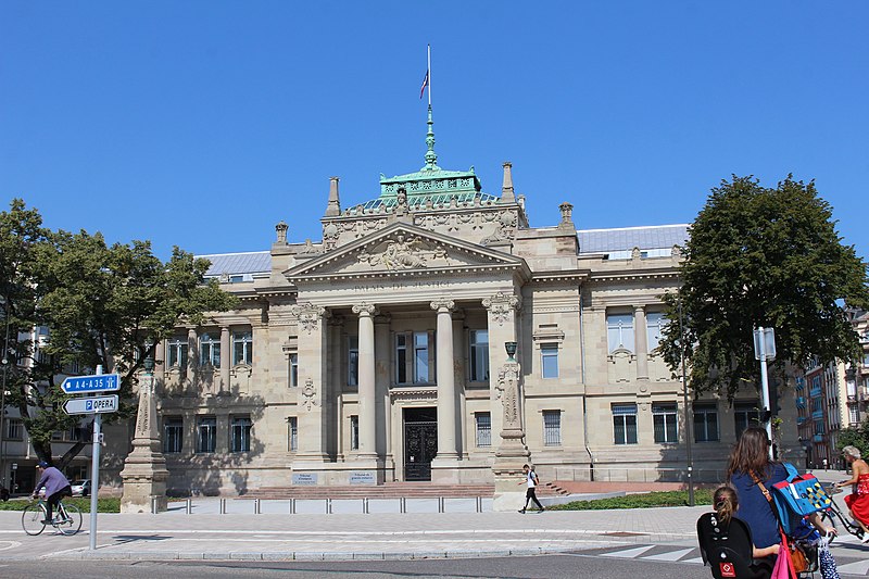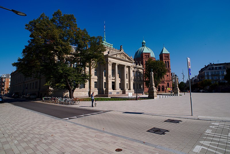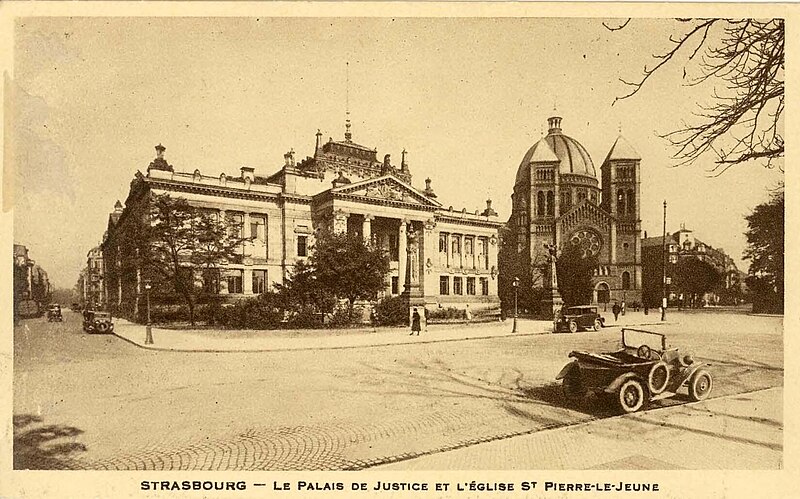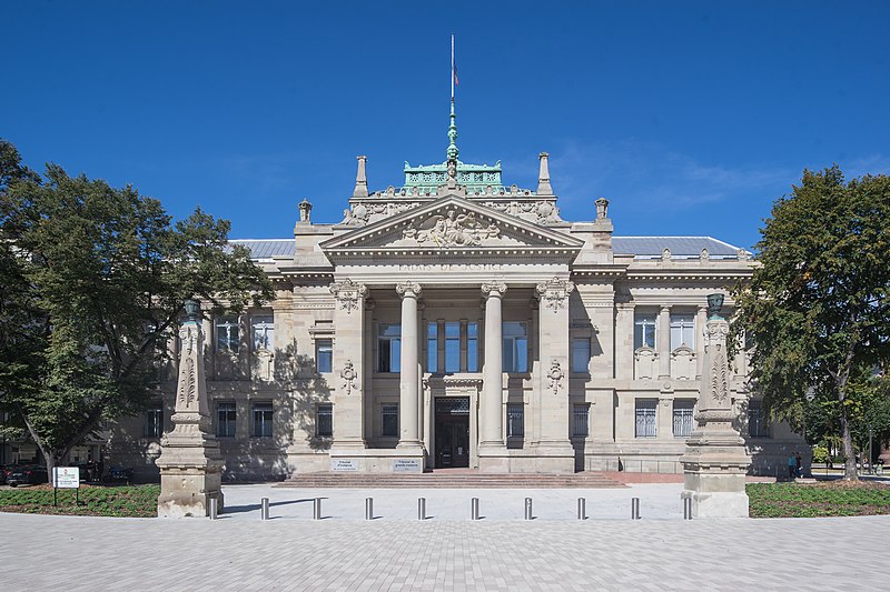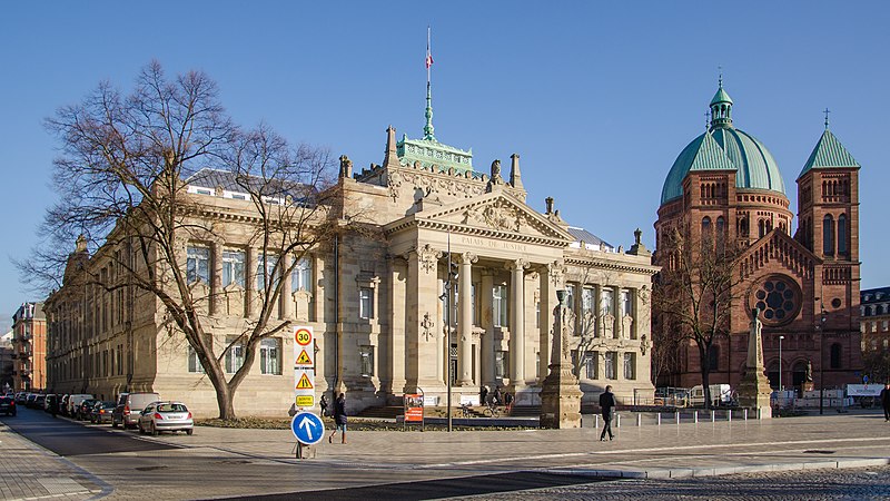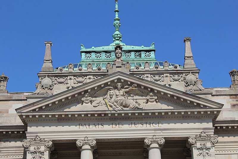 Le palais de justice de Strasbourg, siège du tribunal de grande instance, est situé quai Finkmatt dans le quartier du Tribunal de la Neustadt. Construit entre 1894 et 1897 par Skjöld Neckelmann dans le cadre de l'aménagement de la Neustadt, il remplace l'ancien tribunal installé rue de la Nuée-Bleue depuis 1789. Durant la Révolution de 1918, il a servi de siège au Soviet suprême de Strasbourg : les portraits officiels des souverains allemands ont été décrochés et le buste de l'empereur d'Allemagne remplacé par celui de Karl Marx. Le palais abritait jusqu'à récemment la cour d'assises du Bas-Rhin, le tribunal d'instance et le tribunal de grande instance ; le tribunal d'instance a depuis déménagé dans de nouveaux locaux rue du Fossé des Treize, restant dans le quartier et permettant l'extension des services judiciaires. Les façades et toitures du bâtiment d'origine, les deux pylônes devant la façade principale et la clôture de la cour, ainsi que, à l'intérieur, le vestibule d'entrée, la salle des pas-perdus avec ses escaliers et ses galeries, la salle d'audience et ses décors, sont inscrits au titre des monuments historiques par arrêté du 2 juillet 1992. Un important chantier de rénovation-réhabilitation a débuté en juin 2014 ; le projet de l'architecte catalan Jordi Garcés, choisi en 2012, a été retenu. Pendant les travaux, les services du tribunal ont été installés dans un bâtiment provisoire sur le parvis, tandis que la cour d'assises et le contentieux familial occupaient un bâtiment provisoire place d'Islande, au bout de l'avenue de la Forêt-Noire. Les travaux se sont achevés fin 2016. La remise des clefs du palais rénové à l'Agence publique pour l'immobilier de la justice a eu lieu le 8 décembre 2016 en présence du préfet du Bas-Rhin, Stéphane Fratacci ; le coût de l'opération s'est élevé à 63,2 millions d'euros. Les services du tribunal, y compris l'annexe place d'Islande, ont emménagé en février 2017, puis le parvis a été réaménagé après le démontage des bâtiments provisoires. Le palais de justice rénové a été inauguré le 6 mars 2017 par le garde des Sceaux Jean-Jacques Urvoas.