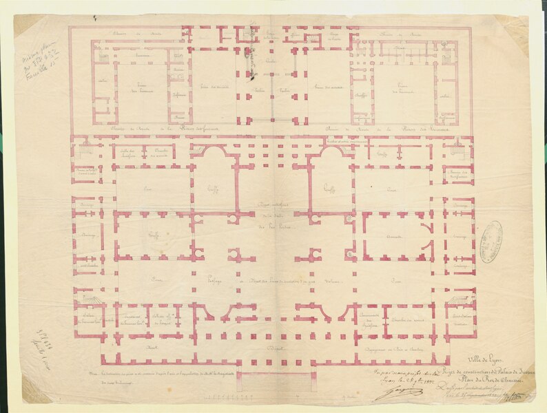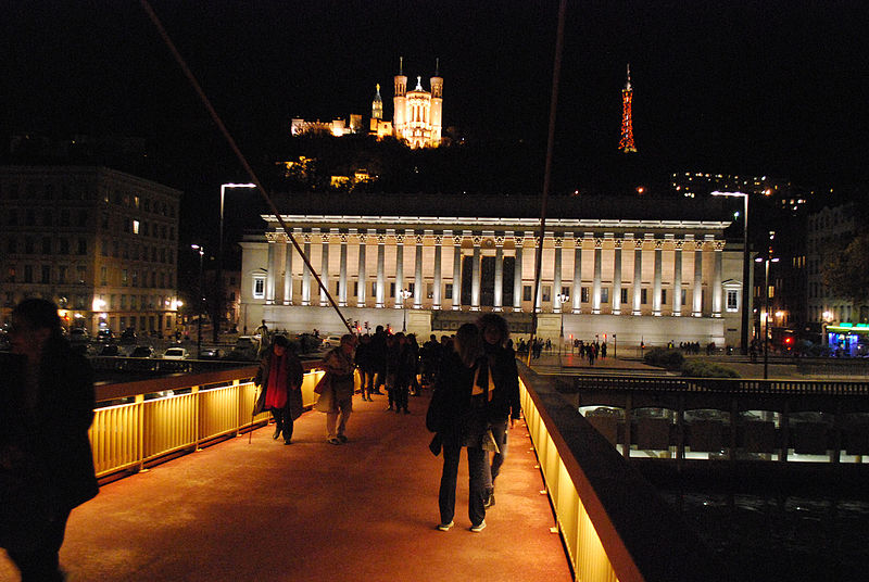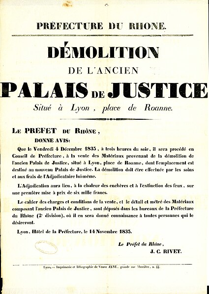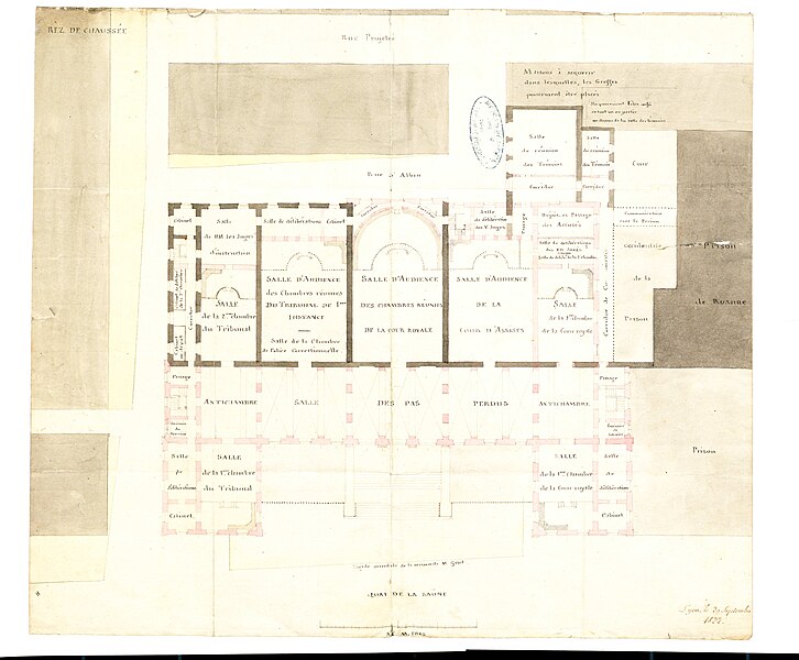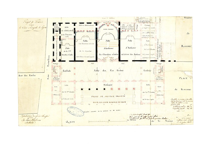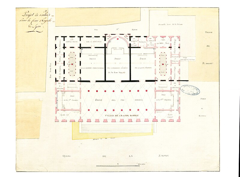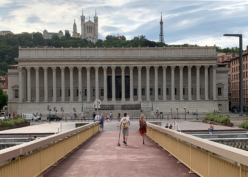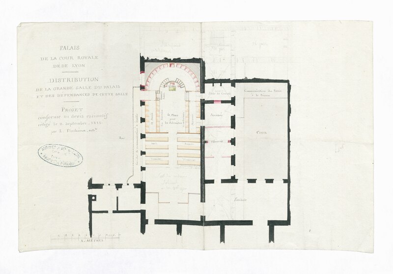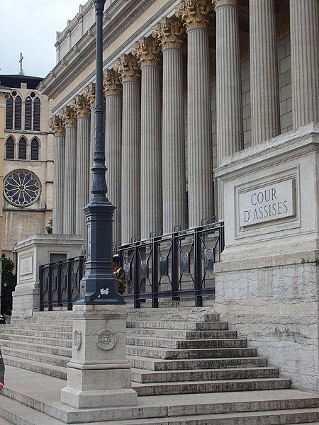 Le palais de justice historique de Lyon, situé quai Romain‑Rolland sur la rive droite de la Saône, dans le 5e arrondissement au cœur du Vieux Lyon, possède un décor intérieur classé monument historique. Surnommé « Les vingt‑quatre colonnes » en raison de ses nombreuses colonnes en façade, il abrite la cour d'assises du Rhône, les services de la cour d'appel de Lyon et le service administratif interrégional judiciaire Centre‑Est. Depuis le rattachement de Lyon à la France, le pouvoir royal y installe une sénéchaussée d'abord dans la « maison de Roanne », puis, à partir du XVe siècle, une maison de justice ; incendiée en 1622, celle‑ci fut remplacée par un premier palais de justice, le palais de Roanne, qui tomba en ruine à la fin du XVIIIe siècle. Une réforme de la carte judiciaire lance en 1828 un projet de reconstruction ; le terrain est acquis et l'architecte Louis‑Pierre Baltard, père de Victor Baltard et auteur d'ouvrages lyonnais tels que le grenier à sel, la prison et l'arsenal, remporte le concours. Les travaux commencent en 1835 ; le palais est inauguré en 1845 et les chantiers se prolongent jusqu'en 1847, année où Jean‑François Legendre‑Héral exécute le bas‑relief La Ville de Lyon accueille les Arts, l'Industrie et l'Agriculture. Conçu dans un style plus néo‑antique que néo‑classique, l'édifice répond aux canons du siècle en étant majestueux et imposant, ouvert au public et apte à recevoir de nombreuses audiences ainsi que des détenus. L'architecture intérieure est demeurée largement intacte et son décor est classé monument historique. Le palais est bâti en pierre de taille appareillée, avec des charpentes en bois ; les pierres proviennent des carrières de Villebois, Tournus, Crussol et Cruas. Côté rue Saint‑Jean, les sculptures représentant La Force et La Justice, ainsi que les deux médaillons qui les surmontent, ont été taillées dans la pierre de Seyssel par François Félix Roubaud entre 1857 et 1862. La vaste salle des pas perdus, hall d'entrée conduisant aux salles d'audience, couvre 625 m2 et atteint 17 m de hauteur. Elle accueille deux bas‑reliefs : celui de Jean‑François Legendre‑Héral, en pierre de Seyssel, représentant La ville de Lyon accueillant les Beaux‑Arts, le Commerce, l'Industrie et l'Agriculture, et celui de Guillaume Bonnet, intitulé La Justice punissant le Crime. En 1995 l'ouverture d'un nouveau palais de justice à la Part‑Dieu a permis le transfert du tribunal de grande instance, du tribunal d'instance et du tribunal de commerce, tandis que la cour d'appel de Lyon et la cour d'assises du Rhône sont restées dans le palais historique. Une rénovation profonde menée à partir de 2008 a modernisé les locaux, amélioré l'accueil du public et l'accessibilité aux personnes à mobilité réduite, renforcé la sécurité et les conditions de travail ; les travaux se sont achevés en mai 2012. Le chantier a coûté 44,85 millions d'euros financés par le ministère de la Justice et 4,8 millions d'euros par le conseil général du Rhône, et le palais a rouvert lors de l'audience de rentrée solennelle de la cour d'appel le 14 janvier 2013. Plusieurs procès célèbres s'y sont tenus : en août 1894 Sante Geronimo Caserio y fut condamné à mort pour l'assassinat du président Sadi Carnot ; en janvier 1945 Charles Maurras y fut condamné à la réclusion à perpétuité et à la dégradation nationale pour intelligence avec une puissance ennemie ; en juillet 1987 Klaus Barbie y fut condamné à la réclusion criminelle à perpétuité pour crimes contre l'humanité commis en 1943 et 1944 — pour ce procès la salle des pas perdus fut aménagée par le cabinet Eyraud, Traynard et associés en une salle d'assises de 750 places — ; et en juin 1989 la branche lyonnaise du groupe Action directe (André Olivier, Max Frérot et Émile Ballandra) fut condamnée à la réclusion criminelle à perpétuité pour trente‑quatre attaques à main armée et trois homicides volontaires. Une plaque commémorative dans la salle des pas perdus évoque le juge François Renaud, assassiné le 3 juillet 1975, qui fut juge d'instruction au palais à partir de la fin 1972. La scène finale du film Tout ça... Pour ça ! (1992) de Claude Lelouch y a été tournée.