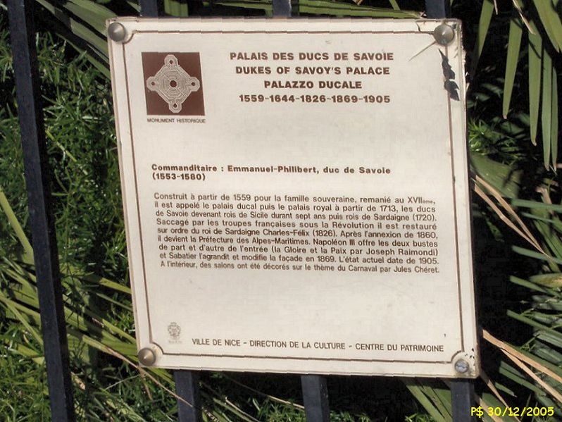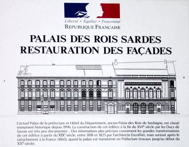 Le palais de la Préfecture, ancien palais des rois de Sardaigne, situé dans le Vieux-Nice, abrite aujourd'hui la préfecture des Alpes-Maritimes et la résidence du préfet. Jusqu'au rattachement du comté de Nice à la France en 1860, il fut la résidence des ducs de Savoie puis des rois de Piémont-Sardaigne. Construit à partir du milieu du XVIe siècle comme palais ducal, il a été profondément transformé aux XVIIe, XIXe et XXe siècles ; seuls le passage cocher et l'escalier d'honneur, édifiés par Jean-Antoine Scoffier en 1818, subsistent de l'édifice originel. Les premières campagnes de travaux mentionnées concernent la période 1571–1573 sous la direction de Cesare Ponsello, avec l'aménagement du jardin et la création d'un canal d'irrigation ramenant des eaux du Paillon. Le palais fut ensuite reconstruit et agrandi sous Charles-Emmanuel Ier, formant une bâtisse massive attestée sur une vue de 1610 et partiellement inaugurée en 1613, puis élargi au milieu du XVIIe siècle. Au XVIIIe siècle, les souverains de Sardaigne achetèrent une partie du couvent des Dominicains pour accroître la capacité du palais ; Bernardo Spinetta dessina en 1738 une porte d'accès au Boschetto. Après le saccage de 1792, le palais servit d'hôpital militaire pendant plusieurs années et le jardin ainsi que le couvent disparurent en 1796. En 1814, lors de la restauration sarde, Victor-Emmanuel Ier confia à Scoffier l'harmonisation de la façade, la reconstruction du vestibule et de l'escalier d'honneur ; ces travaux s'étendirent de 1818 à 1825 et les appartements royaux furent dotés de mobilier prélevé dans les palais de Turin et de Gênes. La remise officielle du comté de Nice au gouvernement de Napoléon III eut lieu dans les salons du palais le 14 juin 1860. Par décret du 21 novembre 1860, la résidence royale devint le siège de la préfecture des Alpes-Maritimes et fut progressivement adaptée pour réunir fonctions administratives, résidentielles et de réception. De 1862 à 1910, de larges campagnes de transformation furent menées pour en faire un lieu de représentation : Sabatier agrandit l'édifice vers l'est et l'ouest entre 1862 et 1869, puis la démolition de l'ancien couvent en 1892 permit de nouveaux empiètements vers l'ouest. La salle des fêtes fut dessinée entre 1892 et 1896 d'après les plans d'Auguste Dieudé-Défly et sous la direction de Lucien Barbet ; la sculpture "Nice se donnant à la France" est due à Henri Lombard et les peintures à Henri Leriche et Matton. La façade nord fut reprise en 1892-1893 ; de 1905 à 1908 Lucien Barbet mena l'agrandissement sud-est, édifia une nouvelle façade devant l'ancienne et remania entièrement l'aile est, permettant l'aménagement de la galerie Jules-Chéret et de la salle du Conseil général avec un escalier décoré par Martin-Sauvaigo. La grande galerie est ornée de toiles marouflées sur le thème du Carnaval et des fêtes niçoises réalisées par Jules Chéret entre 1906 et 1908 ; la décoration de la salle des fêtes illustre l'éclectisme stylistique de la Troisième République. L'aile ouest comprend un jardin d'hiver ; après les transformations fin XIXe–début XXe siècle, seuls le vestibule et l'escalier d'honneur rappellent l'ancien palais ducal. La salle à manger fut aménagée en 1958-1959 par Jansen dans un style qualifié "à la vénitienne" et, en 1960, le général de Gaulle y séjourna et présida un dîner de gala à l'occasion du centenaire de l'annexion. Les services administratifs furent ensuite transférés vers la plaine du Var, les derniers départs datant de 1983, mais le palais resta la résidence du préfet et du président du conseil général et un lieu de cérémonies officielles. La salle à manger accueillit la signature du traité de Nice en février 2001 en présence du président Jacques Chirac et du Premier ministre Lionel Jospin, et le palais a également servi pour l'ouverture du sommet Russie‑Union européenne le 14 novembre 2008. L'édifice a été inscrit au titre des monuments historiques le 29 juin 1994 et partiellement classé le 3 septembre 1996 ; la protection porte notamment sur le passage cocher, les façades et toitures, l'escalier d'honneur, l'appartement du premier étage et plusieurs espaces du conseil général. Construit en pierres enduites, le palais se reconnaît à sa façade à fenêtres à colonnes ; la décoration intérieure associe sculptures, peintures et toiles marouflées qui témoignent des différentes campagnes de décor. Parmi les éléments remarquables figurent la statue "Nice se donnant à la France", des décors d'armoiries, le plafond de la salle des fêtes et la vue depuis le balcon sur le cours Saleya. Aujourd'hui, le palais demeure le siège de la préfecture des Alpes-Maritimes, la résidence du préfet et du président du conseil général, et il continue d'accueillir réceptions et cérémonies officielles.