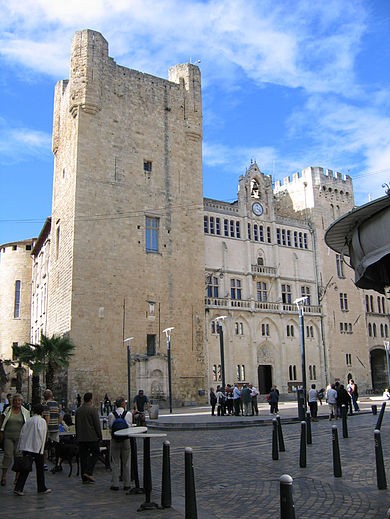 Le palais des archevêques est un vaste ensemble architectural situé au cœur de Narbonne, dans l'Aude. Élevé probablement sur l'emplacement du capitole de la ville romaine, il constitue, après le palais des papes d'Avignon, l'une des résidences les plus importantes des princes de l'Église. Le palais archiépiscopal est relié à la cathédrale actuelle, fondée en 1272, par un cloître bâti par l'archevêque Pierre de La Jugie dans la seconde moitié du XIVe siècle. En 1308, l'archevêque Gilles Ier Aycelin de Montaigut fit édifier la grosse tour carrée servant de donjon. Pierre de La Jugie éleva entre le cloître et cette tour des bâtiments comprenant plusieurs tours rondes, des logis, une grande salle et une autre tour carrée faisant pendant au donjon. L'ensemble du palais et ses abords a été classé monument historique en 1840. Le palais se compose d'un Palais Vieux d'origine romane et d'un Palais Neuf de style gothique; sa façade présente trois tours carrées des XIIIe et XIVe siècles. Depuis le XIXe siècle, il abrite la mairie, le musée d'art et d'histoire et le musée archéologique. Le Palais Vieux conserve notamment une cour intérieure, une entrée monumentale, un grand escalier et des éléments défensifs comme la tour nord du mur d'enceinte. Le Palais Neuf comprend le cloître et la salle des Synodes; une représentation dessinée par Eugène Viollet‑le‑Duc est également associée à cet ensemble. Parmi les références figurent Le guide du patrimoine Languedoc Roussillon dirigé par Jean‑Marie Pérouse de Montclos et Languedoc‑Roussillon gothique de Lucien Bayrou. Des ressources en ligne et des inventaires — Inventaire Occitanie, bases Mérimée et Structurae — complètent les notices et renvoient aux listes des monuments historiques de l'Aude et de Narbonne ainsi qu'à la liste des archevêques de Narbonne.
