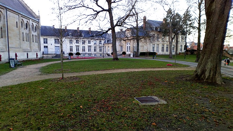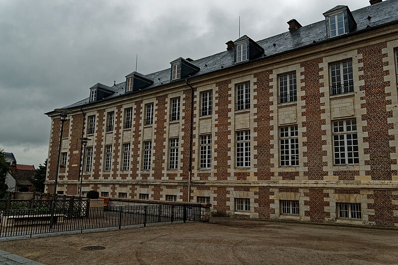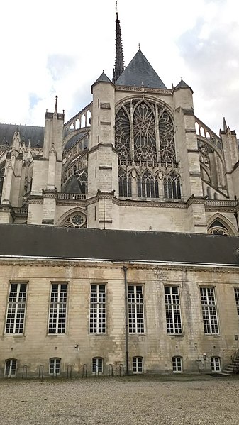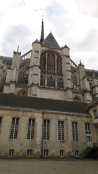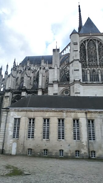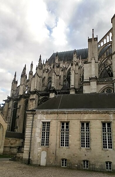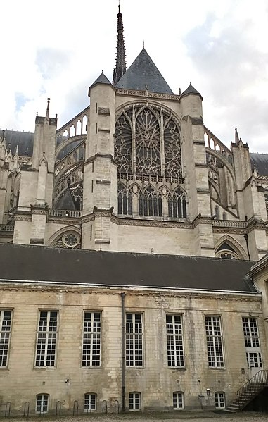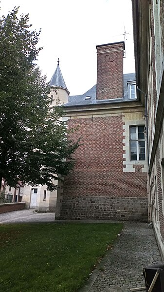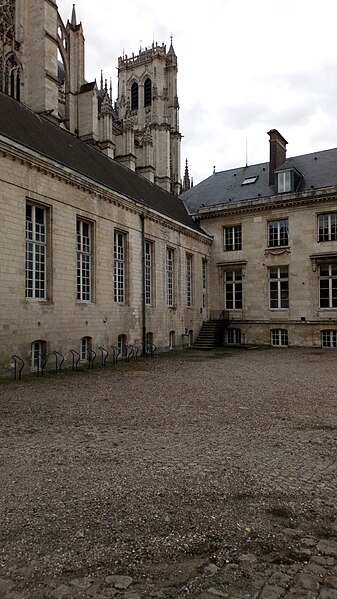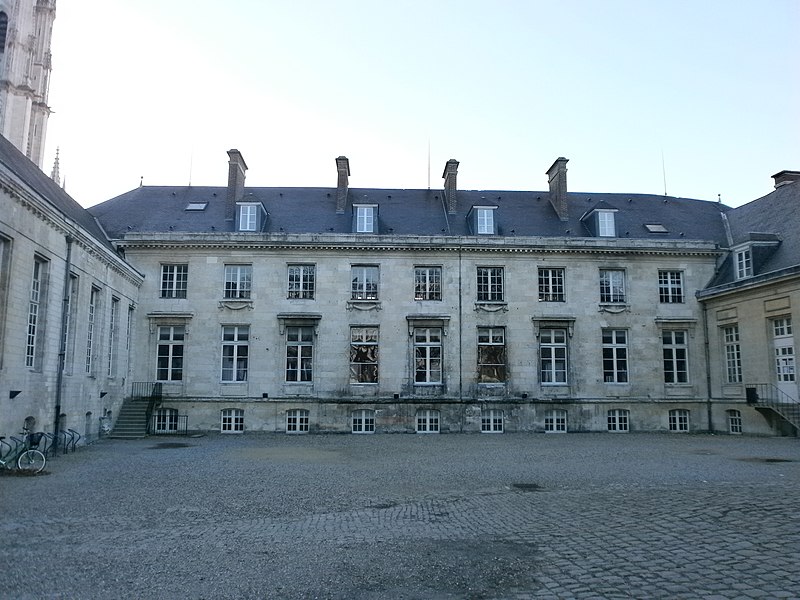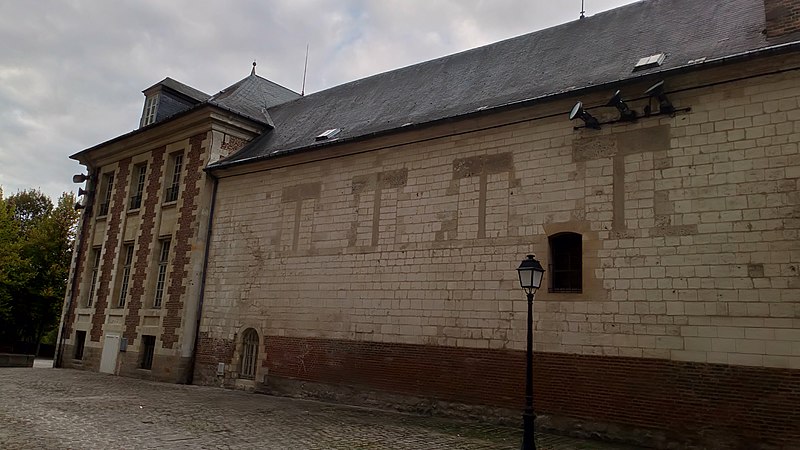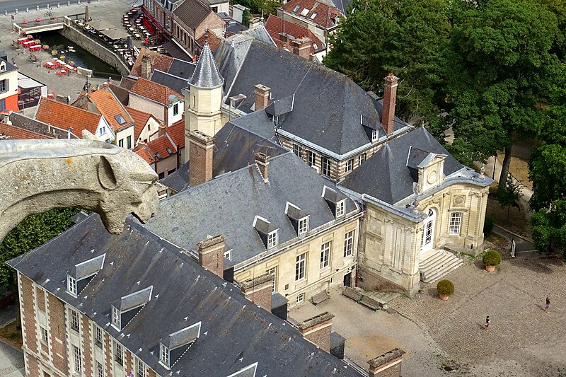 L'ancien évêché d'Amiens, situé dans le parc de l'Évêché près de la cathédrale Notre‑Dame, est l'ancienne résidence des évêques de la ville. Bâti au XIIIe siècle au fond d'un parc, il jouxte la face nord de la cathédrale et fut occupé par l'évêque et ses services jusqu'en 1906. En 1508, les célèbres stalles du chœur, chef‑d'œuvre de sculpture sur bois comportant 4 700 figurines, furent sculptées dans un atelier de l'évêché par six maîtres huchiers, ajustées sur place et assemblées par tenons et mortaises entre 1508 et 1519; deux stalles maîtresses de 13,50 m, destinées respectivement à l'évêque et au roi, furent financées par le doyen Adrien de Hénencourt. L'évêque de l'époque, François de Halluin, fit refaire la flèche de la cathédrale entre 1528 et 1530 et fut ensuite tué par un sanglier, selon les sources mentionnées. Le palais, édifié en même temps que la cathédrale, connut une première destruction à la fin du XVIIe siècle puis fut presque entièrement reconstruit par François Lefebvre de Caumartin au cours du XVIIe siècle. Le roi Louis XIII y logea en 1638 et Louis XIV y séjourna en 1667. Un incendie menaça gravement le palais le 19 décembre 1762 et le logis de l'évêque Louis‑François‑Gabriel d'Orléans de la Motte fut complètement brûlé; à droite du péristyle se trouvait alors une chapelle qui fut détruite en 1802 sous l'épiscopat de Jean de Villaret. Conformément à la loi de nationalisation des biens de l'Église, la cathédrale et le palais passèrent à l'État après 1789; l'évêché fut successivement occupé par des évêques nommés en vertu de la constitution civile du clergé jusqu'au Concordat de 1801. Le palais reçut encore Bonaparte, alors Premier Consul, en 1803, puis Napoléon III pour l'inauguration de la chapelle Sainte‑Théudosie en 1854. La fonction épiscopale cessa le 17 janvier 1906 à la suite de la loi de séparation des Églises et de l'État: Jean‑Marie Dizien dut quitter la demeure, l'évêché étant transféré rue de Constantine, aujourd'hui rue Jean‑XXIII. Longtemps laissé à l'abandon, le bâtiment hébergea divers services municipaux; il aurait été proposé par le général de Gaulle en 1945 pour réaffectation au diocèse, proposition que Lucien Martin aurait refusée. Après 1946, l'ancien évêché accueillit l'École de médecine, l'École de droit et un bureau de bienfaisance. Par arrêté du 16 décembre 1965, les façades et toitures de l'ensemble des bâtiments ainsi que le jardin furent inscrits au titre des monuments historiques. En 1966, l'École supérieure de commerce d'Amiens s'y installa; aujourd'hui les locaux abritent le Groupe Sup de Co Amiens Picardie. Le bâtiment, en brique et pierre, a la forme d'un L dont l'extrémité orientale est occupée par l'entrée d'honneur. Le péristyle, reconstruit par François Faure et portant la date 1684 sur son fronton, assure la desserte des bâtiments et bénéficie depuis peu d'une illumination. Le corps de logis qui borde à l'est le bas parvis fut élevé au XVIIIe siècle par Louis‑Charles de Machault d'Arnouville, dernier évêque avant la Révolution.