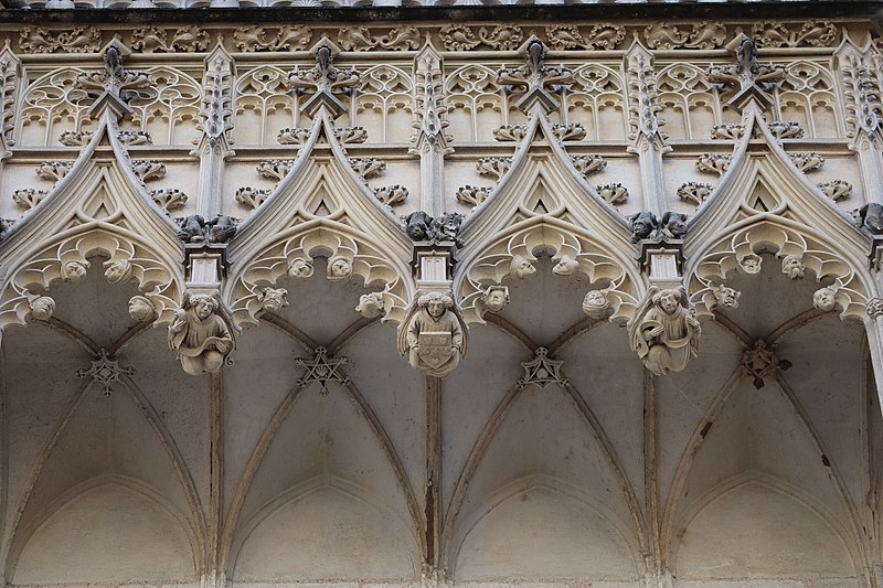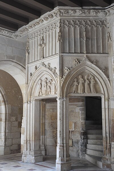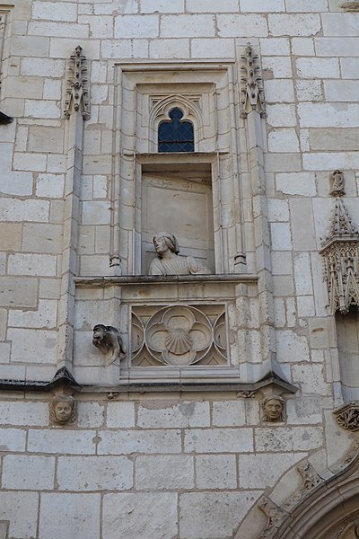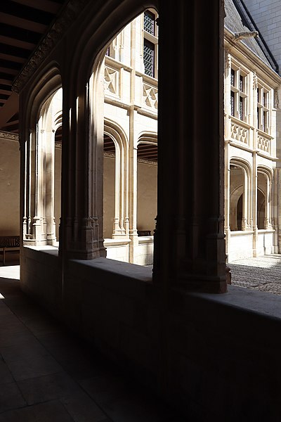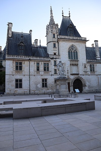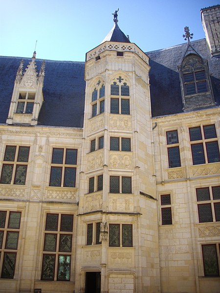 Le palais ou hôtel Jacques-Cœur, hôtel particulier gothique flamboyant de Bourges, fut construit à partir de 1443 pour Jacques Cœur, grand argentier de Charles VII. Les maîtres d'œuvre auraient été Colin Le Picart pour la maçonnerie et Jean de Blois pour la charpente ; le plafond peint de la chapelle a été restauré en 1869 par le peintre Denuelle. L'édifice, souvent cité parmi les plus somptueux de l'architecture civile du XVe siècle, est classé monument historique depuis la liste de 1840. Situé au 10 bis rue Jacques-Cœur, il occupe un flanc de coteau entre la ville haute et la ville basse et s'implante entre la rue des Arènes en contrebas et la rue Jacques-Cœur en limite supérieure, près du palais royal disparu, des marchés et de la cathédrale. Fils d'un marchand né vers 1400, Jacques Cœur fit fortune dans le négoce méditerranéen et fut anobli en 1441 avant de devenir grand argentier et maître des monnaies. En 1443 il acheta le fief de la Chaussée, une parcelle d'environ 5 000 m2 appartenant à Jean Belin, et deux maisons voisines, puis fit édifier sa « Grand' Maison » pour affirmer sa richesse ; le chantier, dont le coût dépasse cent mille écus d'or, est daté parfois jusqu'en 1450 et certaines sources le mentionnent achevé en 1453. Tombé en disgrâce en 1451, Jacques Cœur fut emprisonné et sa demeure confisquée par Charles VII ; il n'y aurait séjourné que huit nuits, s'évade et meurt à Chios en 1456. Le roi rendit la maison aux fils de Jacques Cœur en 1457 ; elle passa ensuite à divers propriétaires, vendue en 1501 à Antoine Turpin puis cédée en 1552 à Claude de L'Aubespine. Par décret judiciaire, l'édifice fut adjugé au ministre Colbert en 1679, puis rétrocédé à la municipalité en 1682 qui y installa des services administratifs et judiciaires, donnant au lieu le nom de palais. La Révolution entraîna la mutilation de bas-reliefs, notamment la statue équestre de Charles VII qui surmontait le porche et fut martelée en 1792. L'installation des juridictions au XIXe siècle provoqua de lourdes mutilations intérieures : ouverture de fenêtres, division des galeries et de la chapelle, destruction de sculptures et de cheminées, dont la cheminée monumentale lors de l'aménagement de la salle des Festins en salle d'audience. Prosper Mérimée signala ces atteintes dès 1837 et le classement de 1840 ouvrit la voie à des campagnes de restauration après la vente de la ville à l'État en 1858. Des travaux menés sous la direction d'Auguste Bailly puis de Paul Boeswillwald se succédèrent jusqu'en 1885, comprenant une importante réfection des façades mais comportant aussi des erreurs, parmi lesquelles la suppression de la toiture conique du donjon ouest. Un portail dessiné par Eugène Viollet‑le‑Duc date d'environ 1856. Après la revente au ministère puis l'acquisition complète par l'État en 1923, une restauration fondée sur des bases historiques fut conduite de 1927 à 1937 par Henri Huignard et Robert Gauchery, et le palais est aujourd'hui géré et ouvert au public par le Centre des monuments nationaux. Une campagne de nettoyage des façades eut lieu en 1999 et les parties extérieures ont été reprises autour des années 2010. Le bâtiment s'organise autour d'une cour intérieure et comprend un donjon, trois cours, une chapelle, huit escaliers à vis extérieurs, un pigeonnier sous les combles et des galeries ouvertes à arcades en anse de panier sur trois côtés de la cour. Les espaces mêlent pièces privées — comme la chambre des Galées et la salle du Trésor — et espaces publics ou utilitaires : la salle des Festins, offices, cuisines, étuves, vestiaires et des salles de réception destinées aux réunions et banquets. L'élévation du corps principal s'étage sur trois niveaux, joue sur un quadrillage de verticales et d'horizontales et se termine par des lucarnes imposantes logées dans la toiture ; la façade ouest, richement ornée, porte une corniche de choux frisés, une balustrade décorée des cœurs et coquilles armes de Jacques Cœur, et une double porte centrale sous un pavillon rectangulaire. La façade arrière s'appuie sur l'enceinte gallo‑romaine d'Avaricum, dont elle incorpore trois tours et suit le tracé courbe du rempart. La chapelle, située au-dessus de l'entrée, présente au tympan une fleur de lys flanquée de deux cœurs en hommage au roi. Les galeries, chauffées par plusieurs cheminées monumentales, abritent des décors sculptés narratifs, comme la cheminée dite « Les jeux de la guerre » représentant le siège d'un château et une autre, « Les loisirs de la noblesse », ornée de frises et d'arcatures aveugles. La salle des Festins conserve une cheminée monumentale, une tribune pour musiciens et un garde-corps sculpté aux emblèmes de Jacques Cœur et à sa devise, tandis que la salle d'apparat à l'étage est couverte par un plafond soutenu par trois grosses poutres. On note par ailleurs des installations techniques d'époque, notamment des étuves à hypocauste, et des vitraux d'origine dans la « Chambre des Galées ». Des interprétations ésotériques ont associé le palais à l'alchimie, mais ces hypothèses restent discutées par les historiens. Le palais a inspiré des œuvres et des écrivains ; Jean‑Christophe Rufin a notamment évoqué son admiration pour le lieu dans Le Grand Cœur.