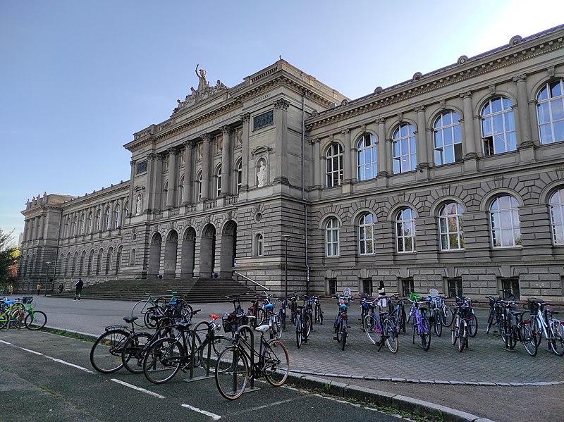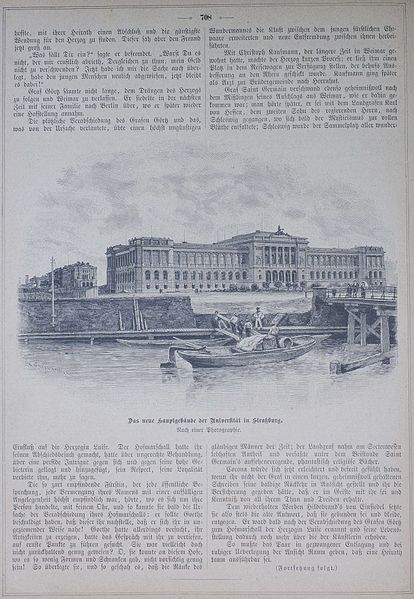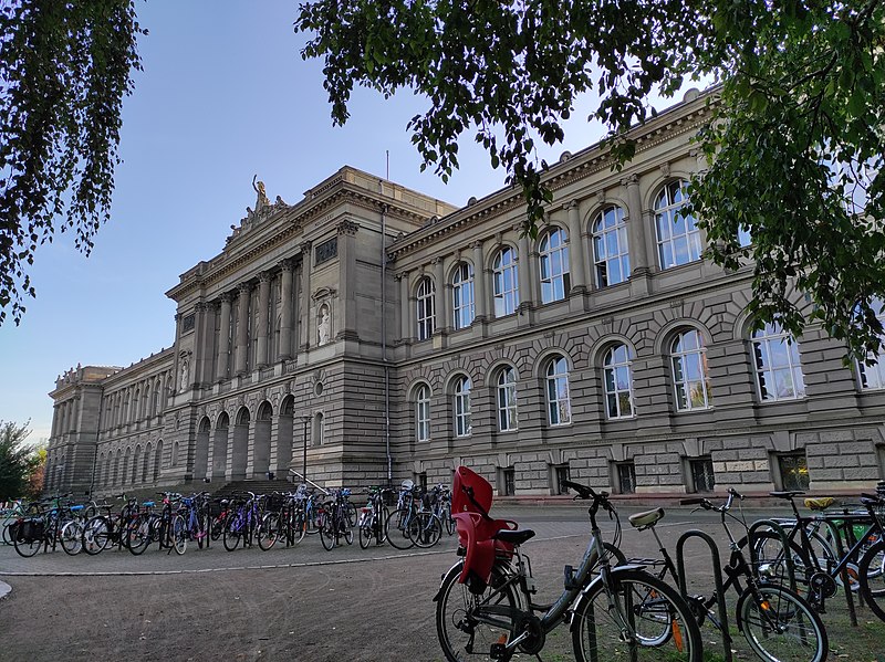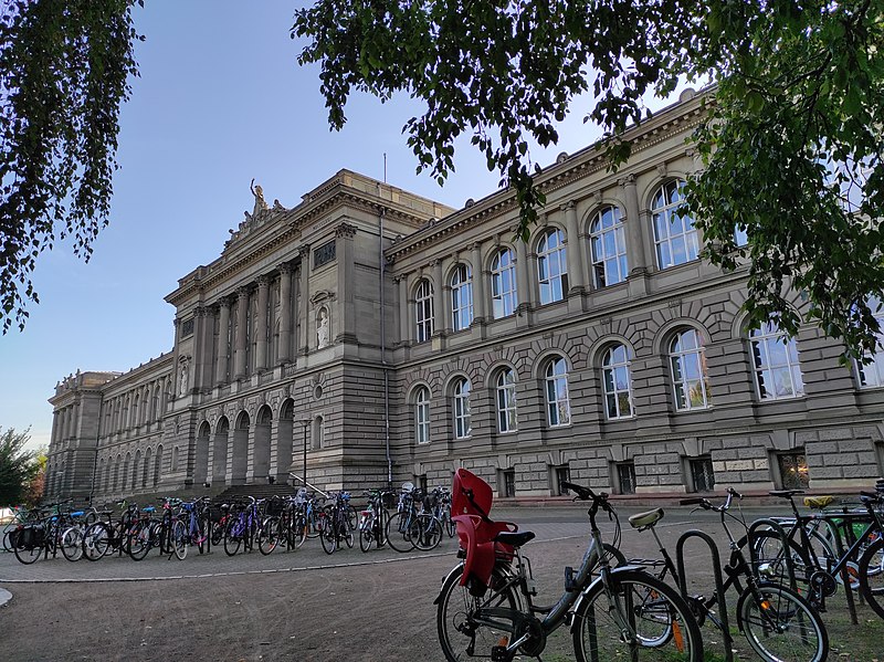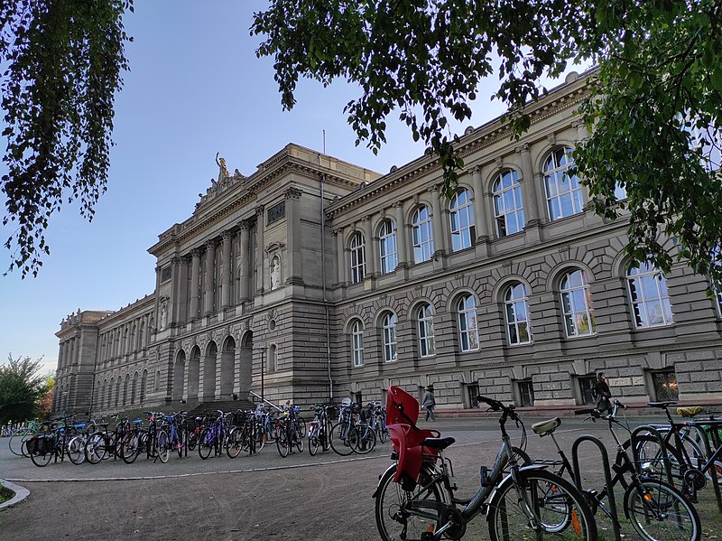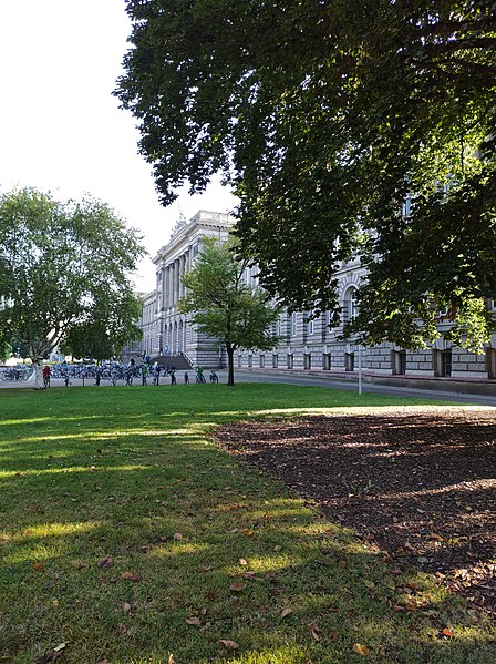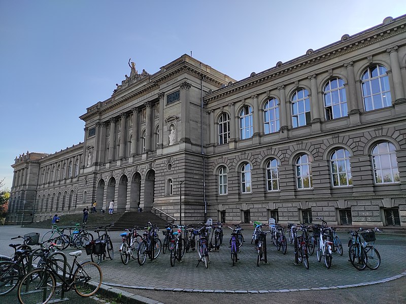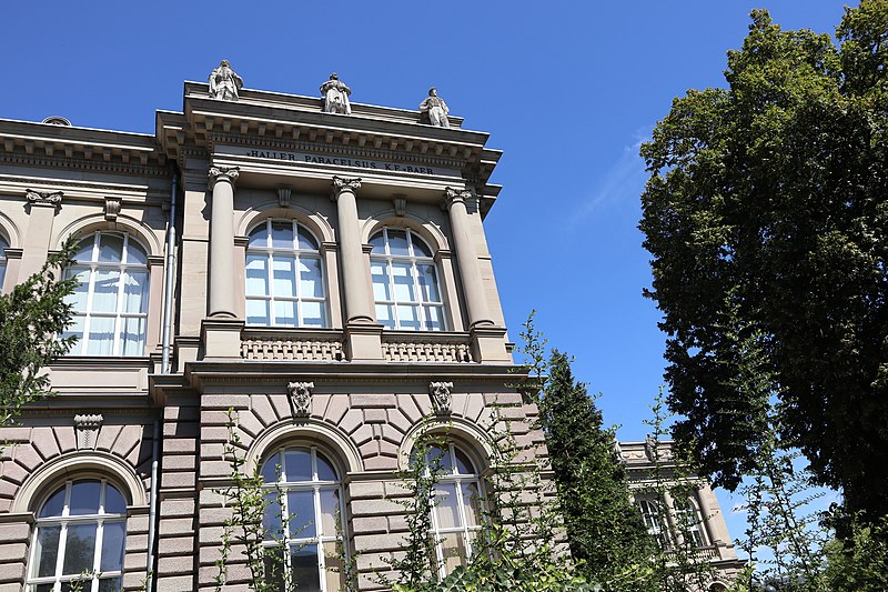 Sur le plan architectural, Otto Warth s’inspira de la Renaissance italienne ; les façades évoquent le palais Pompéi de Vérone de Michele Sanmicheli. Les six pavillons d’angle sont ornés de trente‑six statues en pied représentant des savants et érudits de la Renaissance au XIXe siècle, majoritairement d’origine germanique à l’exception de Calvin. L’avant‑corps central, qui englobe cinq portails surmontés de grandes baies, est coiffé d’un groupe sculptural allégorique avec Athéna, l’Esprit et la Nature, et la balustrade porte l’inscription LITTERIS ET PATRIAE.