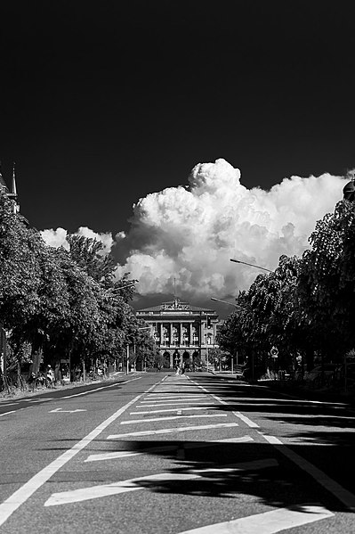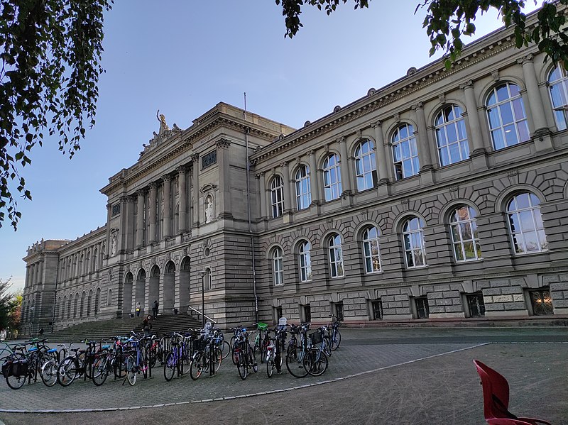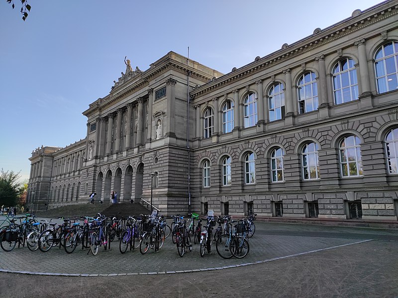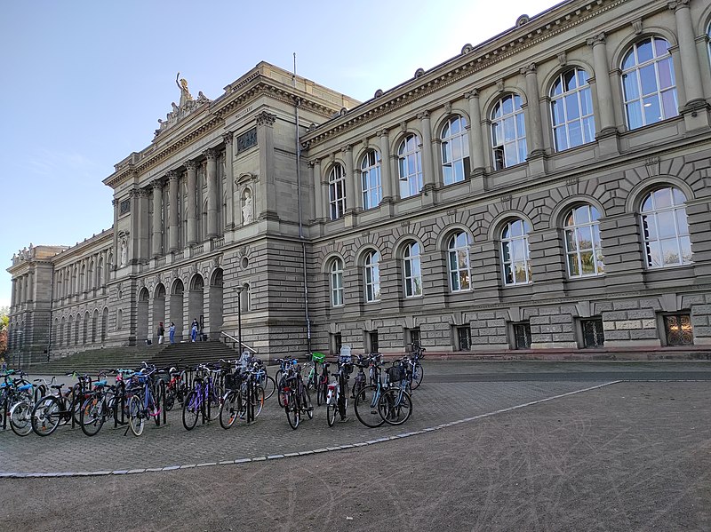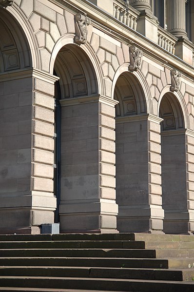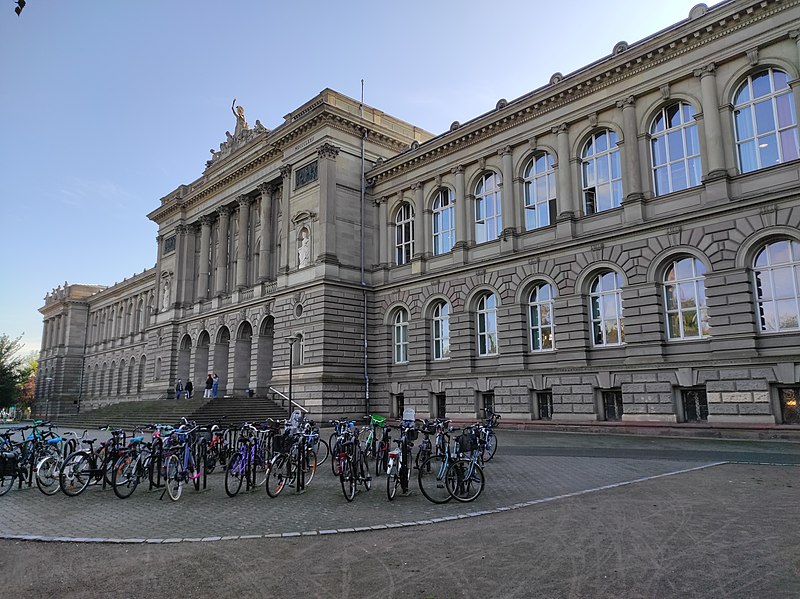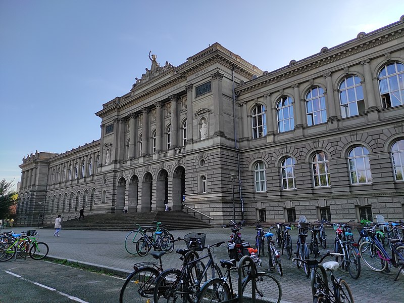 Sur le plan architectural, Otto Warth s’inspira de la Renaissance italienne ; les façades évoquent le palais Pompéi de Vérone de Michele Sanmicheli. Les six pavillons d’angle sont ornés de trente‑six statues en pied représentant des savants et érudits de la Renaissance au XIXe siècle, majoritairement d’origine germanique à l’exception de Calvin. L’avant‑corps central, qui englobe cinq portails surmontés de grandes baies, est coiffé d’un groupe sculptural allégorique avec Athéna, l’Esprit et la Nature, et la balustrade porte l’inscription LITTERIS ET PATRIAE.