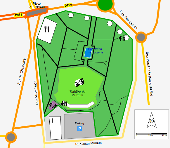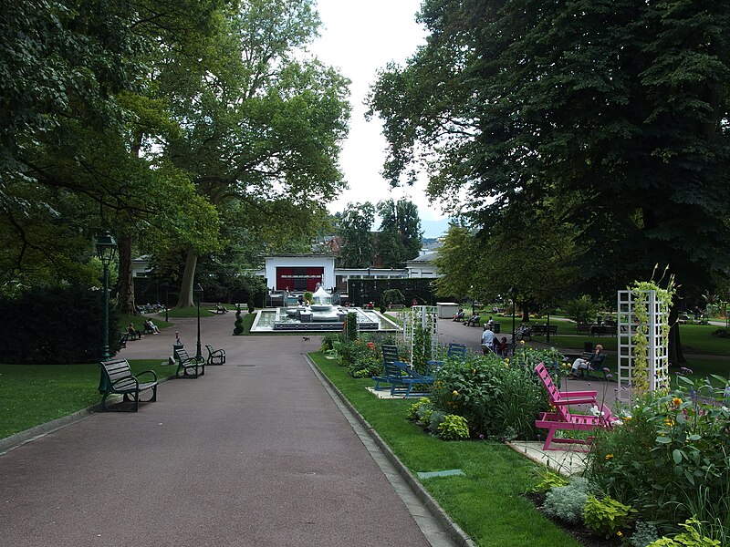 Le parc thermal d'Aix-les-Bains, appelé aussi parc floral des thermes ou théâtre de verdure, est un espace vert situé au cœur de la ville, à proximité de la mairie, de l'office du tourisme, des anciens thermes nationaux et de la vieille‑ville. Il comprend des arbres centenaires et un fleurissement saisonnier, ainsi qu'un théâtre de verdure utilisé pour des manifestations en plein air. Le clos du marquis de Seyssel est mis à la disposition des curistes dès 1958; l'État acquiert le domaine en 1865 pour créer un parc public et rétrocède le château et ses dépendances à la commune. Annexé à l'établissement thermal, le parc est aménagé par Samuel Revel en parc paysager avec allées et chambres vertes. La composition est remaniée en 1933 par Charles Bouhana lors de la construction du nouvel établissement thermal par Pétriaux en 1932. À cette époque, l'établissement thermal loue le parc à la commune, qui y transfère deux kiosques buvette et des kiosques de vente de fleurs, et construit un promenoir adjacent ainsi qu'un bâtiment à usage de café. La nouvelle composition, influencée par l'Art déco, découpe l'espace en nombreuses pelouses géométriques et s'organise autour de trois allées rectilignes longitudinales. La large allée centrale, ornée de massifs fleuris rectangulaires et d'un bassin agrémenté d'un jet d'eau, conduit au promenoir. Un théâtre de verdure est aménagé en 1953; il offre une capacité de trois mille places et accueille thés dansants, concerts estivaux et le « Before » du festival Musilac. En 2005, une fontaine marocaine, réalisée par des artisans marocains en mémoire des accords sur l'indépendance du Maroc négociés à Aix‑les‑Bains en 1956, remplace un ancien bassin; en 2016 la ville y a accueilli un village marocain à l'occasion des « Journées franco‑marocaines Auvergne‑Rhône‑Alpes ». Au fil des saisons, le parc propose un fleurissement thématique conçu chaque été par le service des parcs et jardins. La végétation comprend des essences variées, notamment cèdres, tilleuls et platanes qui assurent l'ombrage. La ville, labellisée quatre fleurs et titulaire de la Fleur d'Or au concours des villes et villages fleuris, privilégie des espèces demandant moins d'eau et n'utilise ni pesticide ni herbicide dans l'entretien du parc. Durant la dernière décennie, d'importants travaux de réfection des circulations, du système d'éclairage et d'installation d'un arrosage automatique ont été réalisés. Ces aménagements traduisent une évolution du parc vers un usage public traditionnel, au détriment de son identité première de promenade liée à la ville des eaux. Le parc est inscrit au titre des monuments historiques depuis le 23 avril 2008. Il constitue un atout touristique majeur pour la station thermale et connaît une fréquentation régulière, particulièrement en été. L'accès principal se fait depuis la route départementale 913; la circulation y est réservée au service des parcs et jardins. La gare d'Aix‑les‑Bains‑Le Revard se trouve à environ 400 mètres et des arrêts de bus CALB desservent l'entrée principale; deux parkings se situent à proximité.