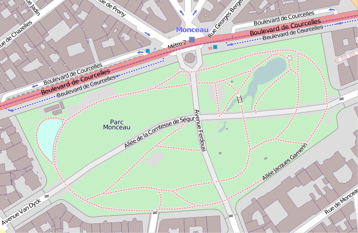 Le parc Monceau doit son origine à la folie du duc de Chartres : en 1769 Colignon y aménage un pavillon octogonal entouré d'un jardin à la française, puis en 1773 Carmontelle y installe diverses fabriques pour créer un « pays d'illusions ». Entre 1773 et 1779 le domaine est transformé en jardin anglo-chinois plus vaste, jalonné de fabriques — ferme suisse, moulins hollandais, pagode, pyramide, ruines féodales, temple romain — ainsi que d'une rivière et d'un grand bassin destiné à des spectacles nautiques. À partir de 1781 Thomas Blaikie prend en charge l'aménagement des terrains acquis au nord et à l'est et module le site dans le sens d'un jardin à l'anglaise. En 1787 une partie du terrain est prélevée pour permettre à Ledoux d'ériger la rotonde de la barrière de Chartres, pavillon d'octroi à péristyle. Confisqué à la Révolution, le jardin devient bien national en 1793 ; c'est en ce lieu qu'André-Jacques Garnerin réalise le premier saut en parachute depuis une montgolfière en 1797. Restitué ensuite à la famille d'Orléans, le parc voit la folie démolie entre 1802 et 1806 et remplacée par un nouveau pavillon, tandis que des travaux resserrent son plan. Sous le Second Empire, le percement du boulevard Malesherbes et l'expropriation de 1860 réduisent l'emprise du domaine ; la Ville de Paris conserve une partie du parc et confie à Adolphe Alphand son réaménagement, avec Gabriel Davioud chargé des entrées monumentales et de leurs grilles. Le nouvel aménagement conserve des éléments des fabriques anciennes et y associe des aménagements paysagers — rivière, pont, cascade, grotte — dont les premières stalactites en ciment artificiel sont dues à l'entrepreneur Combaz. Le reste du terrain est revendu aux frères Pereire, qui lotissent et font édifier de grands hôtels particuliers ouvrant sur le parc. Pendant la Semaine sanglante de la Commune de Paris, des pelotons d'exécution sont installés dans l'enceinte du parc. Une arcade de style Renaissance, vestige de l'hôtel de ville incendié en 1871, est ensuite installée dans le parc. À la fin du XIXe siècle des statues honorant écrivains et musiciens sont placées sur les pelouses, rappelant l'importance du lieu pour les artistes et les habitants du quartier. En 1896 le tsar Nicolas II traverse le parc lors d'une visite en France ; plus tard, l'ancien terminus en boucle de la ligne 3, abandonné en 1910, est transformé en centre de formation de la RATP situé sous le parc. Enfin, en 1982 une lanterne japonaise est installée non loin de la pyramide pour symboliser l'amitié entre Paris et Tokyo.
