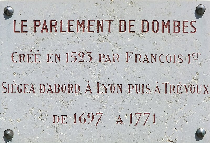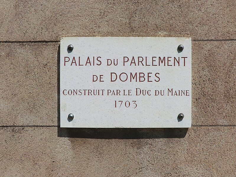 Le parlement de Dombes, créé par François Ier en 1523, siégeait d'abord à Lyon. À la fin du XVIIe siècle, le duc du Maine transféra le siège à Trévoux et imposa la résidence des magistrats ; un nouveau bâtiment fut édifié hors de l'enceinte médiévale par Claude Cachet de Montézan et son fils. Les peintures de la salle d'audience, réalisées en 1698 par Pierre Paul Sevin de Tournon, forment un décor peint et mouluré ornant murs, poutres et solives, avec les armoiries de France et des portraits du duc du Maine et de parlementaires. Le parlement fut mis en service au début du XVIIIe siècle ; une deuxième campagne de travaux (1715-1724), menée par Jean Boissieux selon les plans de l'ingénieur Deville, aménagea le greffe, des salles d'archives et une chapelle bénie le 13 décembre 1724. Après le rattachement de la Dombes au royaume, la chambre judiciaire fut incorporée au parlement de Dijon en 1771 et le palais transforma son usage en Intendance. Sous le Premier Empire, le bâtiment abrita la sous-préfecture, le palais de justice et la gendarmerie ; les travaux de 1817-1824 lui adjoignirent une chapelle et un escalier d'honneur. En 1874 la chapelle fut démolie pour faire place à des bureaux. Les décors de la salle d'audience sont protégés au titre d'objets mobiliers depuis 1920 et l'ensemble de l'ancien parlement est inscrit au titre des monuments historiques depuis le 28 février 2006. Aujourd'hui, l'ancien parlement accueille le tribunal d'instance, le greffe et le service des impôts.