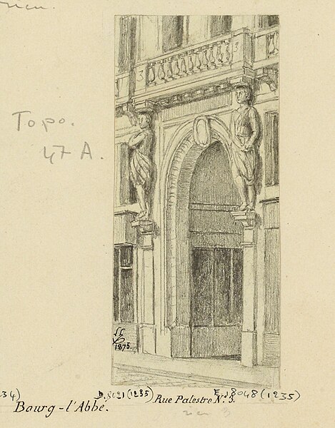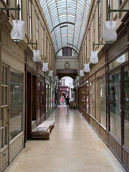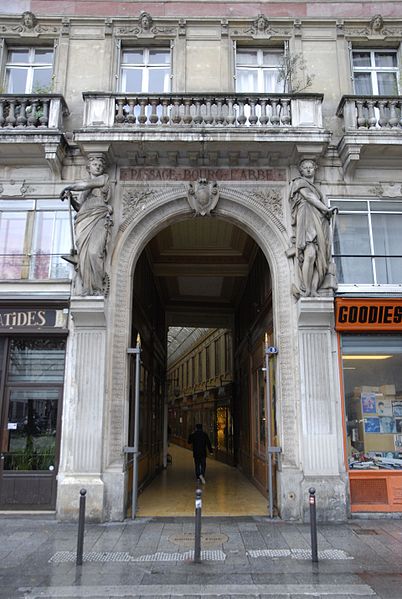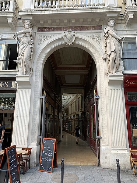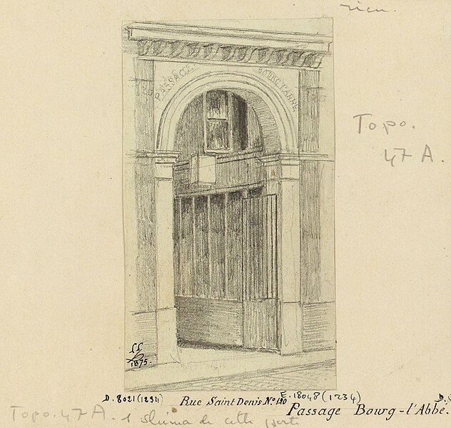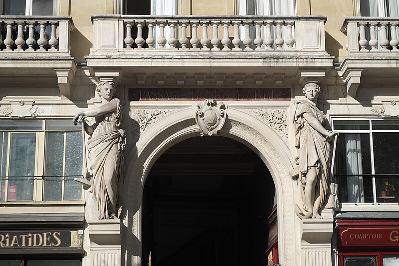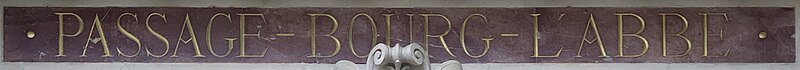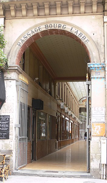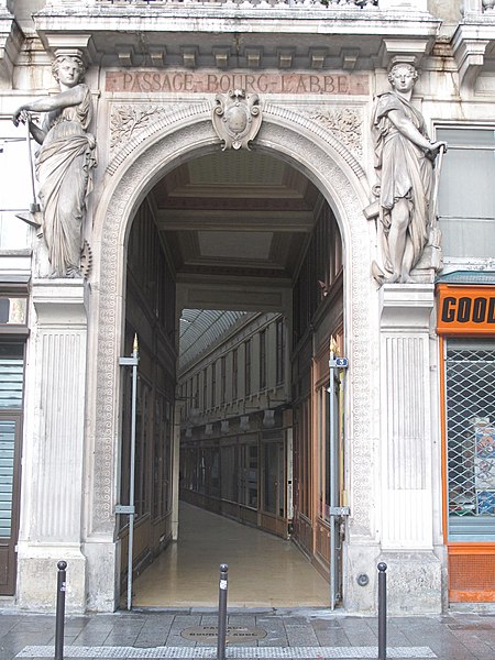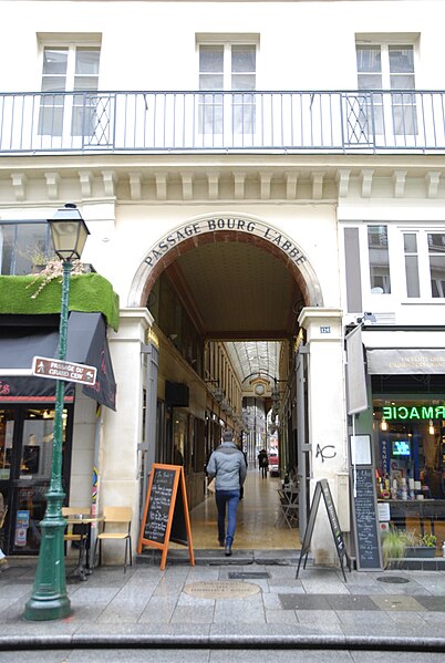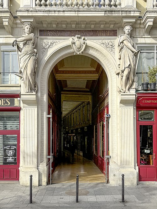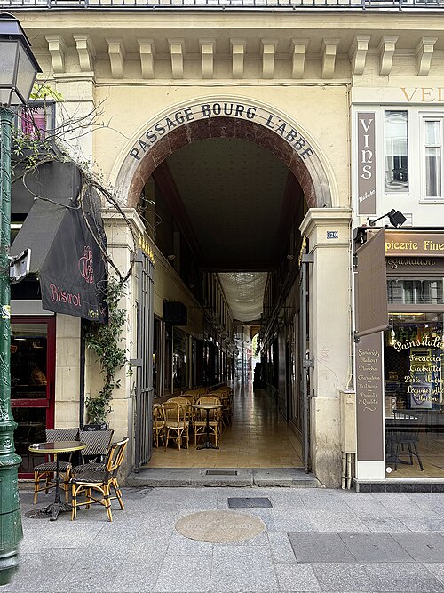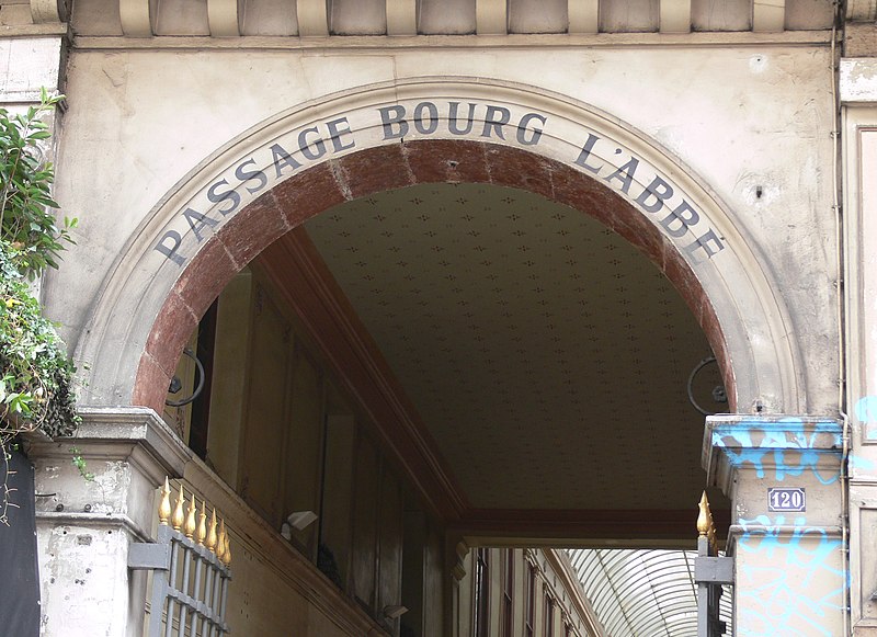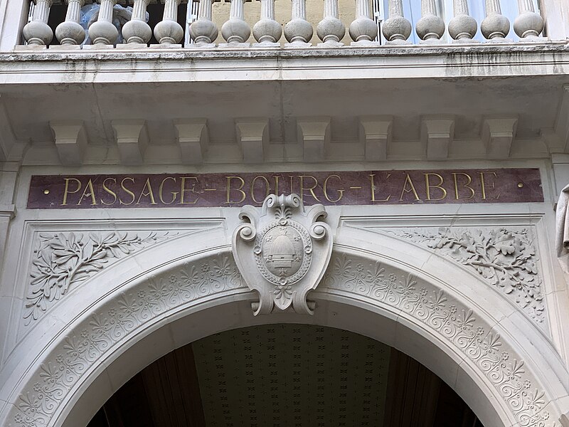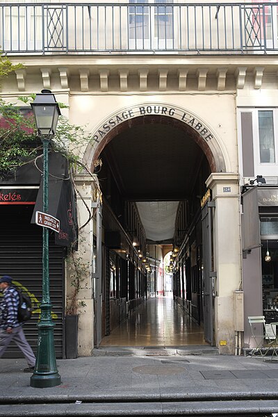 Le passage du Bourg-l'Abbé est un passage couvert du 2e arrondissement de Paris qui relie la rue Saint-Denis, à l'ouest, à la rue de Palestro, à l'est. Il a été ouvert en 1828 et construit par l'architecte Auguste Lusson. L'entrée sur la rue de Palestro, reconstruite par Henri Blondel lors du percement du boulevard Sébastopol et de la rue de Turbigo, est encadrée de deux cariatides sculptées par Aimé Millet, allégories du Commerce et de l'Industrie ; la clé de voûte de l'arcade porte une ruche, symbole d'activité économique. Côté rue Saint-Denis, l'accès est beaucoup plus simple ; le passage, court et étroit, est du même type que ceux de Choiseul et de Vendôme. L'élévation comporte des arcades sur les deux premiers niveaux, abritant boutiques et logements en entresol. Une verrière légèrement cintrée, sans ferme, couvre le passage ; elle a été refaite. À l'origine, le passage débouchait sur une rue qui portait le même nom, à ne pas confondre avec l'actuelle rue du Bourg-l'Abbé, et il avait été construit parallèlement au passage du Saucède, aujourd'hui disparu. Le passage a été amputé de plusieurs mètres lors des travaux du milieu du XIXe siècle, liés au percement de la rue de Turbigo et du boulevard de Sébastopol. Entre 1980 et 2000, il a été presque abandonné et ses boutiques ont servi d'entrepôts ; une rénovation réalisée en 2003 a permis l'installation de nouveaux commerces. Situé dans un quartier populaire et fortement transformé, de modestes proportions, il conserve néanmoins un certain cachet malgré une atmosphère plutôt calme. Il est ouvert du lundi au samedi de 7 h 30 à 19 h 30 et desservi par la ligne 4, station Étienne Marcel. Parmi les éléments remarquables figurent l'entrée orientale et un baromètre. Pour approfondir, on peut consulter les travaux de Bertrand Lemoine, Bernard Marrey et Paul Chemetov, ainsi que Nicolas Bruno Jacquet, ainsi que les ressources Mérimée et les présentations illustrées disponibles en ligne.