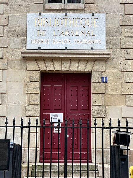 Fondé au XVIe siècle pour centraliser les dépôts de poudre et de munitions, l'Arsenal perdit progressivement sa vocation militaire au fil du temps. En 1599, Sully, nommé grand maître de l'artillerie, fit agrandir les bâtiments ; son successeur fit décorer des appartements par Quillerier, élève de Vouet. À la fin du XVIIe siècle, l'Arsenal servit de résidence à des artistes et à des savants logés par le roi. Au XVIIIe siècle, le duc du Maine fit agrandir et embellir l'ensemble sous la direction de l'architecte Germain Boffrand ; le grand logis de Sully fut conservé mais masqué par un nouveau corps de bâtiment resté partiellement inachevé. En 1757, René d'Argenson, marquis de Paulmy, administra l'Arsenal et y réunit une importante collection de livres, manuscrits et estampes. Il acquit notamment la collection du duc de La Vallière et, après une cession au comte d'Artois, les biens de l'Arsenal furent placés sous séquestre à la Révolution. Les décrets de 1792 firent du dépôt de livres un bien national ; la bibliothèque reçut alors les archives de la Bastille et d'autres fonds et fut ouverte au public le 28 avril 1797, Hubert‑Pascal Ameilhon en devenant le premier bibliothécaire. Redécouverte à partir de 1824 grâce à Charles Nodier, elle gagna en notoriété et devint un foyer intellectuel, le dépôt légal de 1841 renforçant encore ses collections. Entre 1856 et 1870, Théodore Labrouste restructura les bâtiments, notamment le pavillon d'entrée et les façades sur la rue de Sully ; une partie des constructions fut détruite par un incendie en 1871. Aux XIXe et XXe siècles, les collections se spécialisèrent en littérature et en théâtre, enrichies par des fonds et donations majeurs. En 1934 la bibliothèque fut rattachée à la Réunion des bibliothèques nationales, puis devint en 1977 un département de la Bibliothèque nationale ; le département des arts du spectacle, créé en 1976, y demeura jusqu'en 2004 avant d'être transféré au site Richelieu. La bibliothèque de l'Arsenal possède aujourd'hui plus d'un million de documents, dont environ 150 000 volumes antérieurs à 1880 (1 623 incunables), plus de 15 000 manuscrits, 100 000 estampes et 3 000 cartes et plans ; sa politique d'acquisitions privilégie la littérature française des XVIe au XIXe siècles, l'histoire du livre, la bibliophilie et l'histoire de l'Arsenal. Ses grands fonds comprennent notamment les Archives de la Bastille, des collections liées à Prosper Enfantin, Joris‑Karl Huysmans, Louis‑Sébastien Mercier, Paul Lacroix, Joséphin Péladan, José‑Maria de Heredia et Georges Douay, ainsi que des affiches, cartes et plans et une importante collection musicale principalement du XVIIIe siècle. Classée au titre des monuments historiques en 2003, la bibliothèque demeure un lieu patrimonial consacré à la conservation et à la consultation des collections.