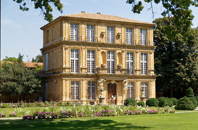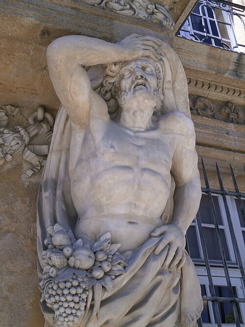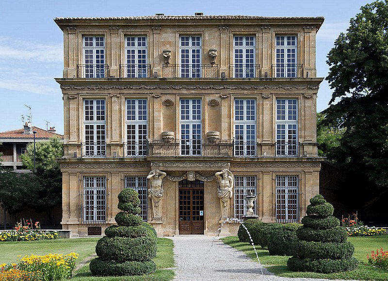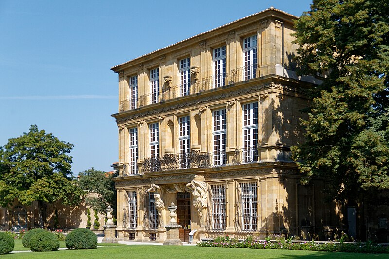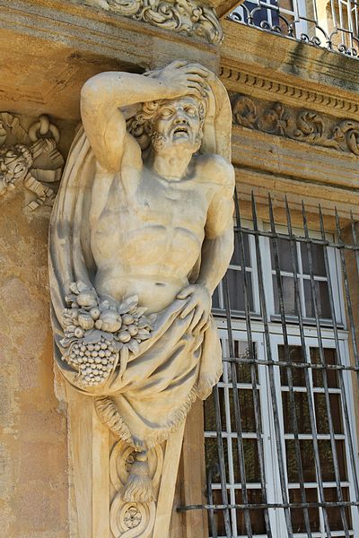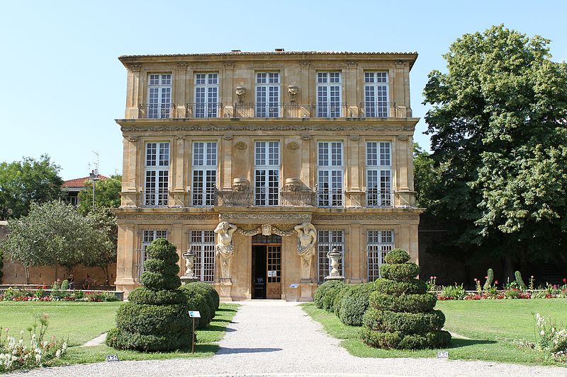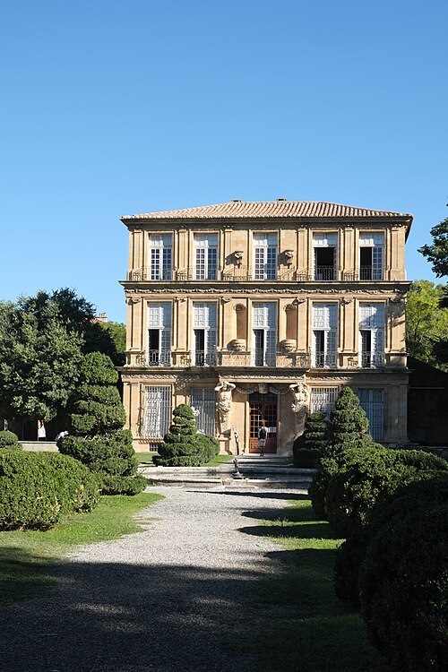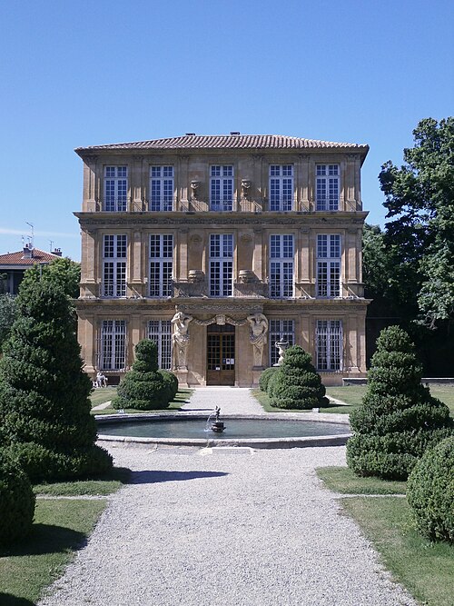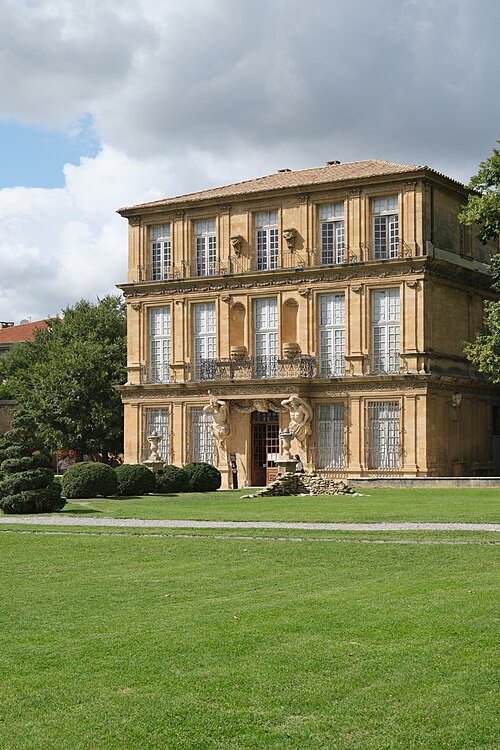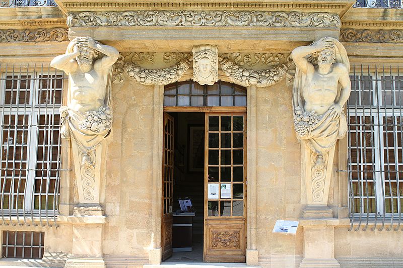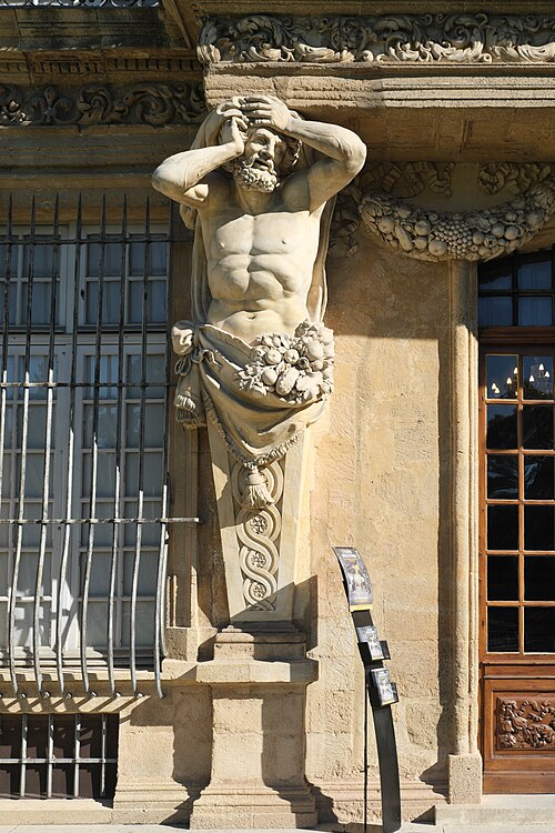 Architecturalement, l'édifice illustre un bel exemple de classicisme provençal : bâti à partir de 1665 en pierre jaunâtre des carrières de Bibémus, il présente aujourd'hui trois niveaux ordonnés par des pilastres dorique, ionique et composite, et une façade ornée de deux atlantes sculptés en pierre blanche de Calissanne qui encadrent l'entrée et soutiennent un balcon à ferronneries d'origine. Ces atlantes, attribués à Jean-Claude Rambot avec la participation de Pierre Pavillon, s'inscrivent dans un décor complété par guirlandes fruitières et un mascaron évoquant l'été; jusqu'à la Révolution, deux bustes du roi et du dauphin ornaient les consoles du deuxième étage.